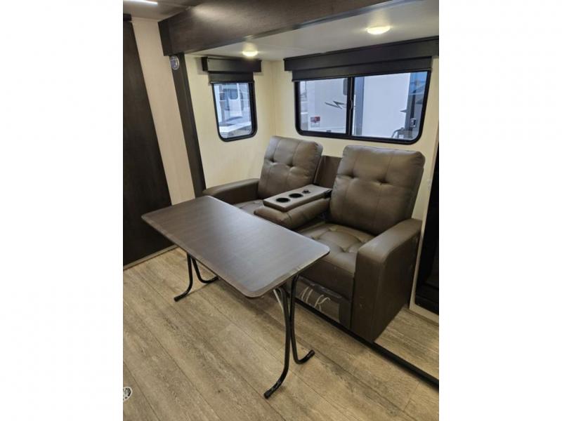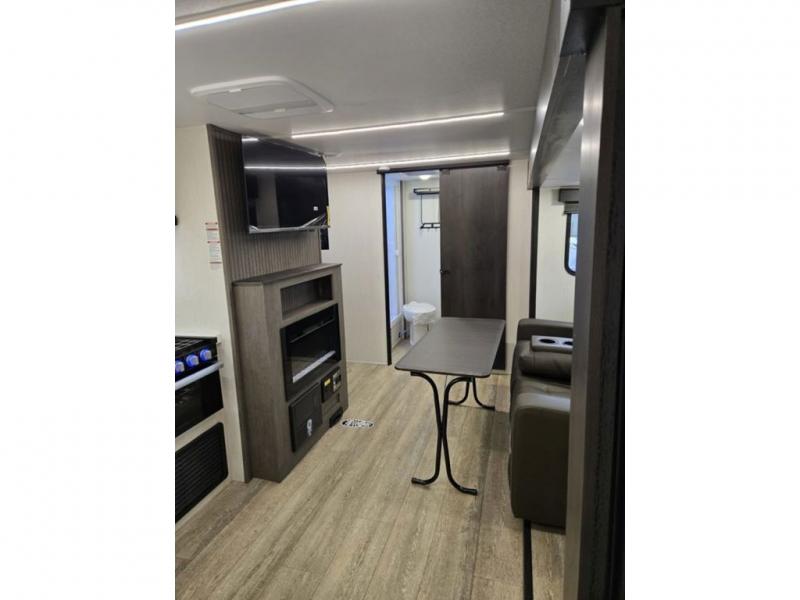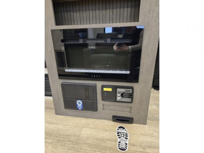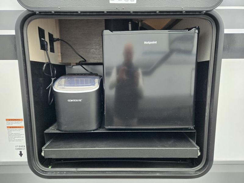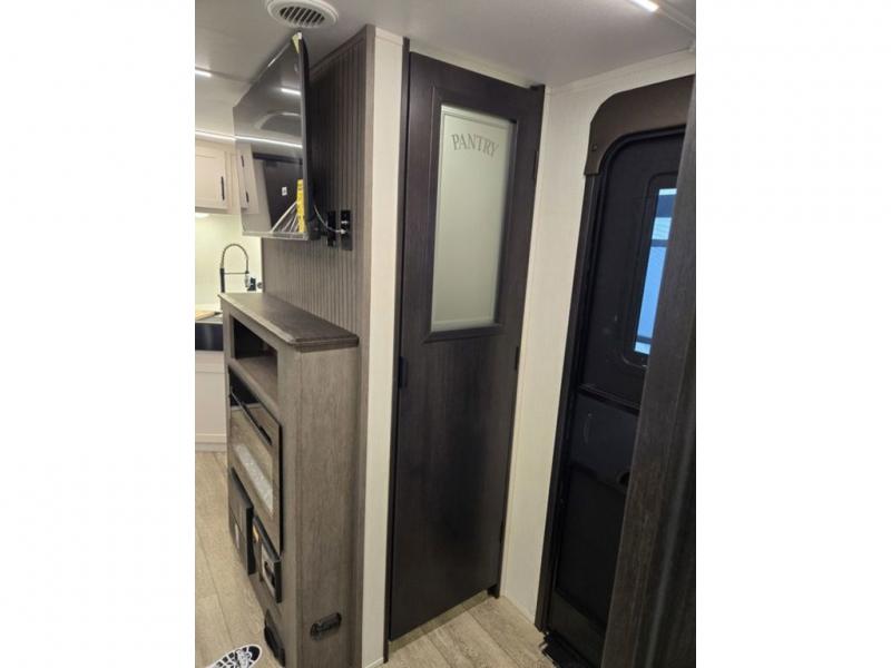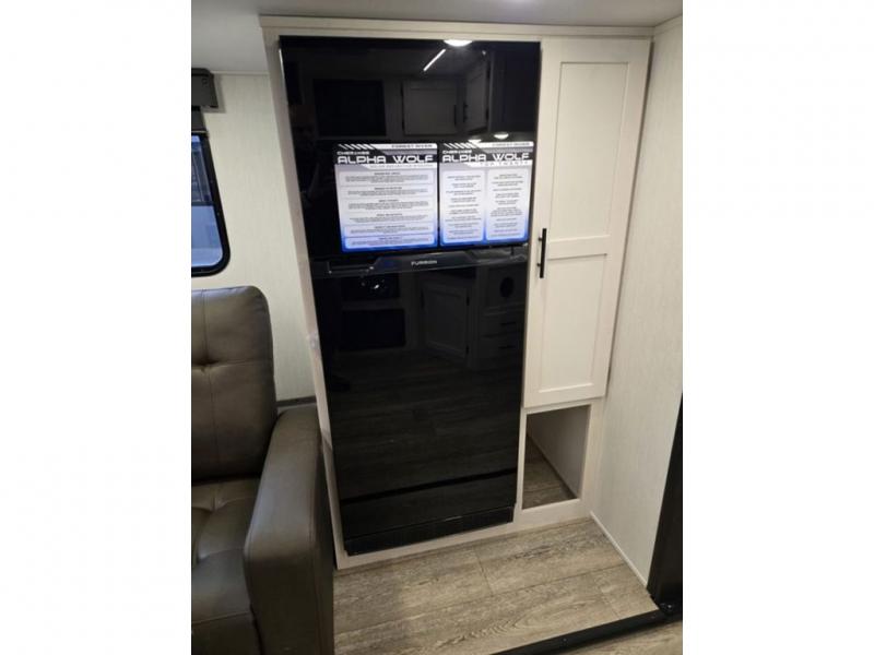 Looking for the perfect trailer for two with a spacious bathroom and bedroom? This Alpha Wolf provides a rear oversized bathroom complete with linen storage and a sliding door that saves space and looks great. The front bedroom includes a walk-around queen bed, dual wardrobes, a sliding door plus windows for natural lighting and great views. The main living and kitchen area is spacious as well with a large slide out that includes theater seating with a removable table across from the entertainment center with a fireplace, a 12V residential style refrigerator for lots of cold storage, and a pantry for your snacks and dry goods. You can decide to cook indoors on the three burner cooktop, or head outdoors to cook on the outside kitchen!