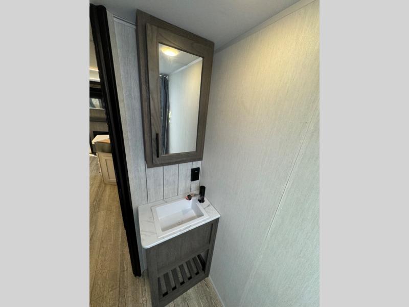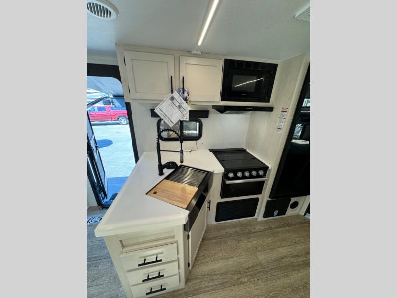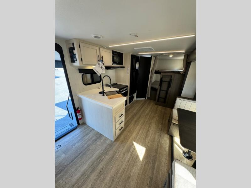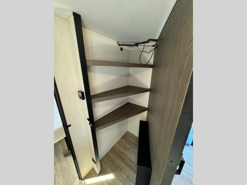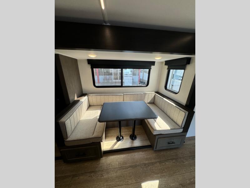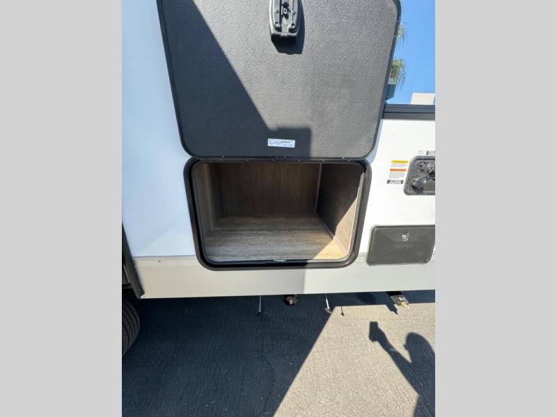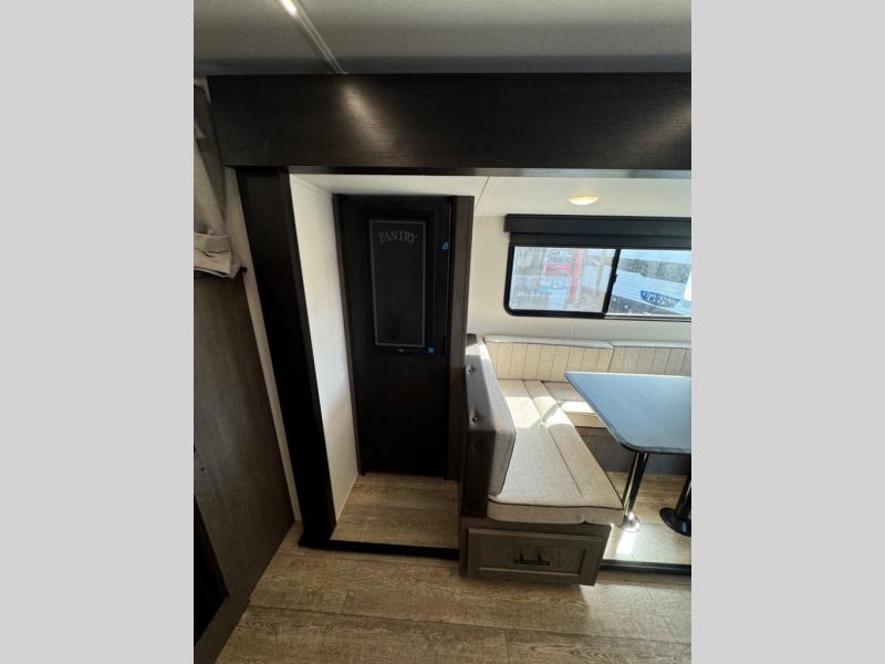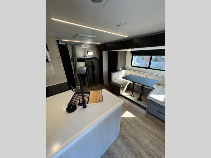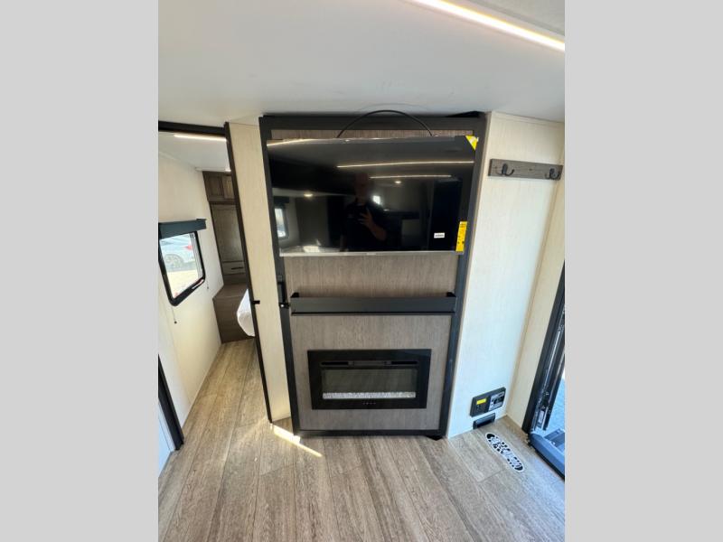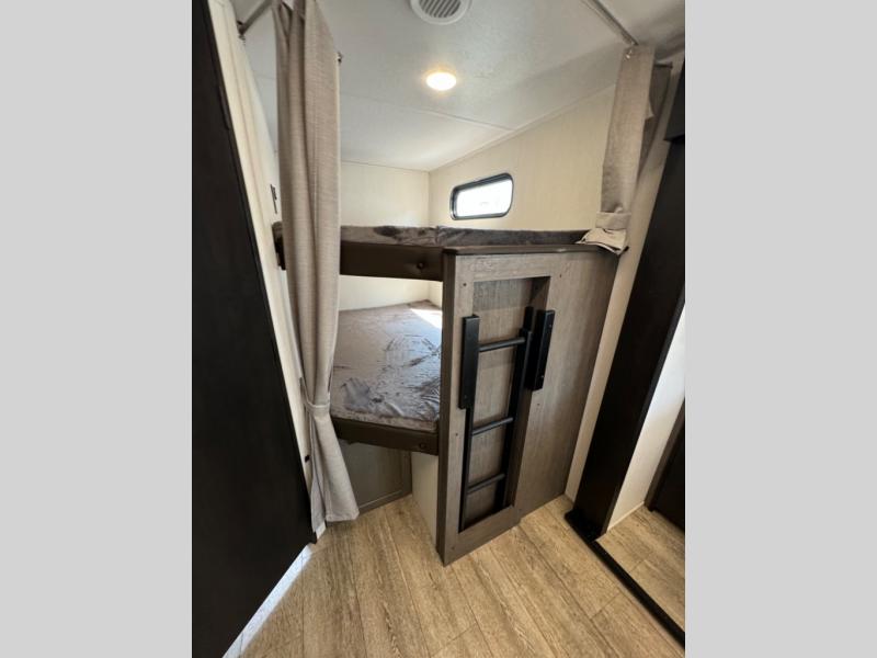 Get ready for fun with your group in this multi-sleeper trailer that offers double-size bunks with a ladder next to a full bathroom. The camp chef will appreciate an outside kitchen, and the pass-through storage will make it easy to keep things neatly tucked away when not in use. Back inside, there is a U-shaped dinette for dining, playing games and additional sleeping space as well. You will also find a hidden pantry behind the entertainment center plus full kitchen amenities. The fireplace is another highlight in the main area, and the front private bedroom will provide you with your own space at night!