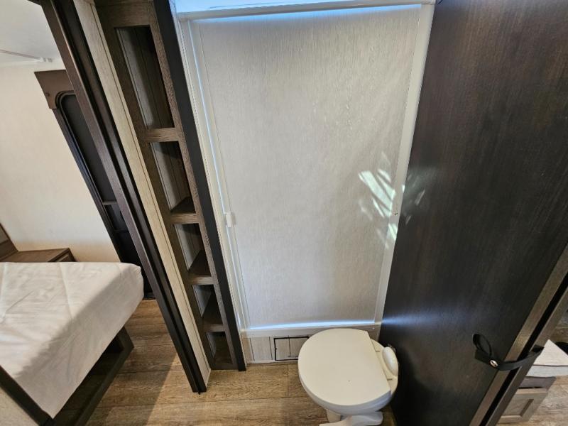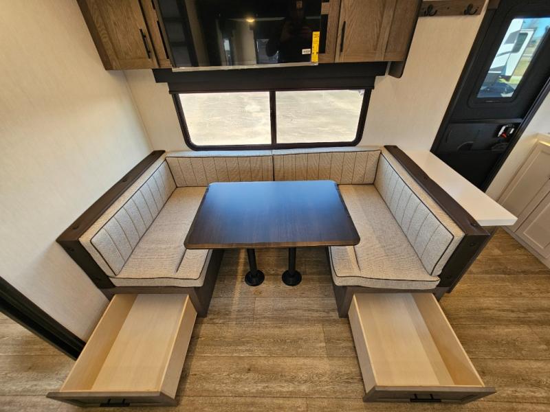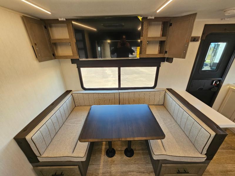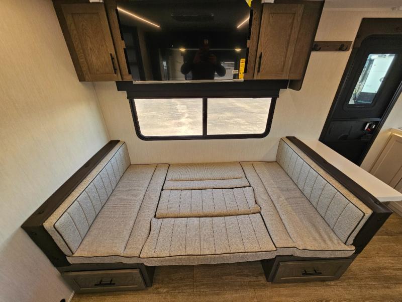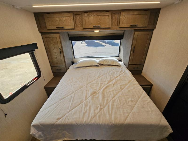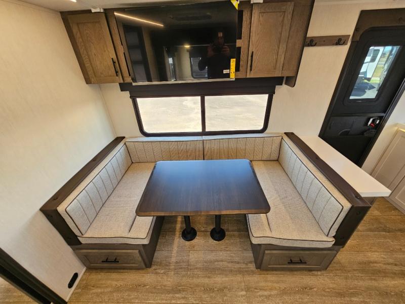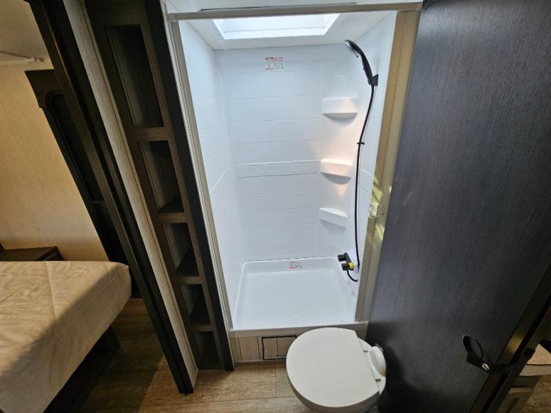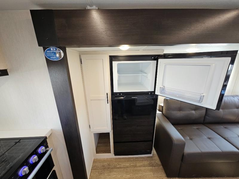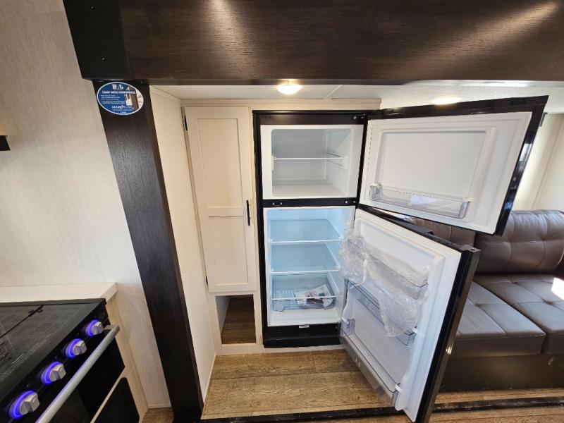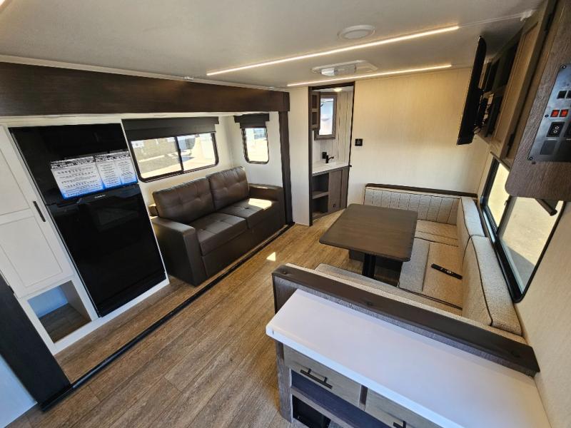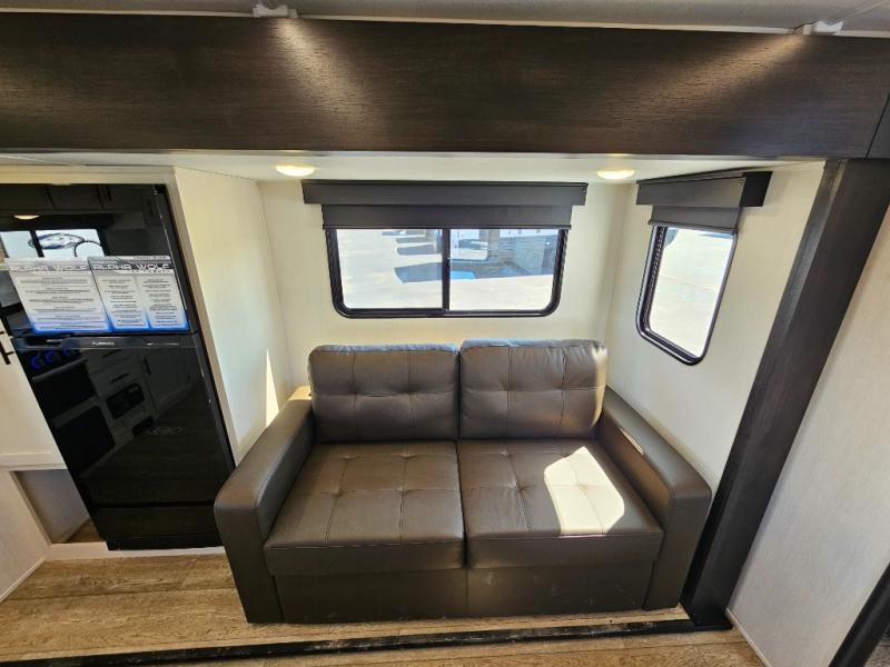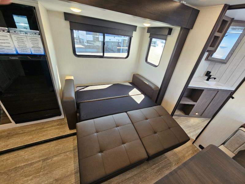 You and your spouse will have a comfortable time camping in this travel trailer! The front private bedroom has a queen bed with wardrobes on either side of it, plus one of the dual entry doors to the unit. As you leave the bedroom, you will enter the walk-through bathroom which has a shower with a skylight above for more head space and natural lighting. The chef can prepare their best home cooked meals in the rear kitchen, and you can enjoy them around the U-shaped dinette before storing any leftovers in the 12V refrigerator. And the tri-fold sofa within the large slide out will provide additional seating and sleeping space!