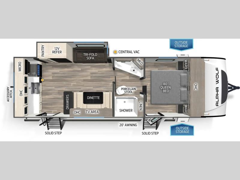 With any Cherokee Alpha Wolf travel trailer by Forest River you'll enjoy outstanding amenities, quality construction, and an affordable price. Each model features a "ToughBend" rigid skirt metal design, 5/8" tongue and groove plywood floor decking, and a "SuperTruss" roof structure that will hold up through years of camping memories. There is a pet friendly "clean sweep" floor design with no heat vents indoors, along with a super lumen lighting system, a 15,000 BTU quick cool central air conditioning, and many more comforts. There are many convenient exterior features such as, Leash Latch pet safety technology, an outside shower with hot and cold water, On The Go rear ladder prep, and exterior steps with oversized landing and quick release. The Weather Guard Package will add protection against the elements with an armored underbelly tank enclosure and forced air heat, thermo-control reflective safety glass windows, and upgraded laminated walls with block foam insulation!