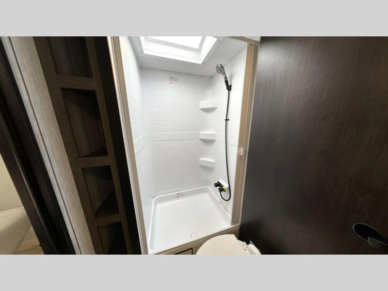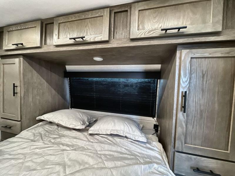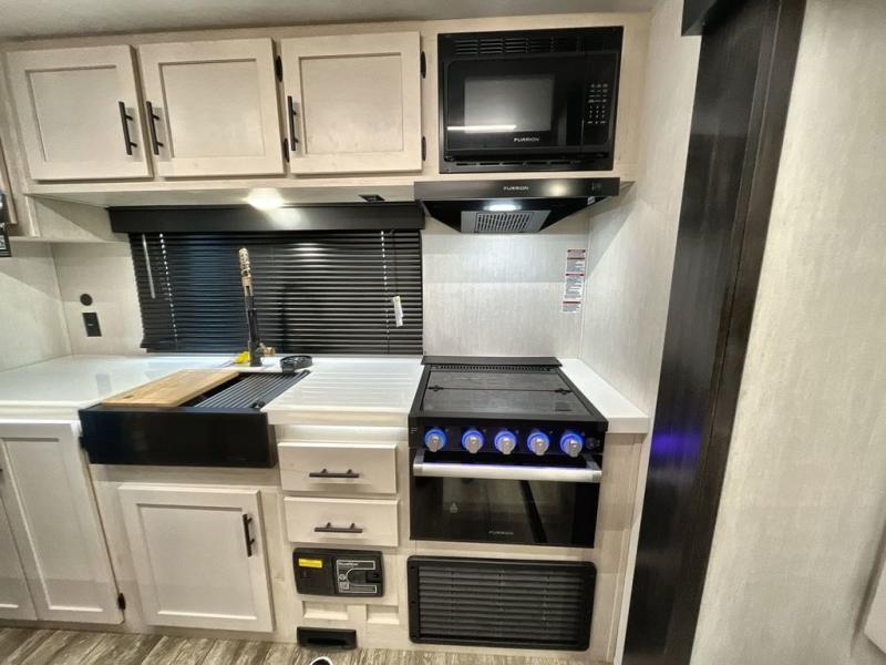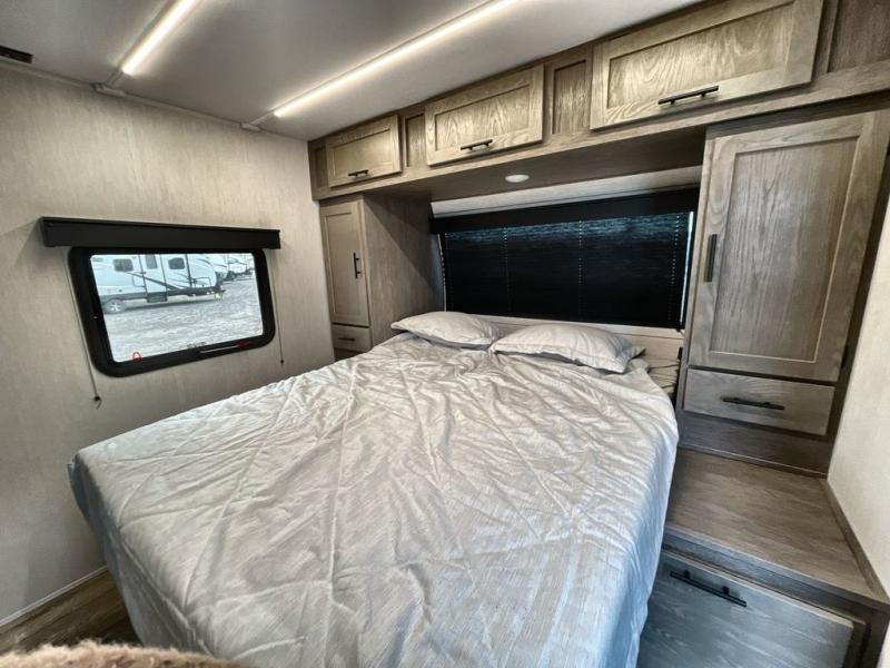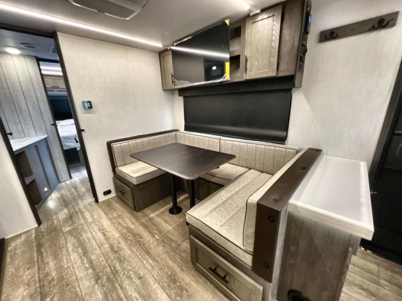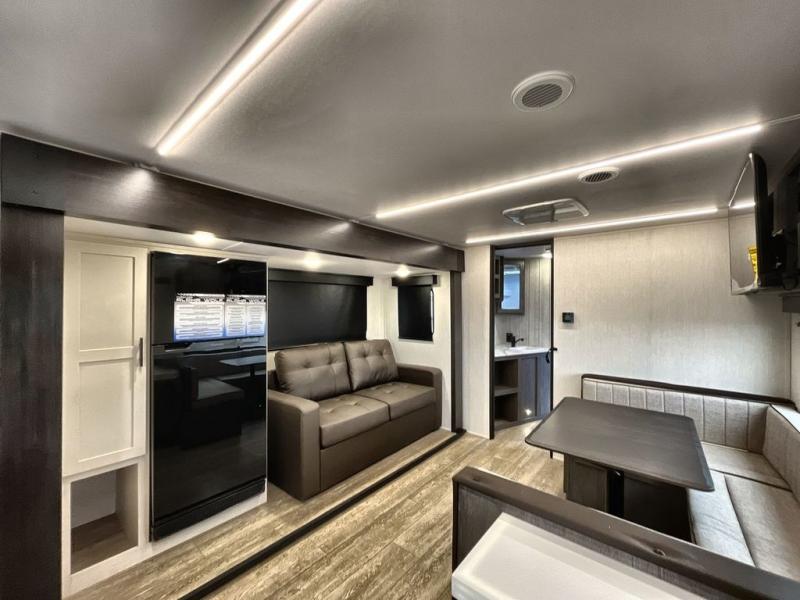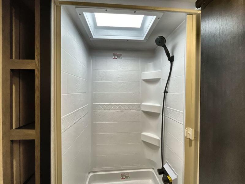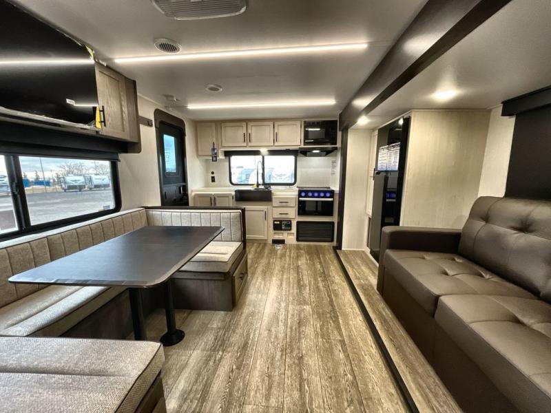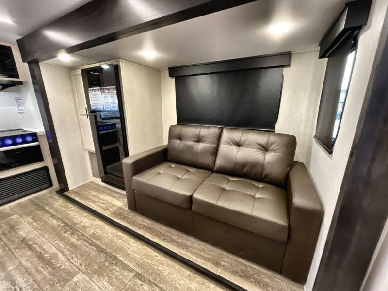 You and your spouse will have a comfortable time camping in this travel trailer! The front private bedroom has a queen bed with wardrobes on either side of it, plus one of the dual entry doors to the unit. As you leave the bedroom, you will enter the walk-through bathroom which has a shower with a skylight above for more head space and natural lighting. The chef can prepare their best home cooked meals in the rear kitchen, and you can enjoy them around the U-shaped dinette before storing any leftovers in the 12V refrigerator. And the tri-fold sofa within the large slide out will provide additional seating and sleeping space!