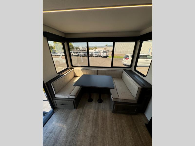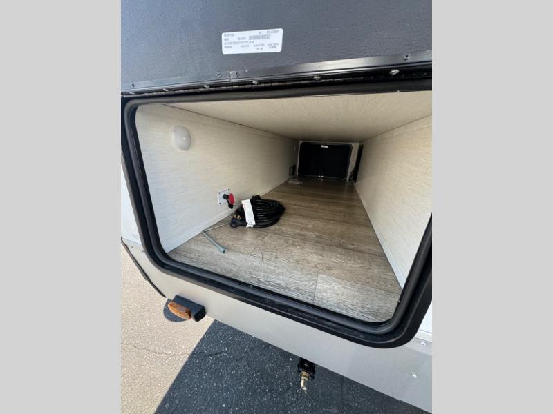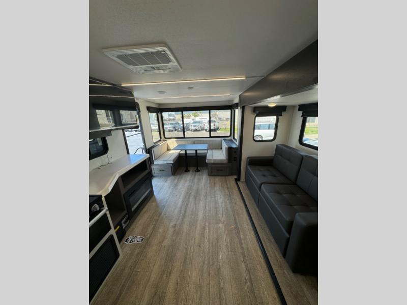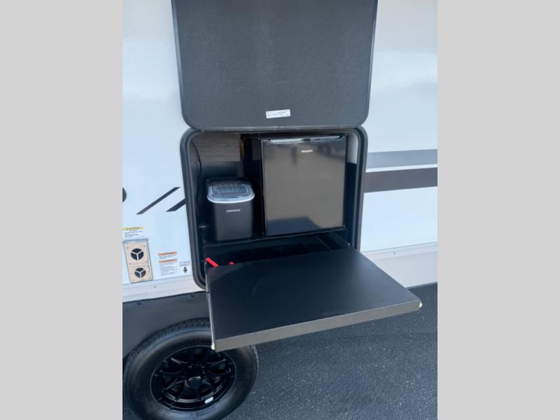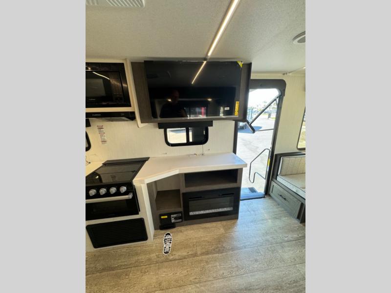 You will love all that this travel trailer has to offer! The rear living area includes a U-shaped dinette with a rear Pano-Vision window plus a tri-fold sofa across from the entertainment center with a fireplace. The kitchen has everything needed for food prep and serving, and the outside kitchen with ice and a refrigerator will be a favorite as well. The 20' awning will provide an outdoor living area; just grab your camping chairs from the outside storage areas. When you want to call it a night, fall quickly to sleep on the queen bed in the front bedroom with easy access to the walk-through bathroom, plus the bedroom has one of the dual entry doors to the unit.