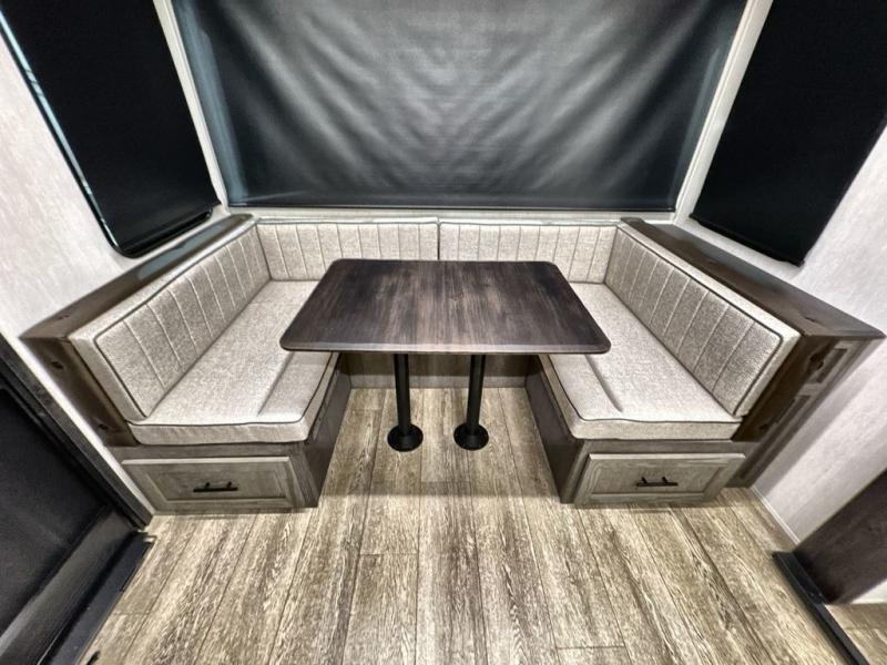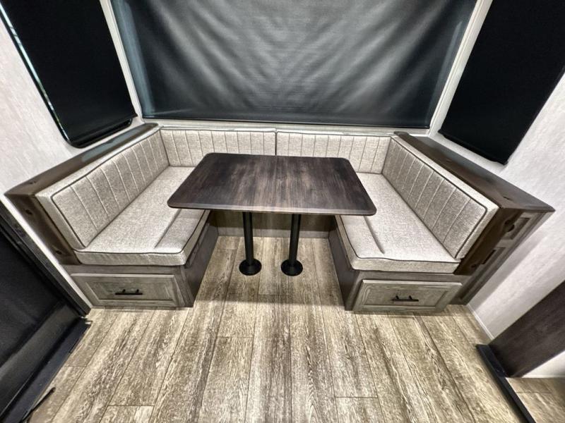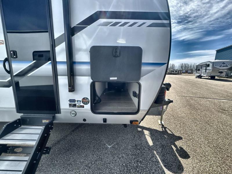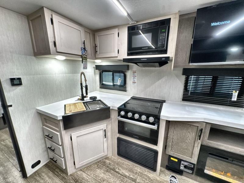 You will love all that this travel trailer has to offer! The rear living area includes a U-shaped dinette with a rear Pano-Vision window plus a tri-fold sofa across from the entertainment center with a fireplace. The kitchen has everything needed for food prep and serving, and the outside kitchen with ice and a refrigerator will be a favorite as well. The 20' awning will provide an outdoor living area; just grab your camping chairs from the outside storage areas. When you want to call it a night, fall quickly to sleep on the queen bed in the front bedroom with easy access to the walk-through bathroom, plus the bedroom has one of the dual entry doors to the unit.