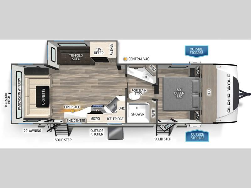 With any Cherokee Alpha Wolf travel trailer by Forest River you'll enjoy outstanding amenities, quality construction, and an affordable price. Each model features a "ToughBend" rigid skirt metal design, 5/8" tongue and groove plywood floor decking, and a "SuperTruss" roof structure that will hold up through years of camping memories. There is a pet friendly "clean sweep" floor design with no heat vents indoors, along with a super lumen lighting system, a 15,000 BTU quick cool central air conditioning, and many more comforts. There are many convenient exterior features such as, Leash Latch pet safety technology, an outside shower with hot and cold water, On The Go rear ladder prep, and exterior steps with oversized landing and quick release. The Weather Guard Package will add protection against the elements with an armored underbelly tank enclosure and forced air heat, thermo-control reflective safety glass windows, and upgraded laminated walls with block foam insulation!