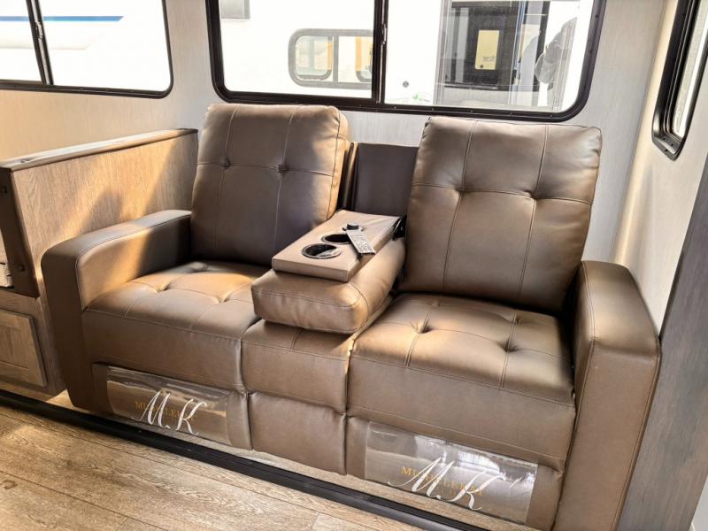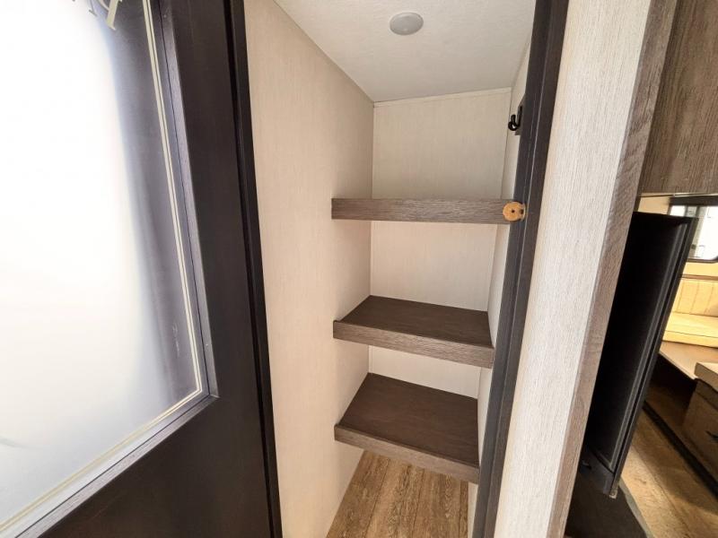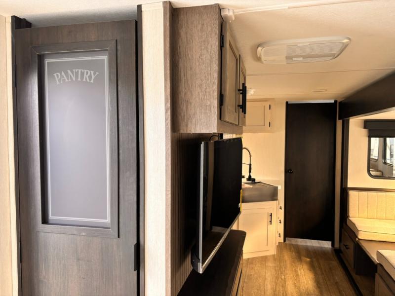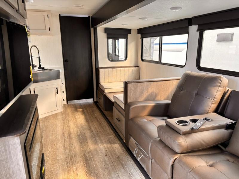 Head to your local state park in this travel trailer with a large slide out! You will love having more space to move about, and your crew can relax on the theater seating or play a game at the booth dinette. An optional TV can be added to the entertainment center, and the fireplace will make it feel a little more like home. There is a three burner cooktop and microwave oven in the kitchen, along with a 12V refrigerator and a walk-in pantry. If you enjoy cooking outdoors, then the outside kitchen will be waiting for you! The full rear bath will let you freshen up before bed, and the queen bed is sure to bring a great night's rest!