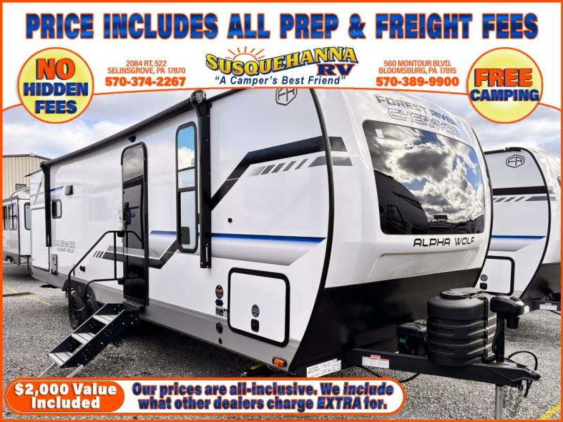 With any Cherokee Alpha Wolf travel trailer by Forest River you'll enjoy outstanding amenities, quality construction, and an affordable price. Each model features a "ToughBend" rigid skirt metal design, 5/8" tongue and groove plywood floor decking, and a "SuperTruss" roof structure that will hold up through years of camping memories. There is a pet friendly "clean sweep" floor design with no heat vents indoors, along with a super lumen lighting system, a 15,000 BTU quick cool central air conditioning, and many more comforts. There are many convenient exterior features such as, Leash Latch pet safety technology, an outside shower with hot and cold water, On The Go rear ladder prep, and exterior steps with oversized landing and quick release. The Weather Guard Package will add protection against the elements with an armored underbelly tank enclosure and forced air heat, thermo-control reflective safety glass windows, and upgraded laminated walls with block foam insulation!
