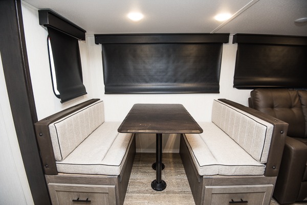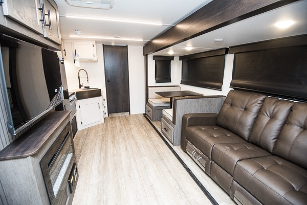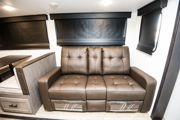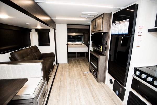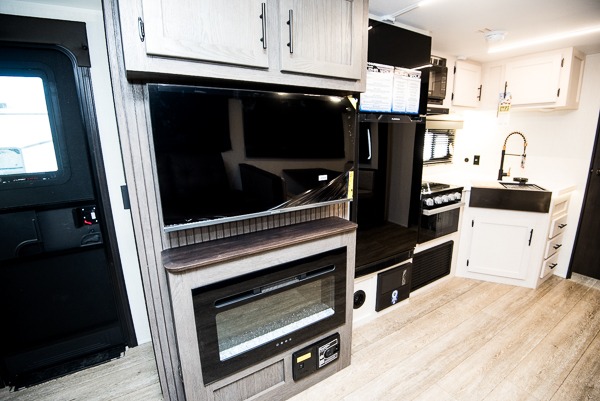 Head to your local state park in this travel trailer with a large slide out! You will love having more space to move about, and your crew can relax on the theater seating or play a game at the booth dinette. An optional TV can be added to the entertainment center, and the fireplace will make it feel a little more like home. There is a three burner cooktop and microwave oven in the kitchen, along with a 12V refrigerator and a walk-in pantry. If you enjoy cooking outdoors, then the outside kitchen will be waiting for you! The full rear bath will let you freshen up before bed, and the queen bed is sure to bring a great night's rest!