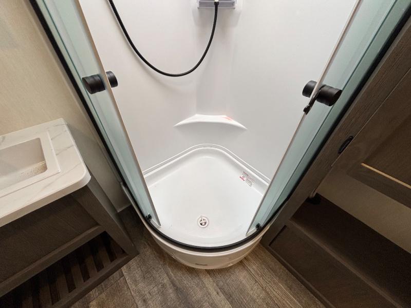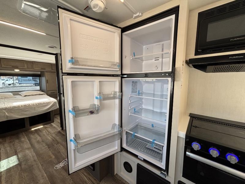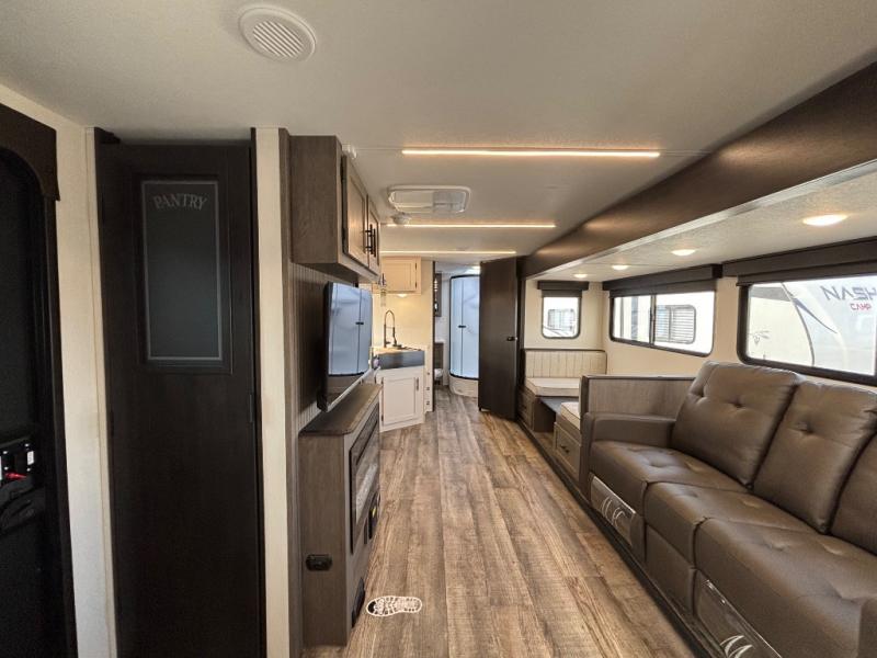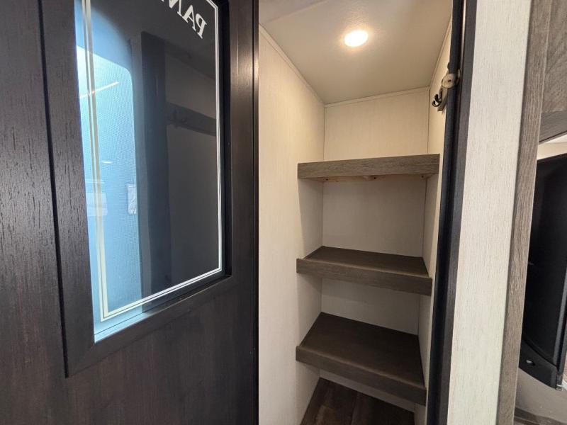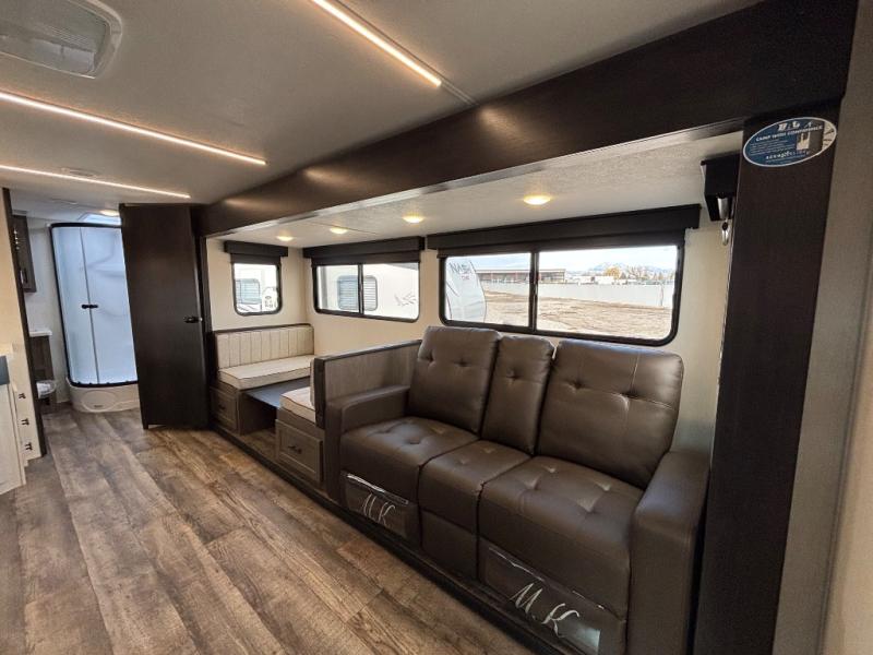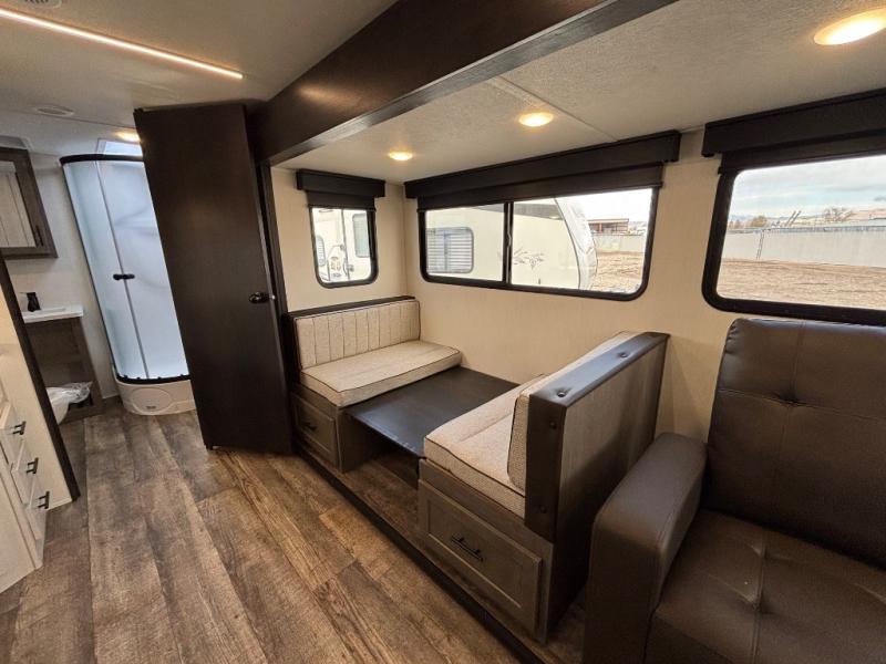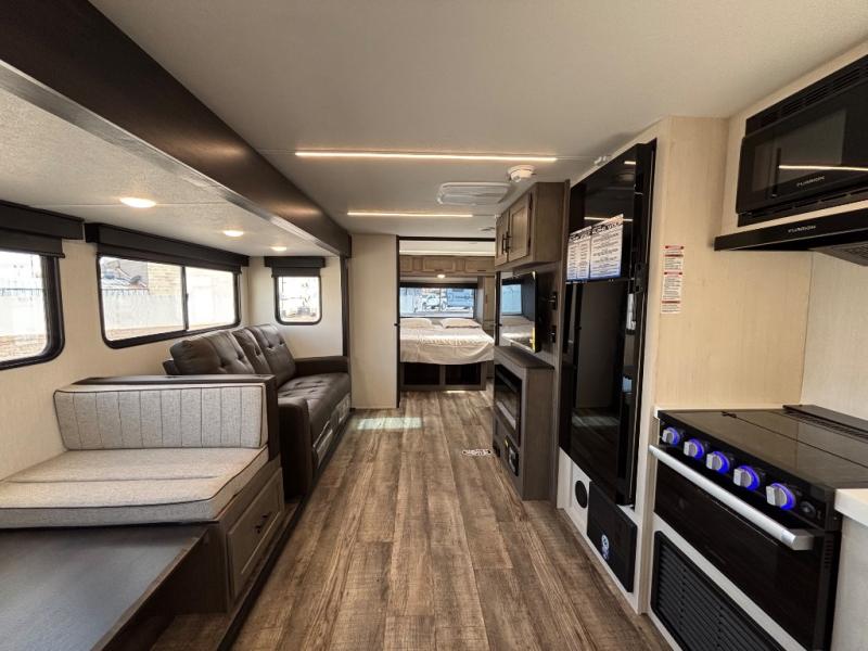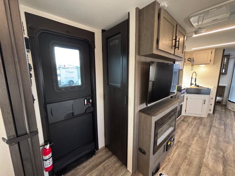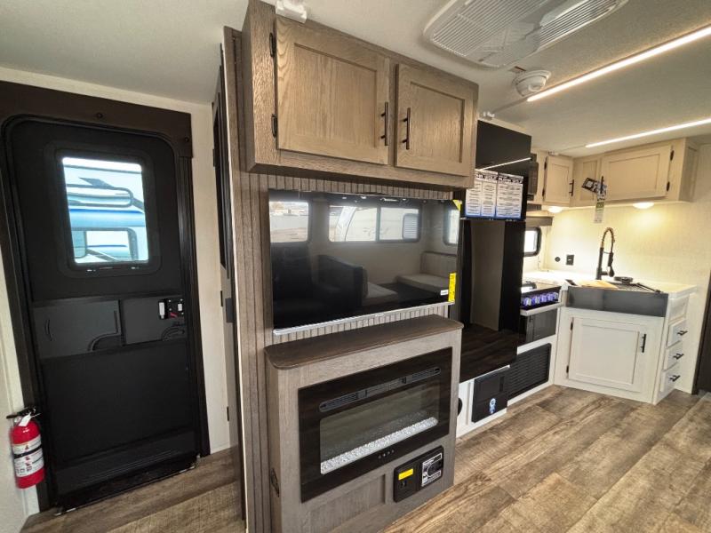 Head to your local state park in this travel trailer with a large slide out! You will love having more space to move about, and your crew can relax on the theater seating or play a game at the booth dinette. An optional TV can be added to the entertainment center, and the fireplace will make it feel a little more like home. There is a three burner cooktop and microwave oven in the kitchen, along with a 12V refrigerator and a walk-in pantry. If you enjoy cooking outdoors, then the outside kitchen will be waiting for you! The full rear bath will let you freshen up before bed, and the queen bed is sure to bring a great night's rest!