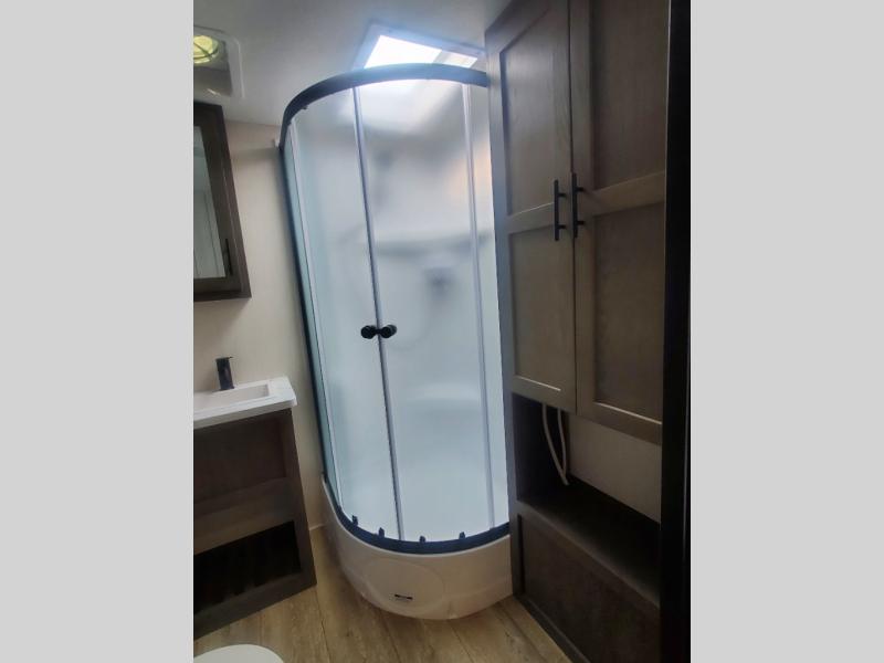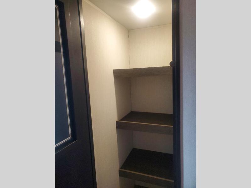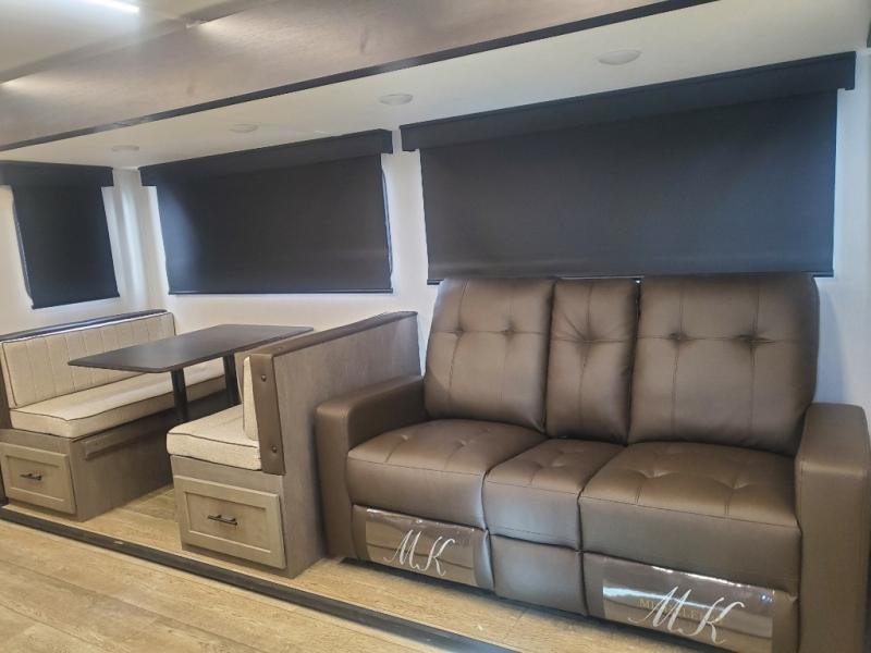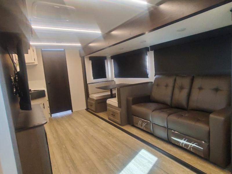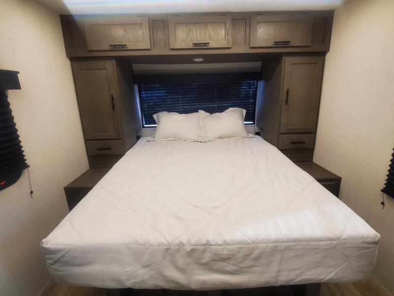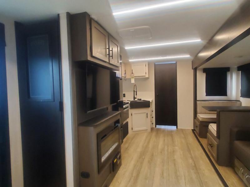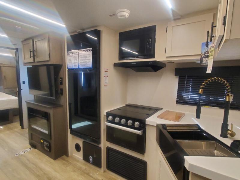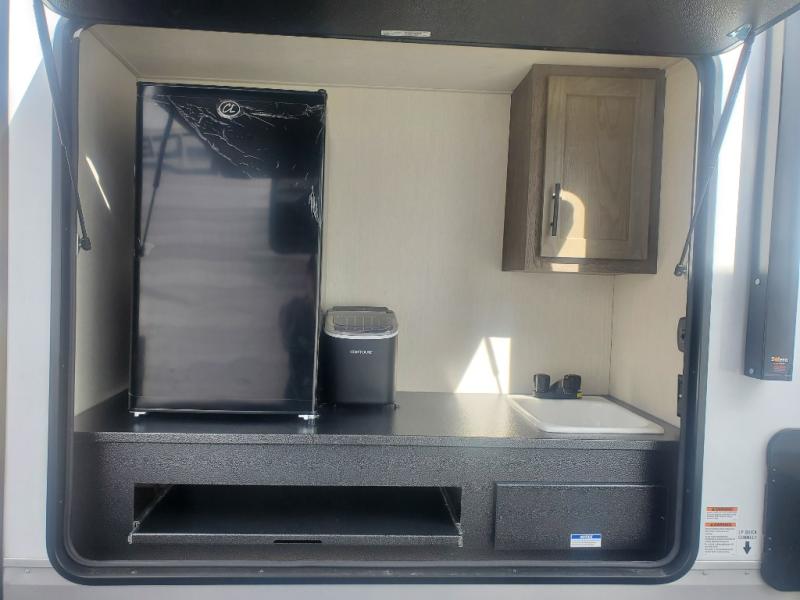 Head to your local state park in this travel trailer with a large slide out! You will love having more space to move about, and your crew can relax on the theater seating or play a game at the booth dinette. An optional TV can be added to the entertainment center, and the fireplace will make it feel a little more like home. There is a three burner cooktop and microwave oven in the kitchen, along with a 12V refrigerator and a walk-in pantry. If you enjoy cooking outdoors, then the outside kitchen will be waiting for you! The full rear bath will let you freshen up before bed, and the queen bed is sure to bring a great night's rest!