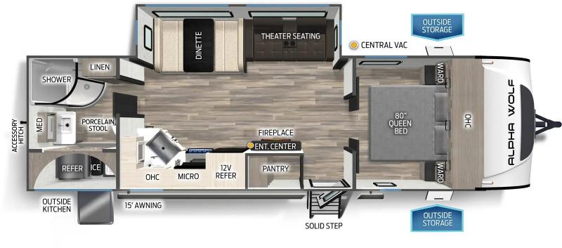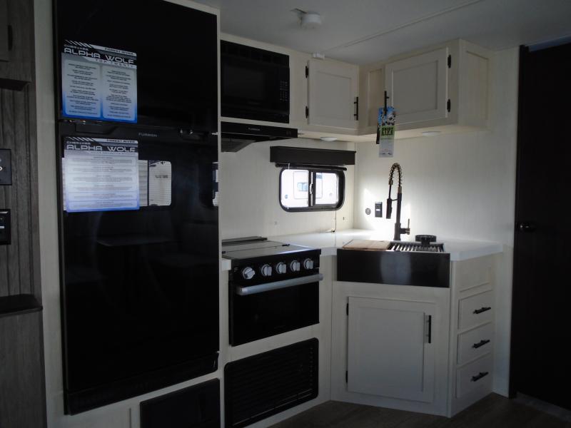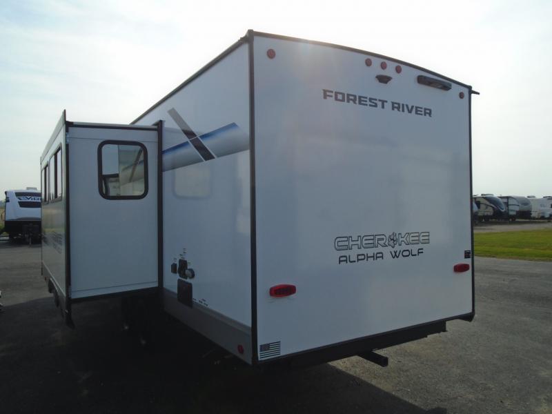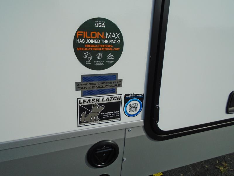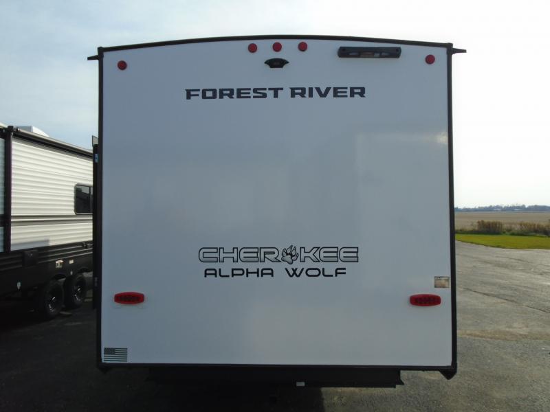 With any Cherokee Alpha Wolf travel trailer by Forest River you'll enjoy outstanding amenities, quality construction, and an affordable price. Each model features a "ToughBend" rigid skirt metal design, 5/8" tongue and groove plywood floor decking, and a "SuperTruss" roof structure that will hold up through years of camping memories. There is a pet friendly "clean sweep" floor design with no heat vents indoors, along with a super lumen lighting system, a 15,000 BTU quick cool central air conditioning, and many more comforts. There are many convenient exterior features such as, Leash Latch pet safety technology, an outside shower with hot and cold water, On The Go rear ladder prep, and exterior steps with oversized landing and quick release. The Weather Guard Package will add protection against the elements with an armored underbelly tank enclosure and forced air heat, thermo-control reflective safety glass windows, and upgraded laminated walls with block foam insulation!
