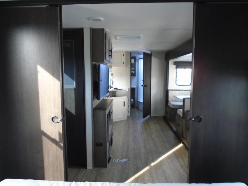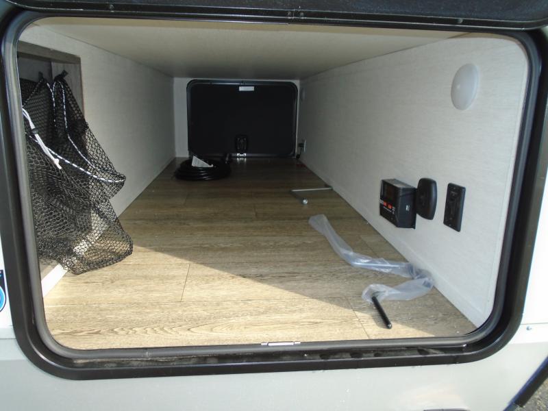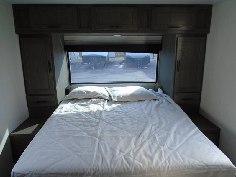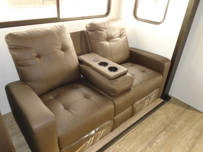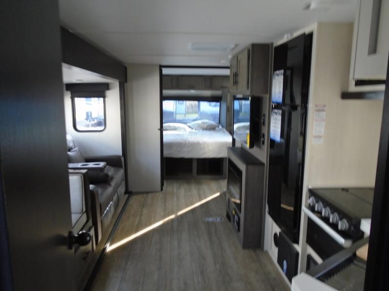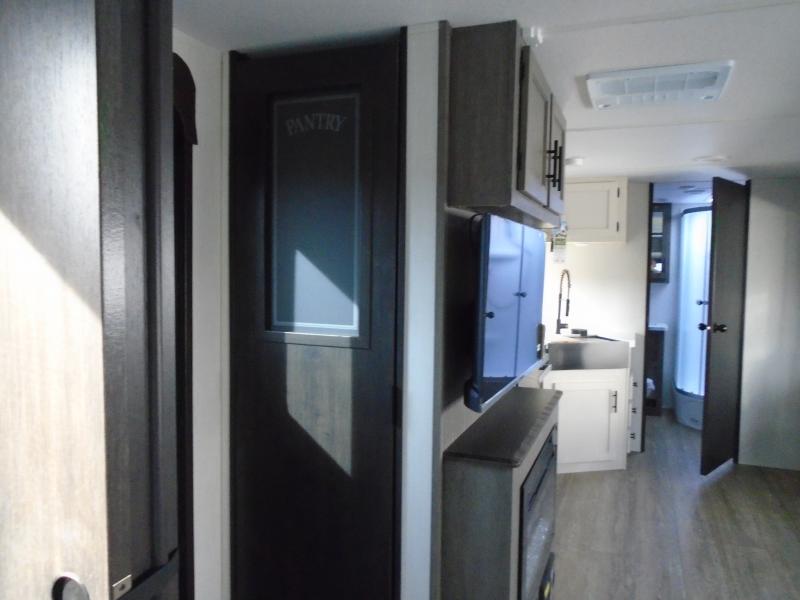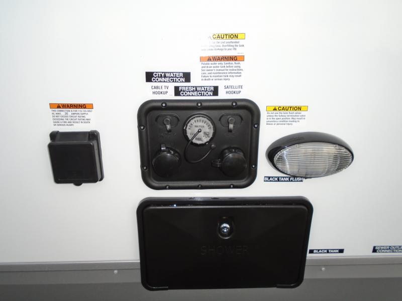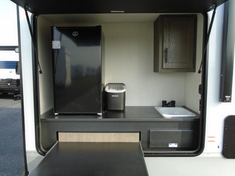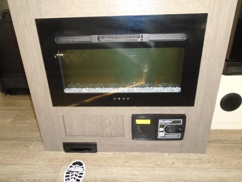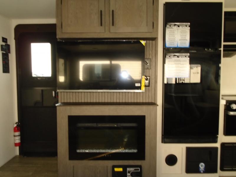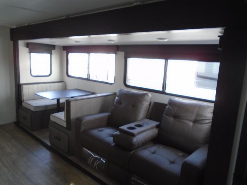Head to your local state park in this travel trailer with a large slide out! You will love having more space to move about, and your crew can relax on the theater seating or play a game at the booth dinette. An optional TV can be added to the entertainment center, and the fireplace will make it feel a little more like home. There is a three burner cooktop and microwave oven in the kitchen, along with a 12V refrigerator and a walk-in pantry. If you enjoy cooking outdoors, then the outside kitchen will be waiting for you! The full rear bath will let you freshen up before bed, and the queen bed is sure to bring a great night's rest!