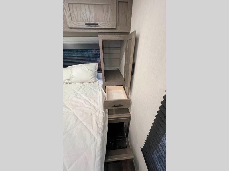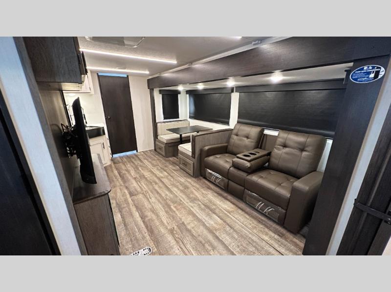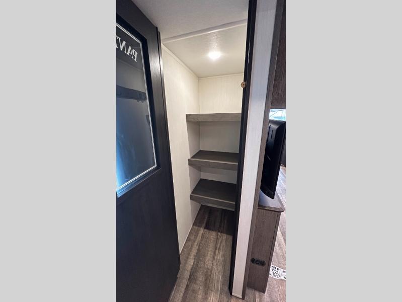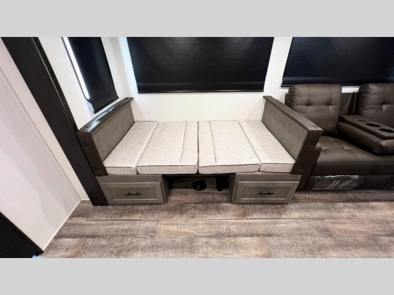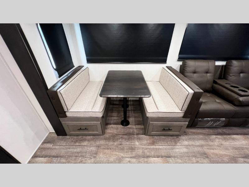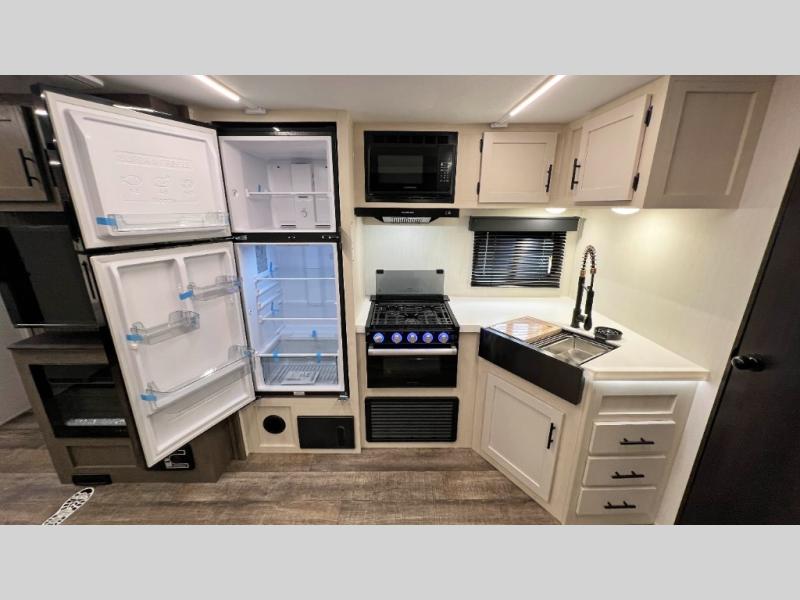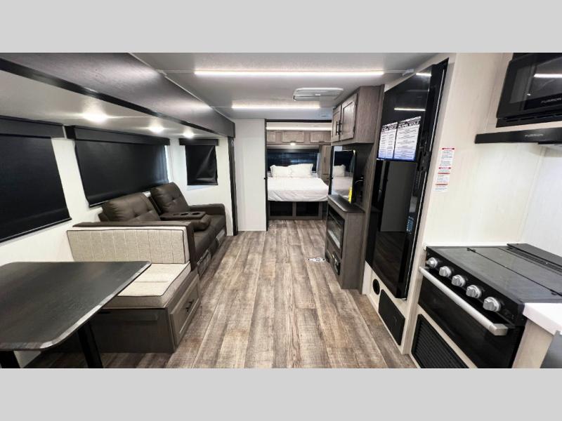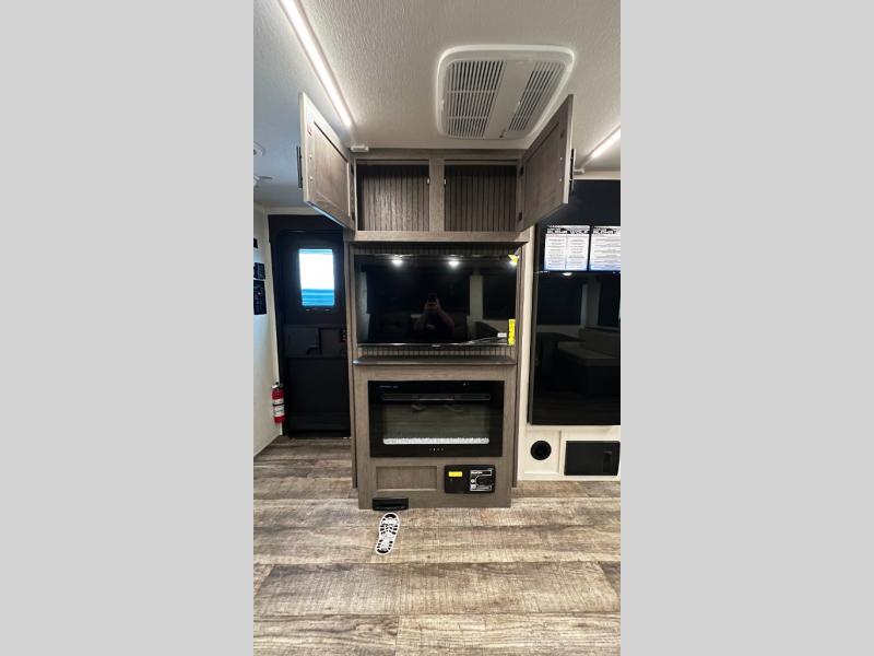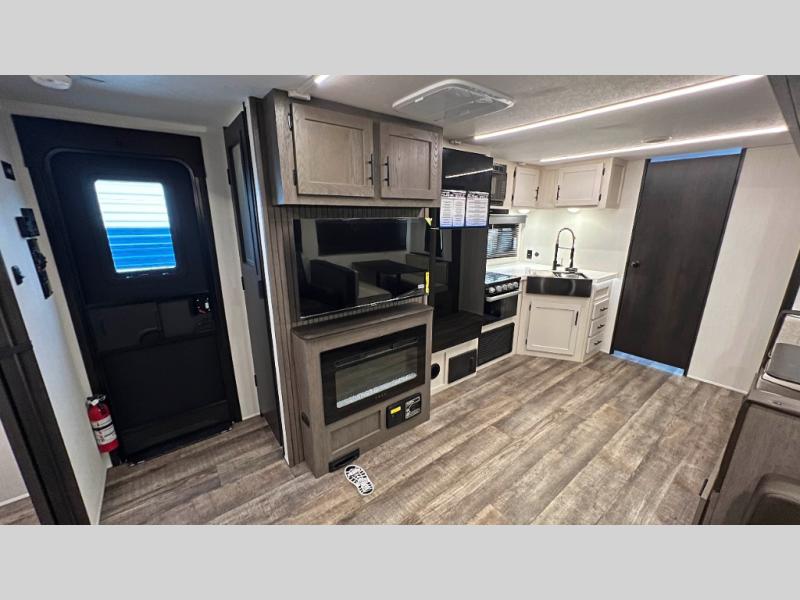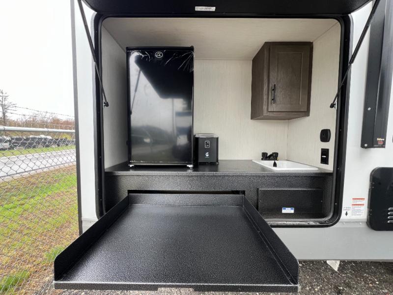 Head to your local state park in this travel trailer with a large slide out! You will love having more space to move about, and your crew can relax on the theater seating or play a game at the booth dinette. An optional TV can be added to the entertainment center, and the fireplace will make it feel a little more like home. There is a three burner cooktop and microwave oven in the kitchen, along with a 12V refrigerator and a walk-in pantry. If you enjoy cooking outdoors, then the outside kitchen will be waiting for you! The full rear bath will let you freshen up before bed, and the queen bed is sure to bring a great night's rest!
