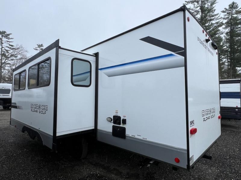 With any Cherokee Alpha Wolf travel trailer by Forest River you'll enjoy outstanding amenities, quality construction, and an affordable price. Each model features a "ToughBend" rigid skirt metal design, 5/8" tongue and groove plywood floor decking, and a "SuperTruss" roof structure that will hold up through years of camping memories. There is a pet friendly "clean sweep" floor design with no heat vents indoors, along with a super lumen lighting system, a 15,000 BTU quick cool central air conditioning, and many more comforts. There are many convenient exterior features such as, Leash Latch pet safety technology, an outside shower with hot and cold water, On The Go rear ladder prep, and exterior steps with oversized landing and quick release. The Weather Guard Package will add protection against the elements with an armored underbelly tank enclosure and forced air heat, thermo-control reflective safety glass windows, and upgraded laminated walls with block foam insulation!