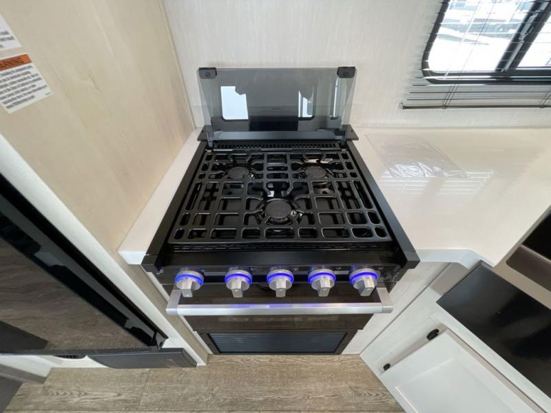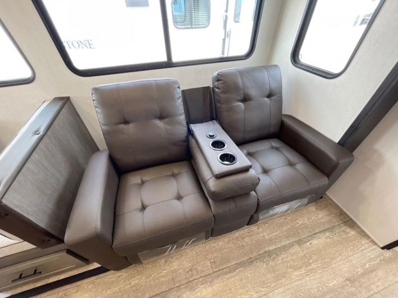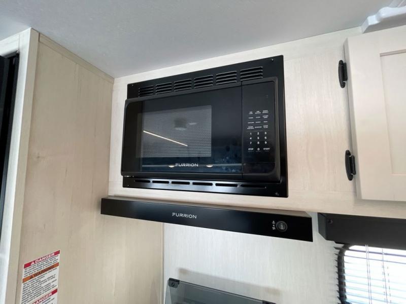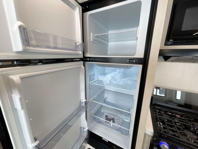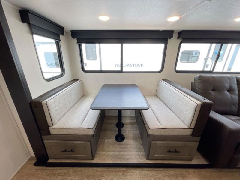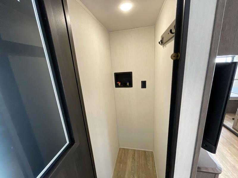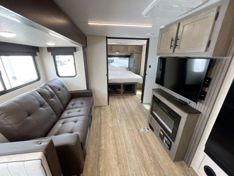 Head to your local state park in this travel trailer with a large slide out! You will love having more space to move about, and your crew can relax on the theater seating or play a game at the booth dinette. An optional TV can be added to the entertainment center, and the fireplace will make it feel a little more like home. There is a three burner cooktop and microwave oven in the kitchen, along with a 12V refrigerator and a walk-in pantry. If you enjoy cooking outdoors, then the outside kitchen will be waiting for you! The full rear bath will let you freshen up before bed, and the queen bed is sure to bring a great night's rest!