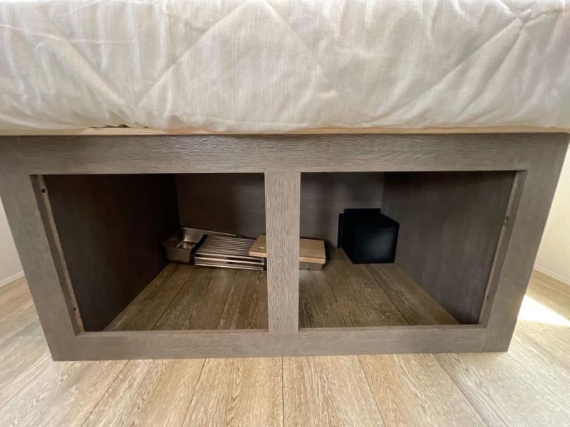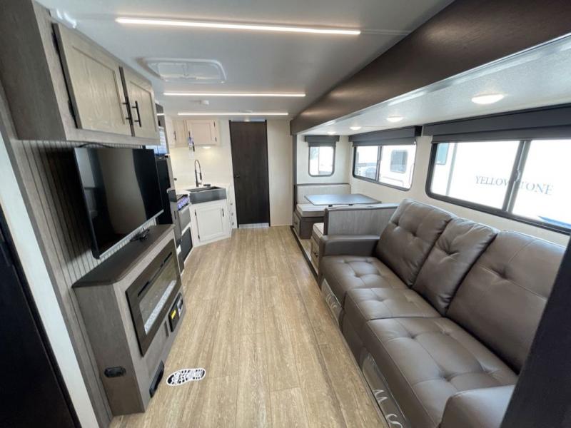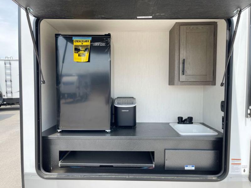 Head to your local state park in this travel trailer with a large slide out! You will love having more space to move about, and your crew can relax on the theater seating or play a game at the booth dinette. An optional TV can be added to the entertainment center, and the fireplace will make it feel a little more like home. There is a three burner cooktop and microwave oven in the kitchen, along with a 12V refrigerator and a walk-in pantry. If you enjoy cooking outdoors, then the outside kitchen will be waiting for you! The full rear bath will let you freshen up before bed, and the queen bed is sure to bring a great night's rest!