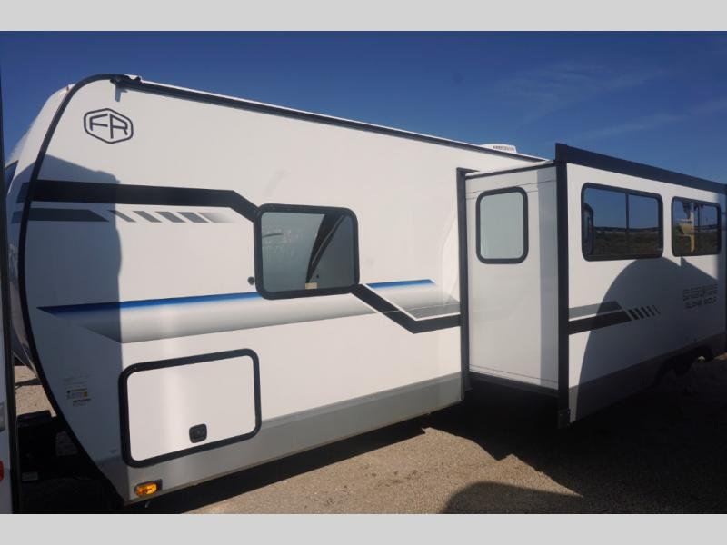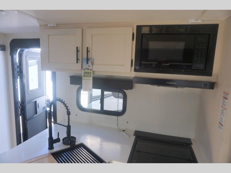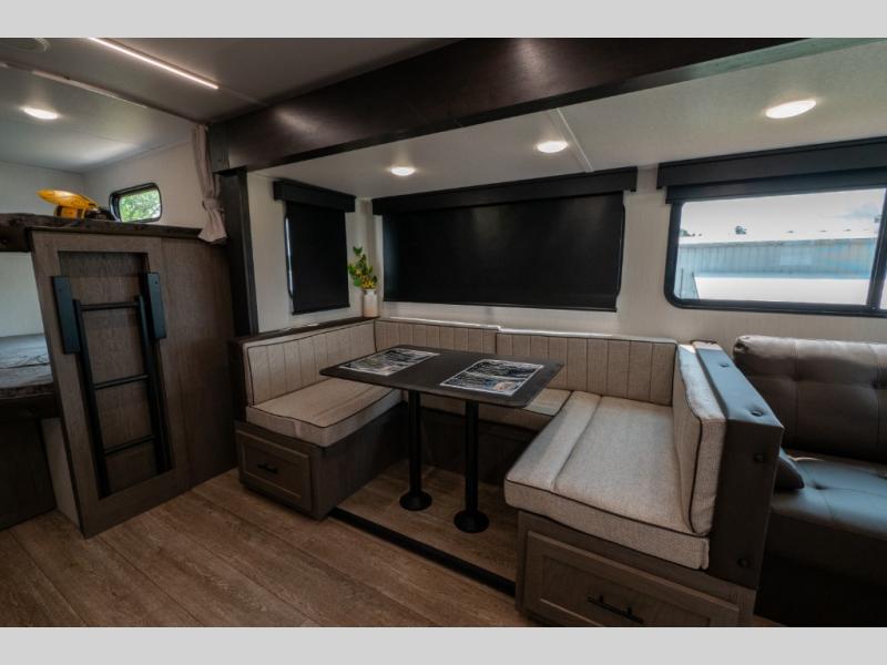 Looking for a multi-sleeper trailer to sleep nine to ten happy campers? You've found it in this dual entry model with an outside kitchen, double-size bunks, and a large slide out! The main living and kitchen area has a U-shaped dinette to utilize as a dining table, game table, work station, and/or an extra sleeping space. You will also find a hidden pantry behind the entertainment center and full kitchen amenities including a large sink and a residential-style refrigerator. The exterior provides a 20' awning for an outdoor living area, outside storage, plus large steps with oversized landing and quick release for convenience. You will also appreciate the Juice Pack that comes with a 100W solar panel, a battery, a 30 AMP solar charger, and more!