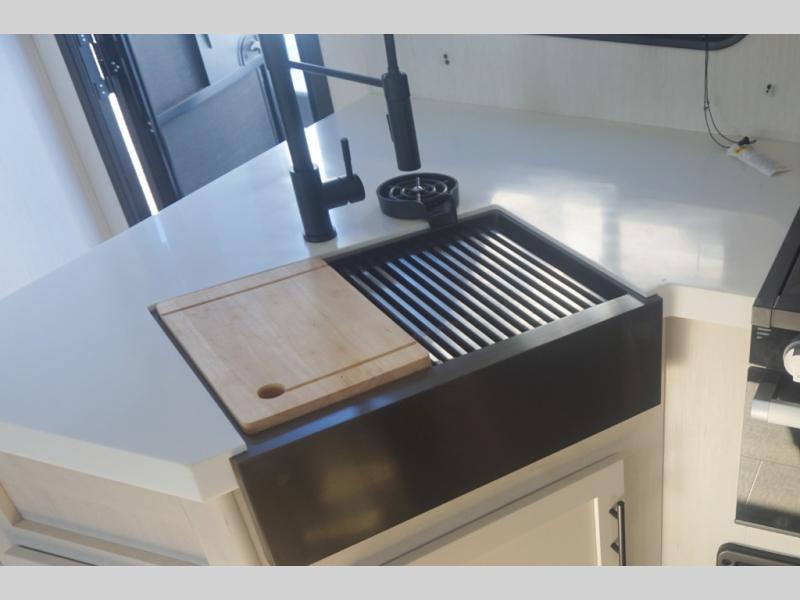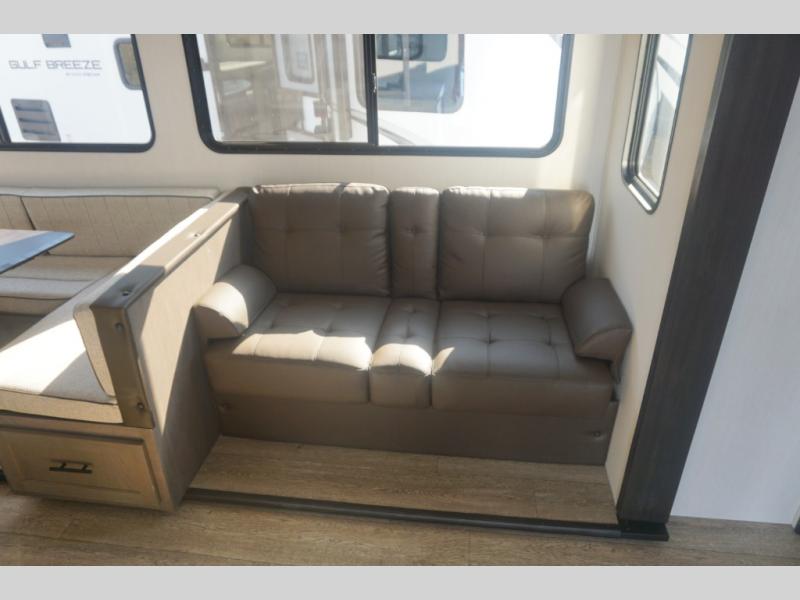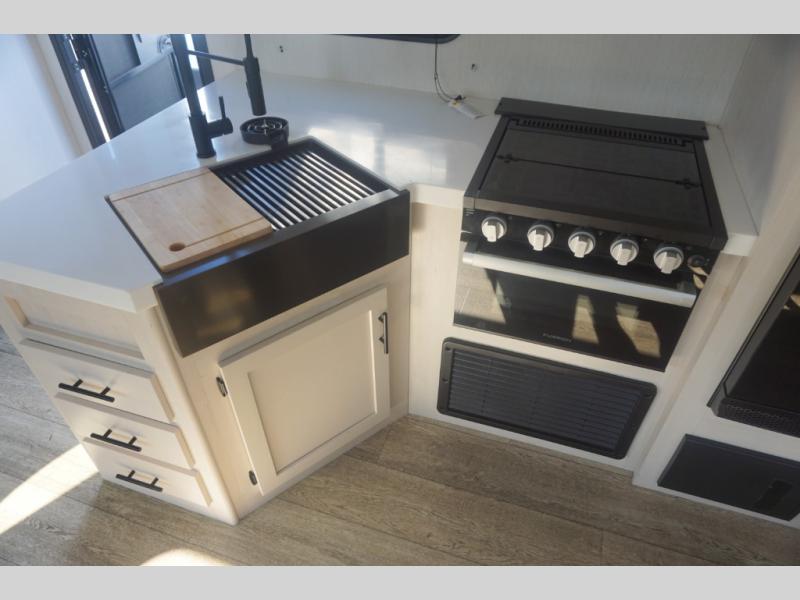 Alpha Wolf's most popular multi-sleeper and family fun coach! Interior highlights include central vac dustpan, rear window for a view of the lake, large convertible U-Dinette, electric fireplace, removable shower rod for hang-drying, and USB/USB-C ports throughout. Exterior features include two-point entry, outside kitchen with an ice machine, pass-through storage, oversized 20’ awning, 15,000 BTU A/C, and security camera system prep!
