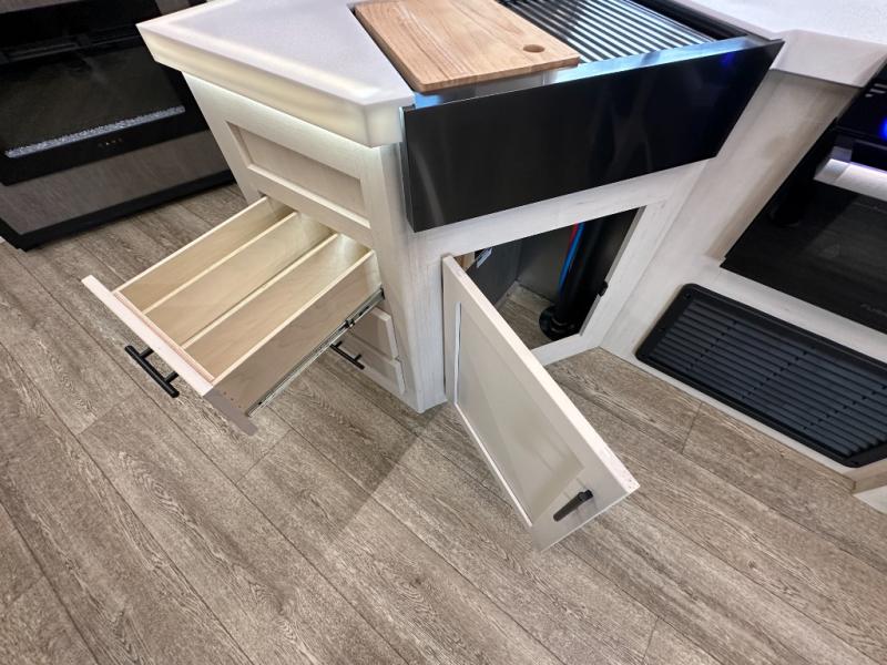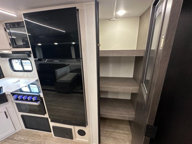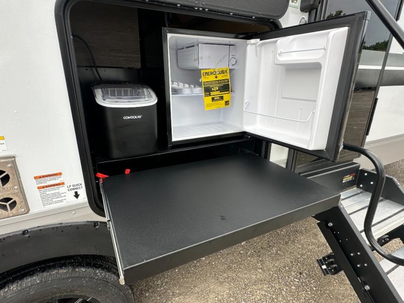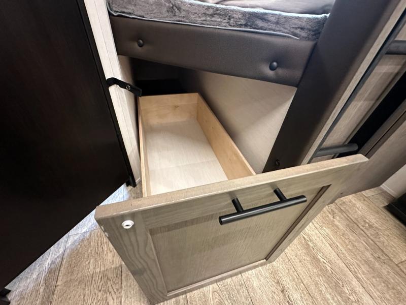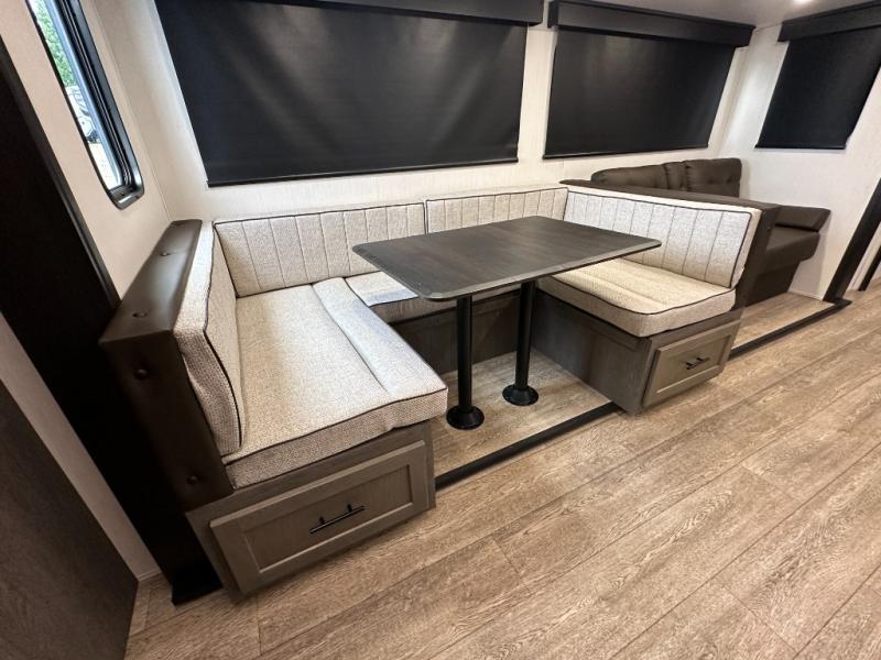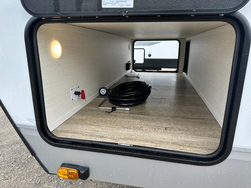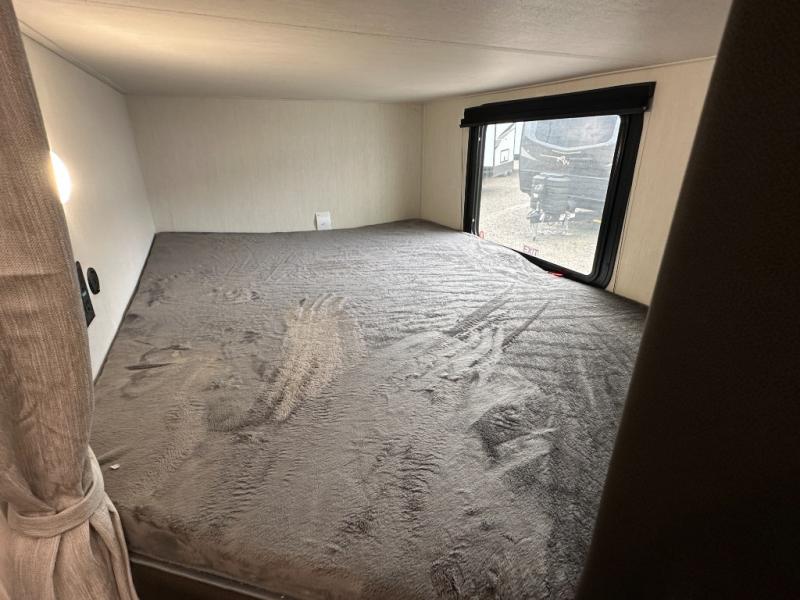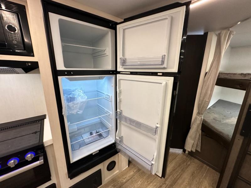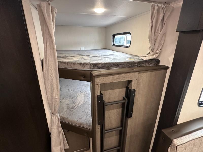Looking for a multi-sleeper trailer to sleep nine to ten happy campers? You've found it in this dual entry model with an outside kitchen, double-size bunks, and a large slide out! The main living and kitchen area has a U-shaped dinette to utilize as a dining table, game table, work station, and/or an extra sleeping space. You will also find a hidden pantry behind the entertainment center and full kitchen amenities including a large sink and a residential-style refrigerator. The exterior provides a 20' awning for an outdoor living area, outside storage, plus large steps with oversized landing and quick release for convenience. You will also appreciate the Juice Pack that comes with a 100W solar panel, a battery, a 30 AMP solar charger, and more!