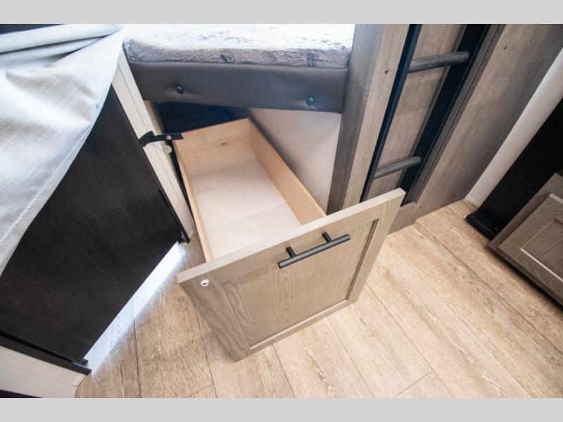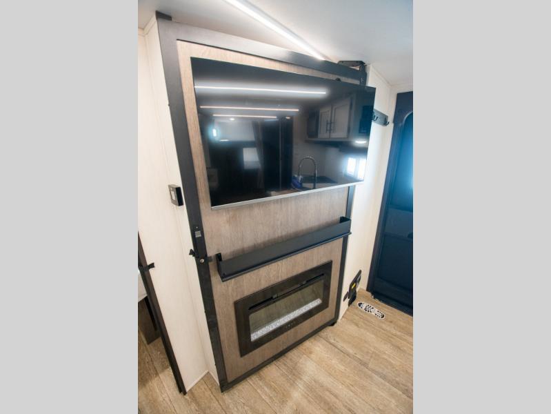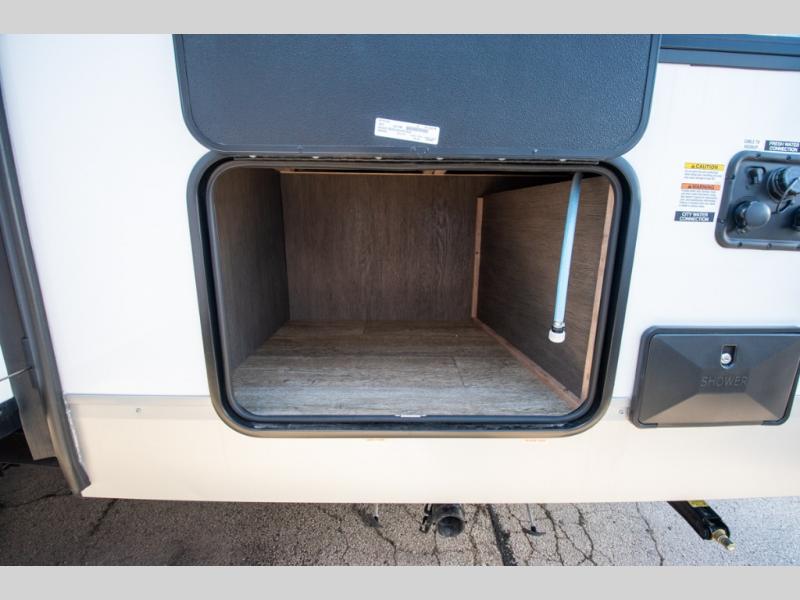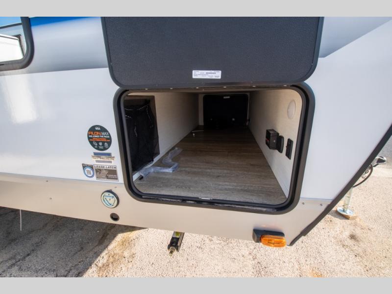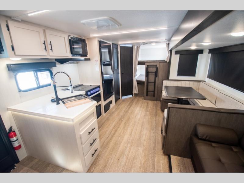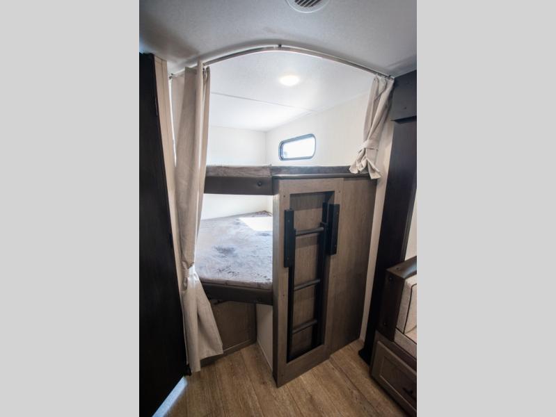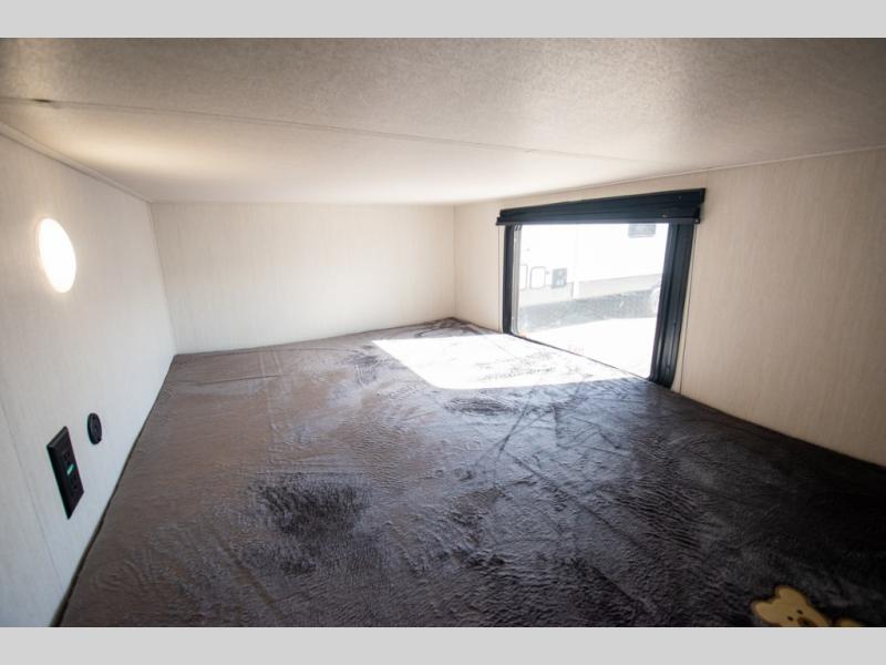 Looking for a multi-sleeper trailer to sleep nine to ten happy campers? You've found it in this dual entry model with an outside kitchen, double-size bunks, and a large slide out! The main living and kitchen area has a U-shaped dinette to utilize as a dining table, game table, work station, and/or an extra sleeping space. You will also find a hidden pantry behind the entertainment center and full kitchen amenities including a large sink and a residential-style refrigerator. The exterior provides a 20' awning for an outdoor living area, outside storage, plus large steps with oversized landing and quick release for convenience. You will also appreciate the Juice Pack that comes with a 100W solar panel, a battery, a 30 AMP solar charger, and more!