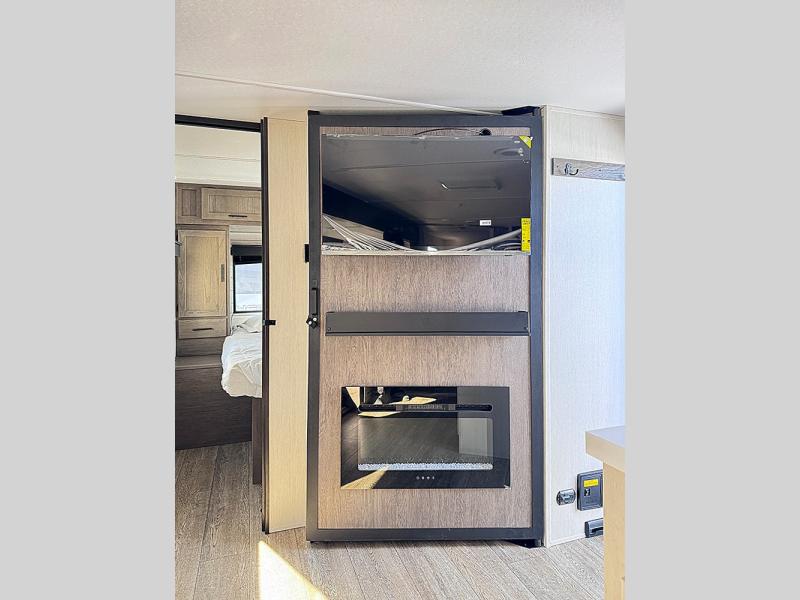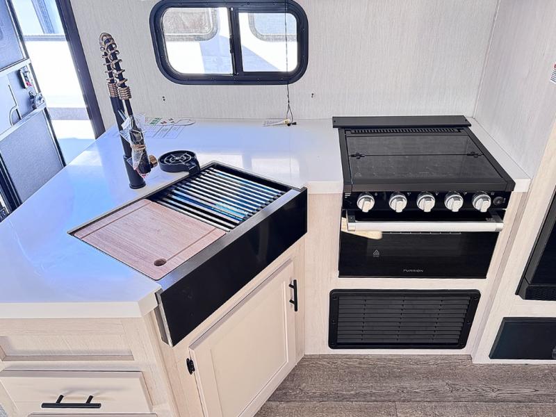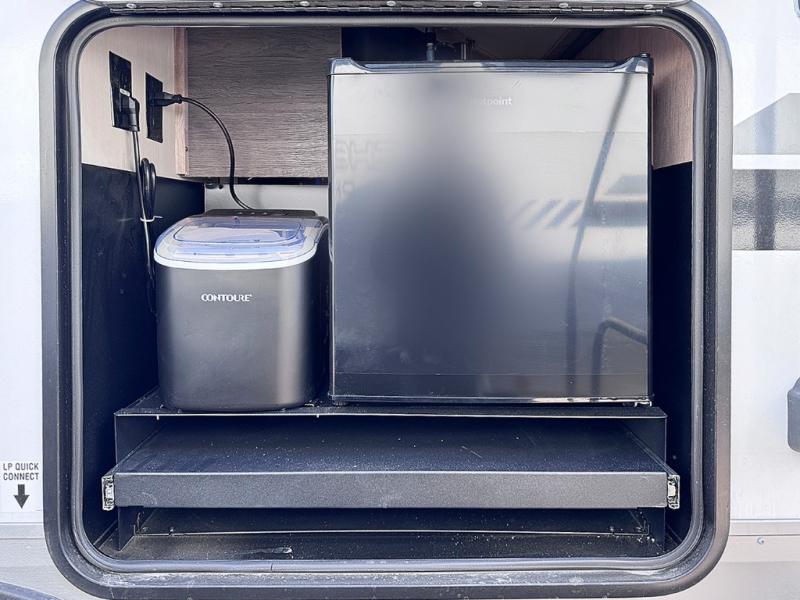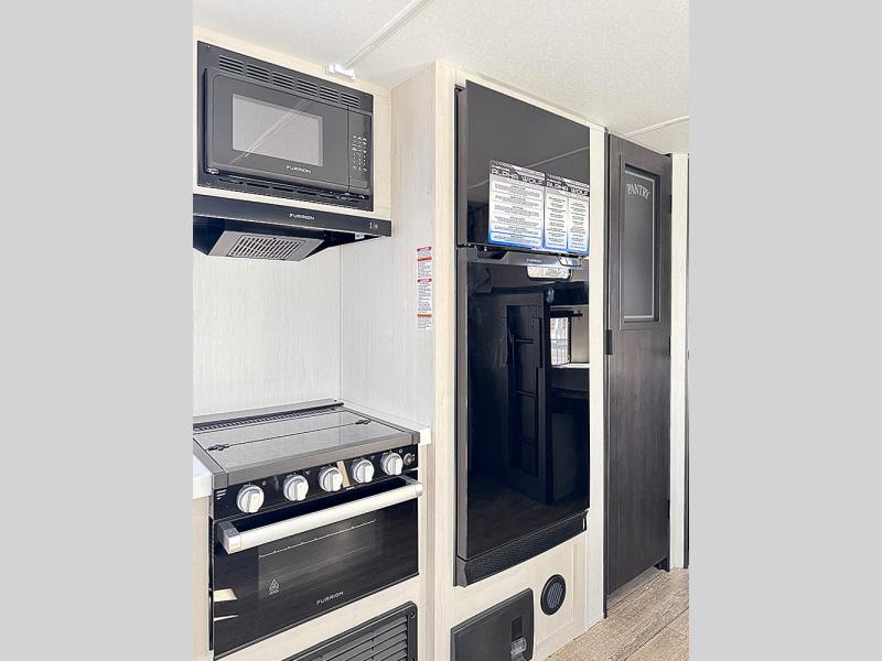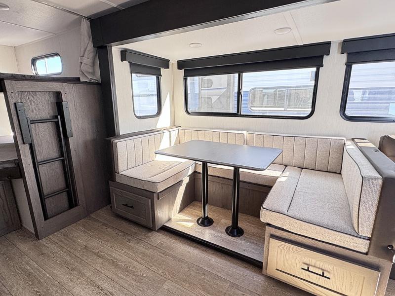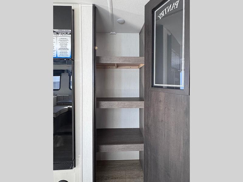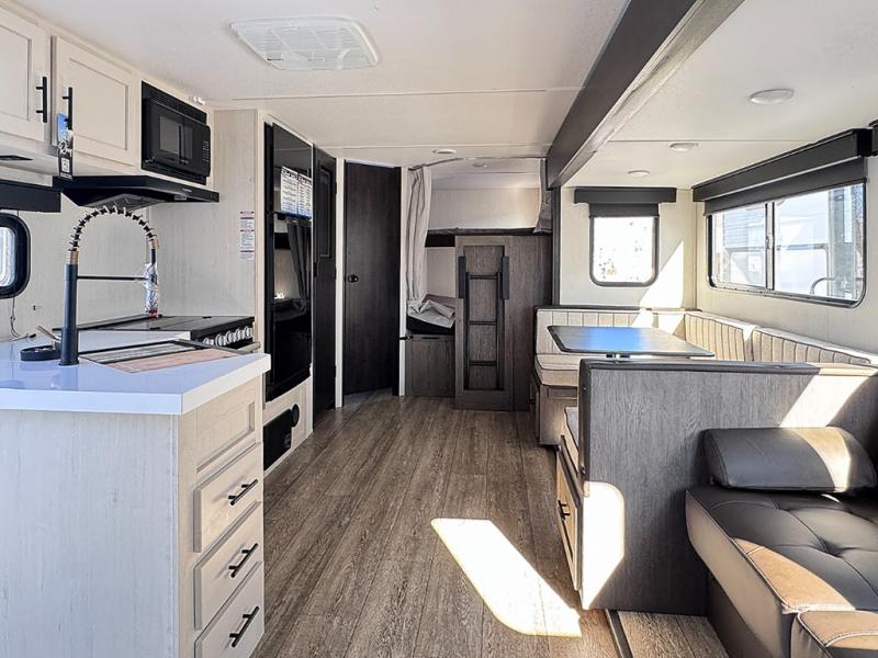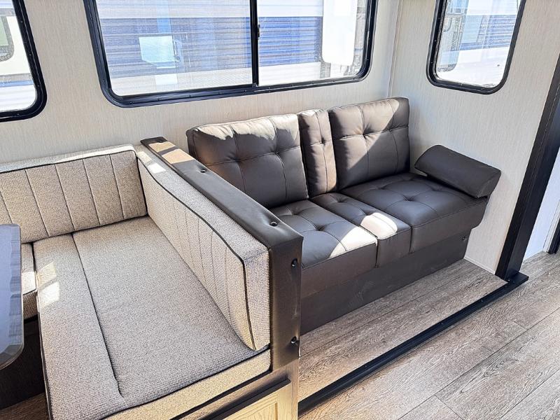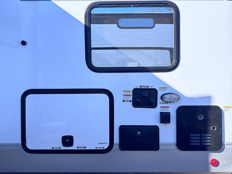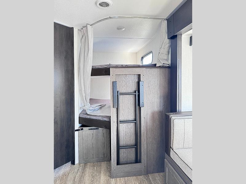Looking for a multi-sleeper trailer to sleep nine to ten happy campers? You've found it in this dual entry model with an outside kitchen, double-size bunks, and a large slide out! The main living and kitchen area has a U-shaped dinette to utilize as a dining table, game table, work station, and/or an extra sleeping space. You will also find a hidden pantry behind the entertainment center and full kitchen amenities including a large sink and a residential-style refrigerator. The exterior provides a 20' awning for an outdoor living area, outside storage, plus large steps with oversized landing and quick release for convenience. You will also appreciate the Juice Pack that comes with a 100W solar panel, a battery, a 30 AMP solar charger, and more!