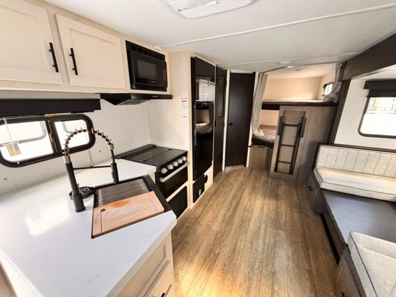 Looking for a multi-sleeper trailer to sleep nine to ten happy campers? You've found it in this dual entry model with an outside kitchen, double-size bunks, and a large slide out! The main living and kitchen area has a U-shaped dinette to utilize as a dining table, game table, work station, and/or an extra sleeping space. You will also find a hidden pantry behind the entertainment center and full kitchen amenities including a large sink and a residential-style refrigerator. The exterior provides a 20' awning for an outdoor living area, outside storage, plus large steps with oversized landing and quick release for convenience. You will also appreciate the Juice Pack that comes with a 100W solar panel, a battery, a 30 AMP solar charger, and more!