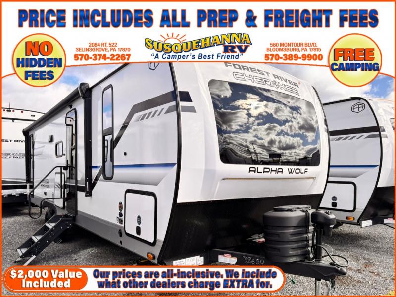 With any Cherokee Alpha Wolf travel trailer by Forest River you'll enjoy outstanding amenities, quality construction, and an affordable price. Each model features a "ToughBend" rigid skirt metal design, 5/8" tongue and groove plywood floor decking, and a "SuperTruss" roof structure that will hold up through years of camping memories. There is a pet friendly "clean sweep" floor design with no heat vents indoors, along with a super lumen lighting system, a 15,000 BTU quick cool central air conditioning, and many more comforts. There are many convenient exterior features such as, Leash Latch pet safety technology, an outside shower with hot and cold water, On The Go rear ladder prep, and exterior steps with oversized landing and quick release. The Weather Guard Package will add protection against the elements with an armored underbelly tank enclosure and forced air heat, thermo-control reflective safety glass windows, and upgraded laminated walls with block foam insulation!