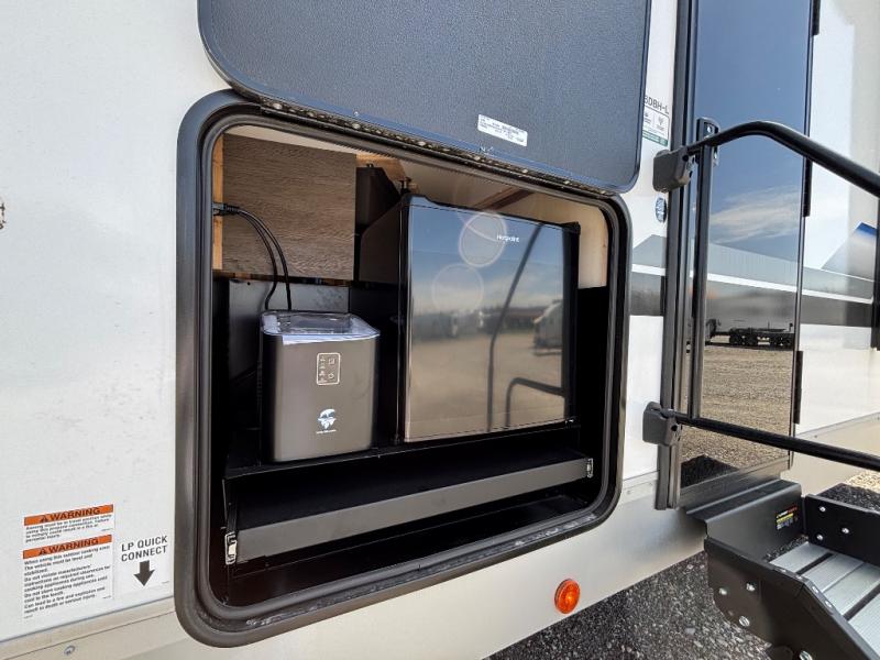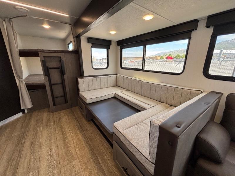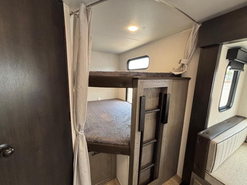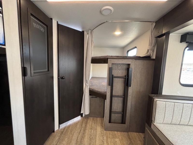 Looking for a multi-sleeper trailer to sleep nine to ten happy campers? You've found it in this dual entry model with an outside kitchen, double-size bunks, and a large slide out! The main living and kitchen area has a U-shaped dinette to utilize as a dining table, game table, work station, and/or an extra sleeping space. You will also find a hidden pantry behind the entertainment center and full kitchen amenities including a large sink and a residential-style refrigerator. The exterior provides a 20' awning for an outdoor living area, outside storage, plus large steps with oversized landing and quick release for convenience. You will also appreciate the Juice Pack that comes with a 100W solar panel, a battery, a 30 AMP solar charger, and more!