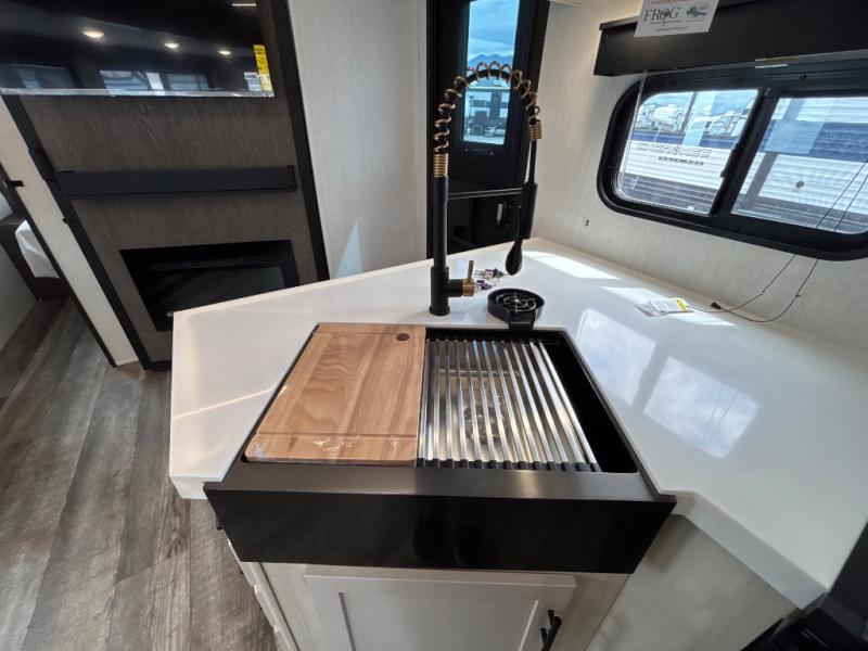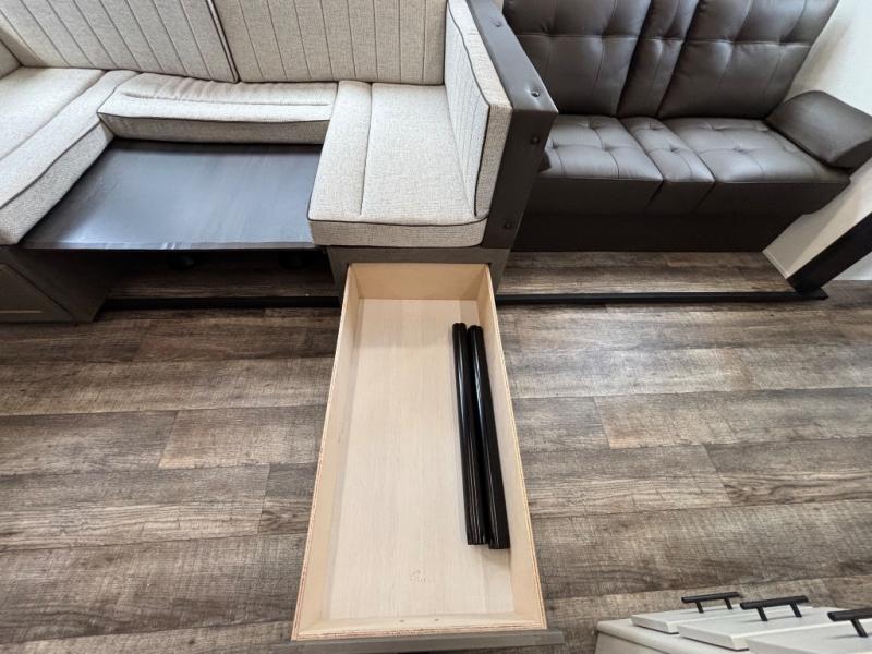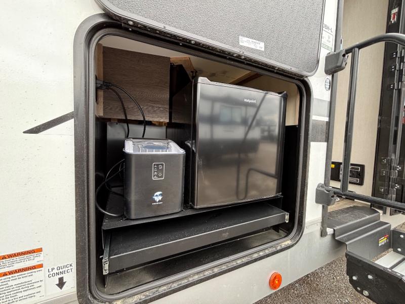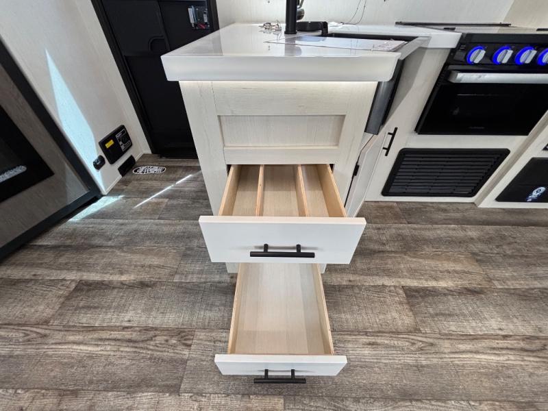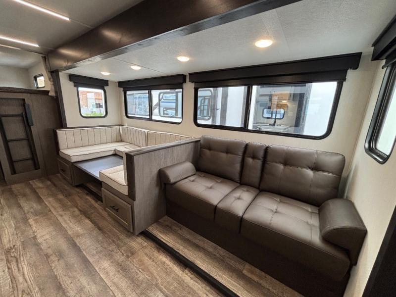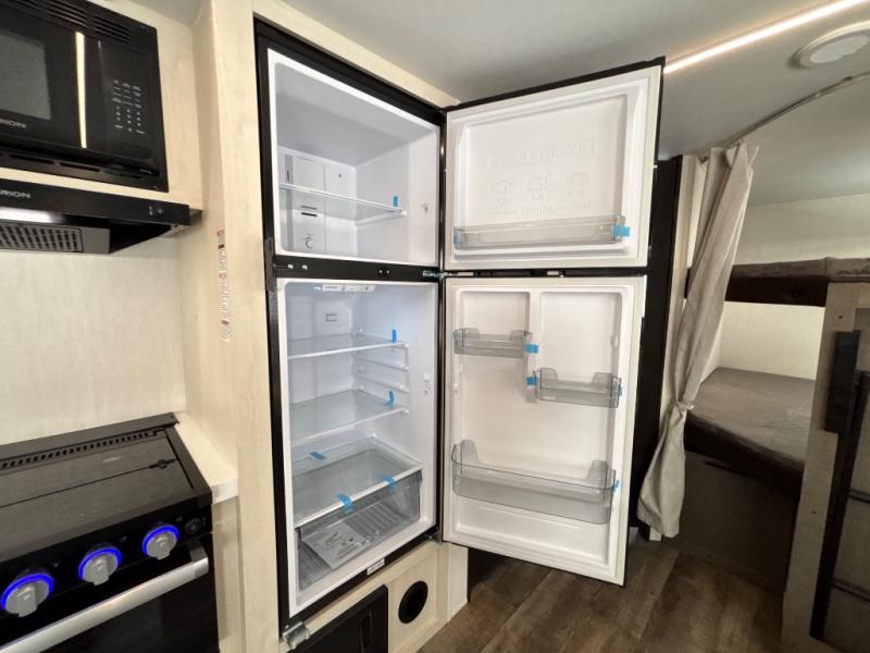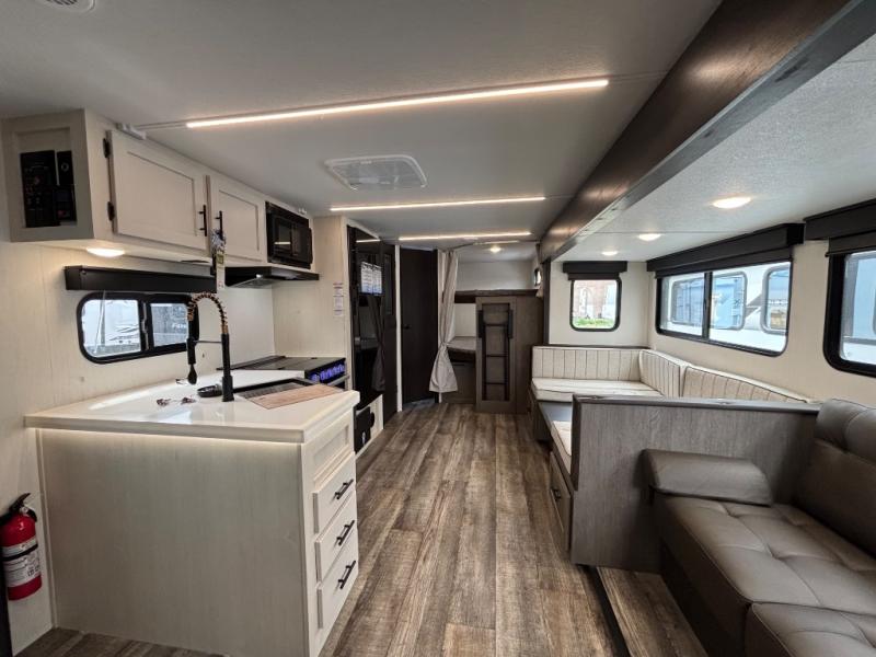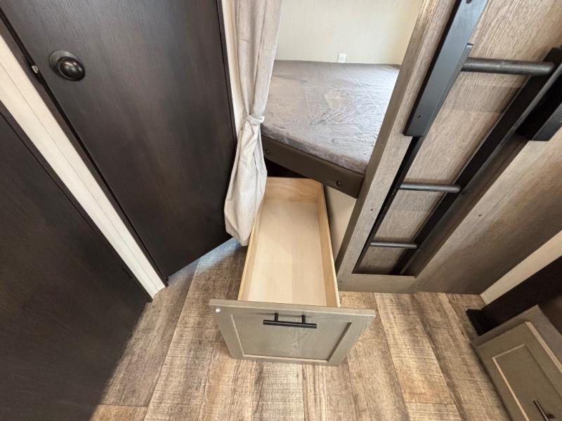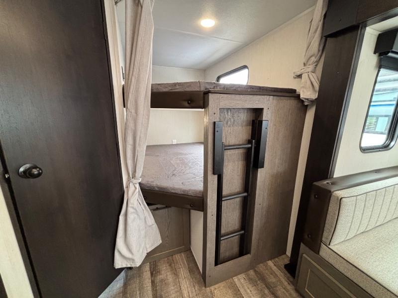 Looking for a multi-sleeper trailer to sleep nine to ten happy campers? You've found it in this dual entry model with an outside kitchen, double-size bunks, and a large slide out! The main living and kitchen area has a U-shaped dinette to utilize as a dining table, game table, work station, and/or an extra sleeping space. You will also find a hidden pantry behind the entertainment center and full kitchen amenities including a large sink and a residential-style refrigerator. The exterior provides a 20' awning for an outdoor living area, outside storage, plus large steps with oversized landing and quick release for convenience. You will also appreciate the Juice Pack that comes with a 100W solar panel, a battery, a 30 AMP solar charger, and more!