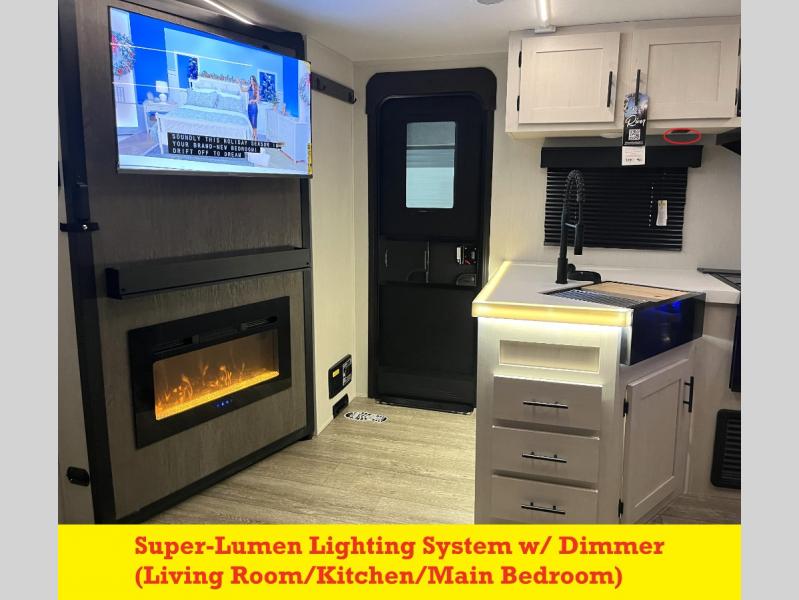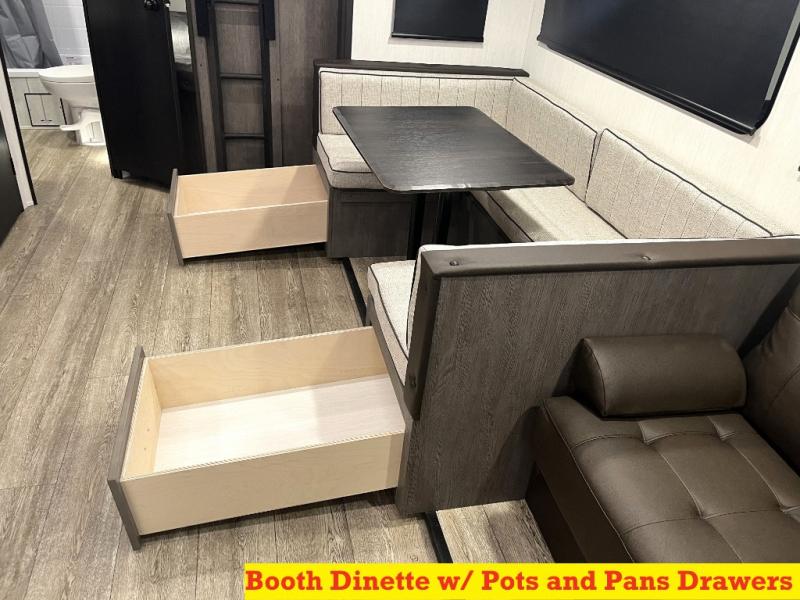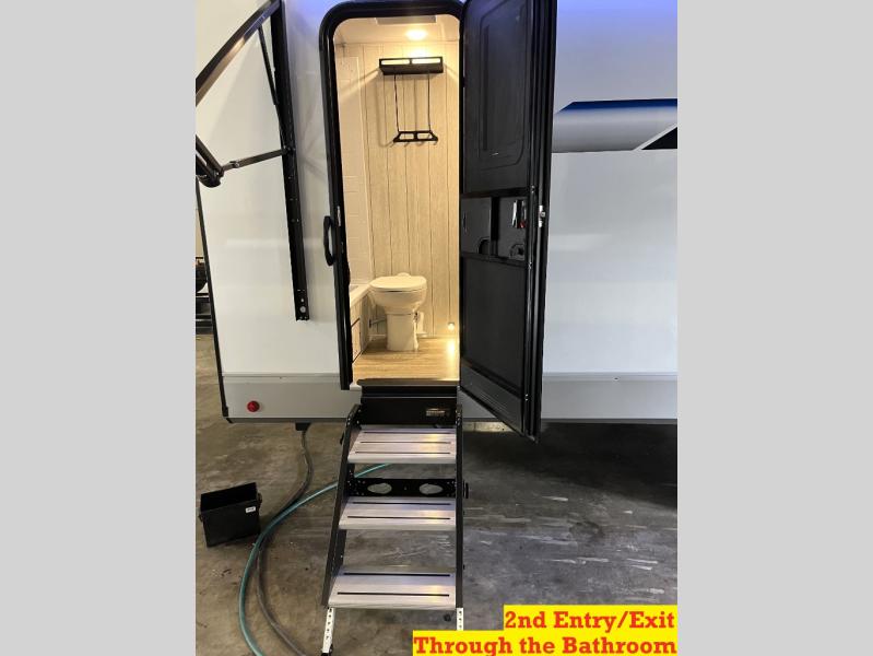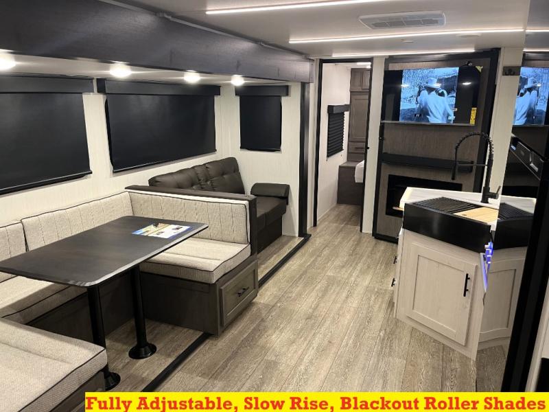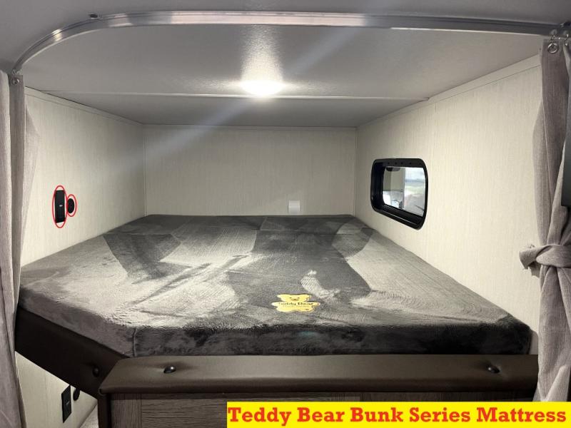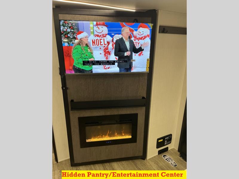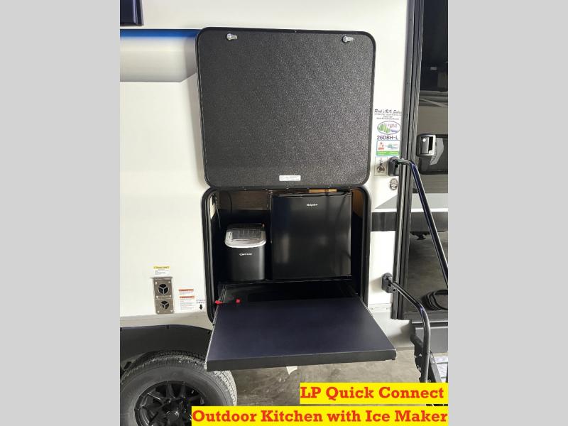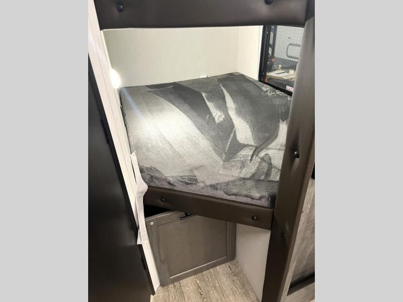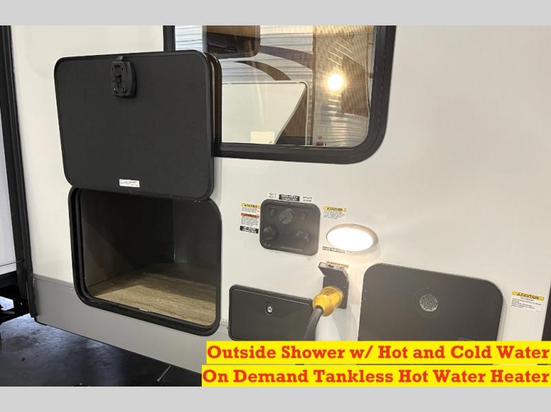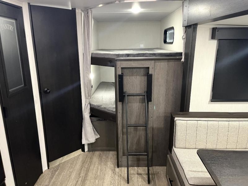 Looking for a multi-sleeper trailer to sleep nine to ten happy campers? You've found it in this dual entry model with an outside kitchen, double-size bunks, and a large slide out! The main living and kitchen area has a U-shaped dinette to utilize as a dining table, game table, work station, and/or an extra sleeping space. You will also find a hidden pantry behind the entertainment center and full kitchen amenities including a large sink and a residential-style refrigerator. The exterior provides a 20' awning for an outdoor living area, outside storage, plus large steps with oversized landing and quick release for convenience. You will also appreciate the Juice Pack that comes with a 100W solar panel, a battery, a 30 AMP solar charger, and more!