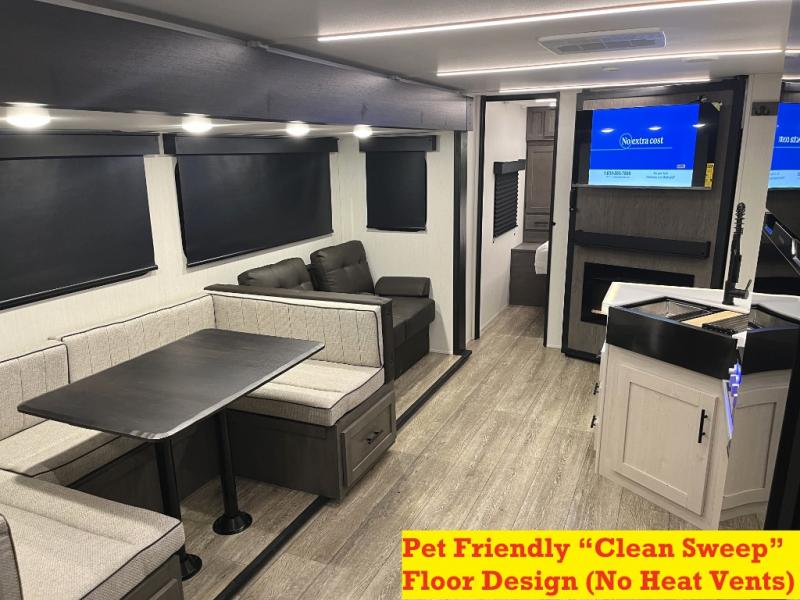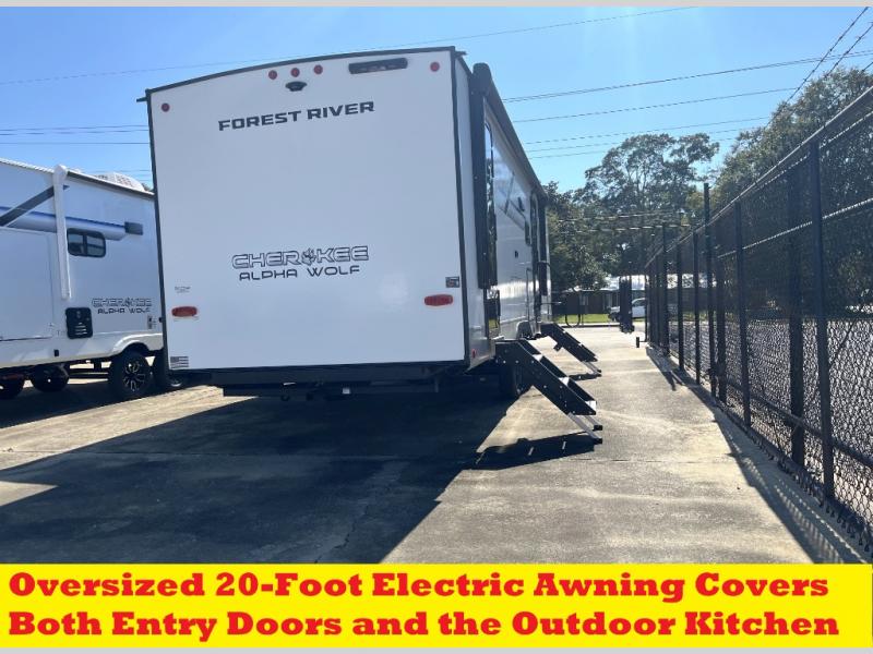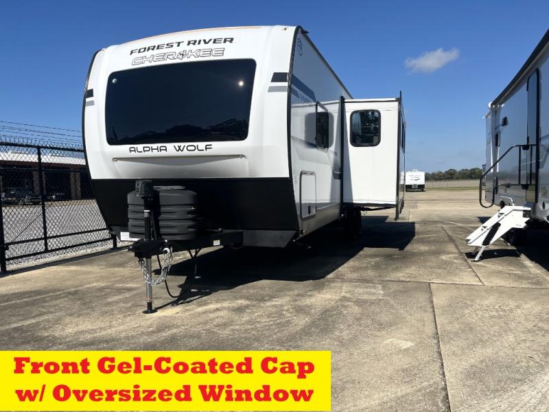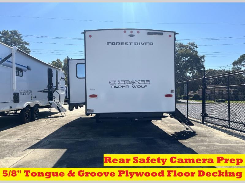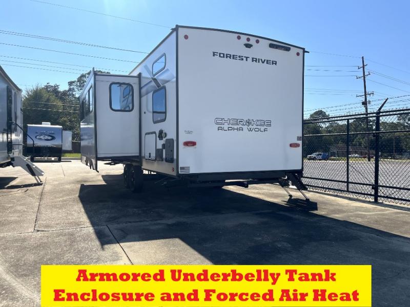 With any Cherokee Alpha Wolf travel trailer by Forest River you'll enjoy outstanding amenities, quality construction, and an affordable price. Each model features a "ToughBend" rigid skirt metal design, 5/8" tongue and groove plywood floor decking, and a "SuperTruss" roof structure that will hold up through years of camping memories. There is a pet friendly "clean sweep" floor design with no heat vents indoors, along with a super lumen lighting system, a 15,000 BTU quick cool central air conditioning, and many more comforts. There are many convenient exterior features such as, Leash Latch pet safety technology, an outside shower with hot and cold water, On The Go rear ladder prep, and exterior steps with oversized landing and quick release. The Weather Guard Package will add protection against the elements with an armored underbelly tank enclosure and forced air heat, thermo-control reflective safety glass windows, and upgraded laminated walls with block foam insulation!