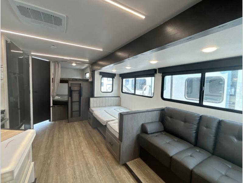 Looking for a multi-sleeper trailer to sleep nine to ten happy campers? You've found it in this dual entry model with a deluxe outside kitchen, double-size bunks, and a large slide out! The main living and kitchen area has a U-shaped dinette to utilize as a dining table, game table, work station, and/or an extra sleeping space. You will also find a walk-in pantry and full kitchen amenities including a farm-style sink, a residential refrigerator, and dual pots and pans drawers. The exterior provides a 20' awning for an outdoor living area, outside storage, plus large steps with oversized landing and quick release for convenience. You will also appreciate the Juice Pack that comes with a 100W solar panel, a battery, a 30 AMP solar charger, and more!