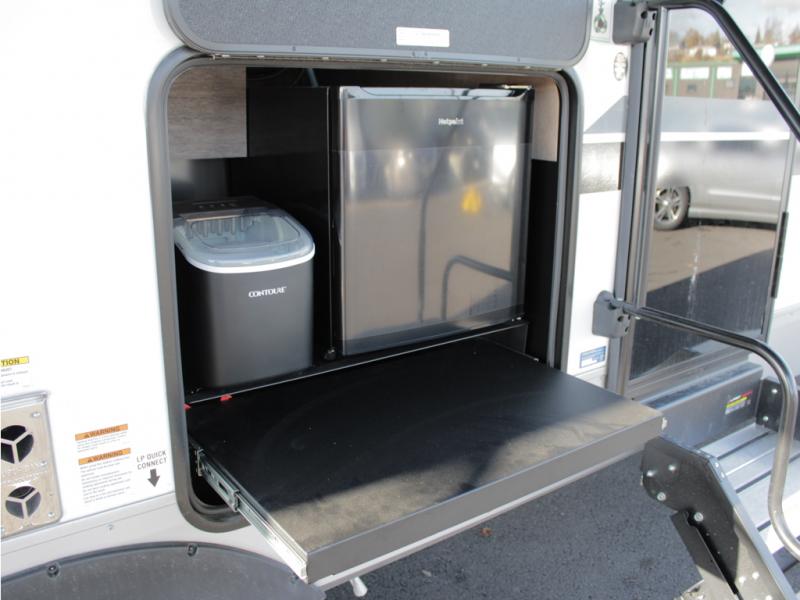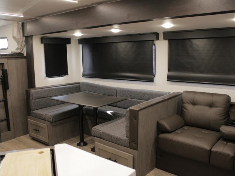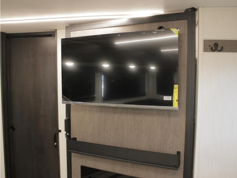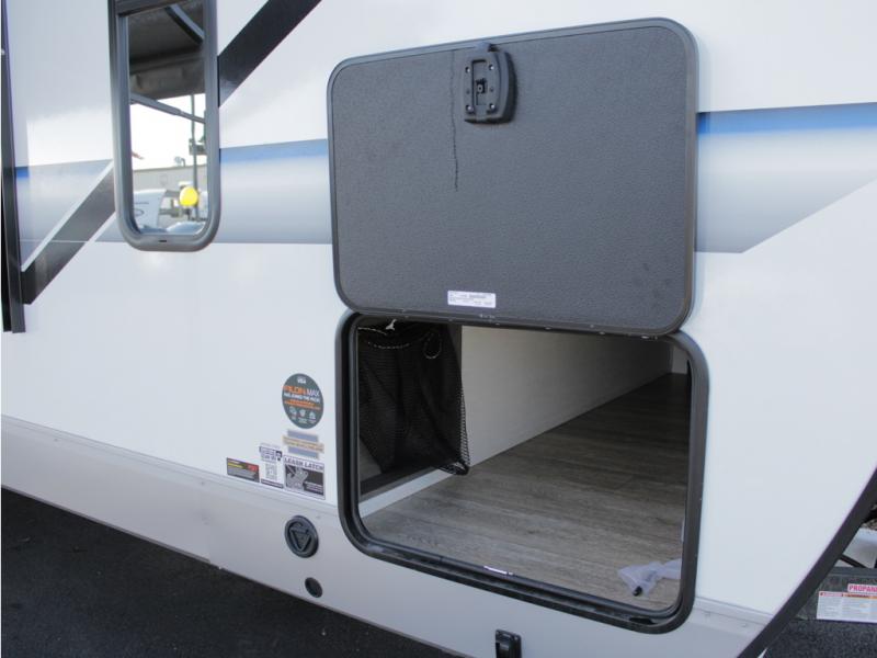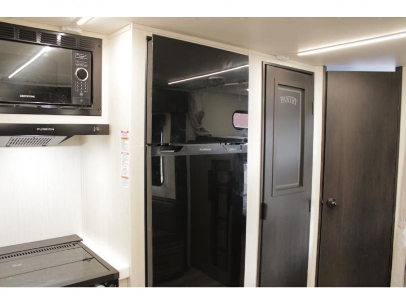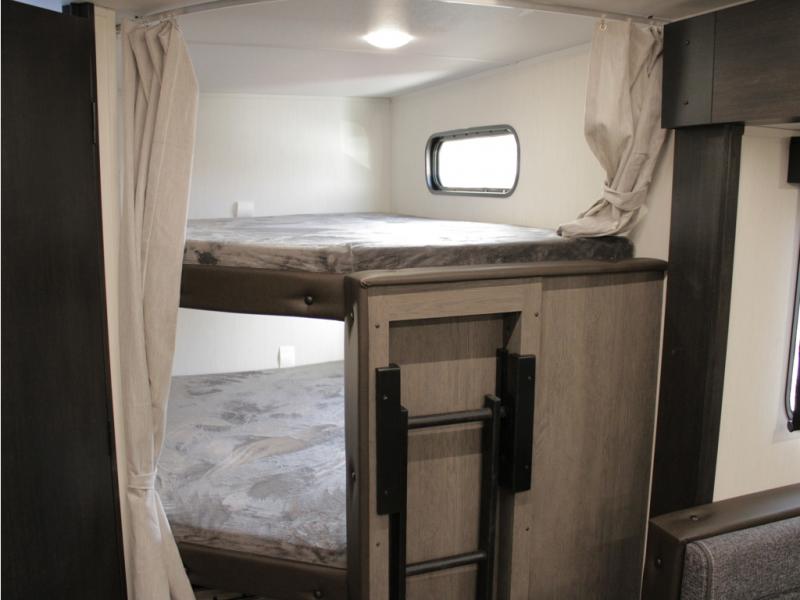 Looking for a multi-sleeper trailer to sleep nine to ten happy campers? You've found it in this dual entry model with an outside kitchen, double-size bunks, and a large slide out! The main living and kitchen area has a U-shaped dinette to utilize as a dining table, game table, work station, and/or an extra sleeping space. You will also find a hidden pantry behind the entertainment center and full kitchen amenities including a large sink and a residential-style refrigerator. The exterior provides a 20' awning for an outdoor living area, outside storage, plus large steps with oversized landing and quick release for convenience. You will also appreciate the Juice Pack that comes with a 100W solar panel, a battery, a 30 AMP solar charger, and more!