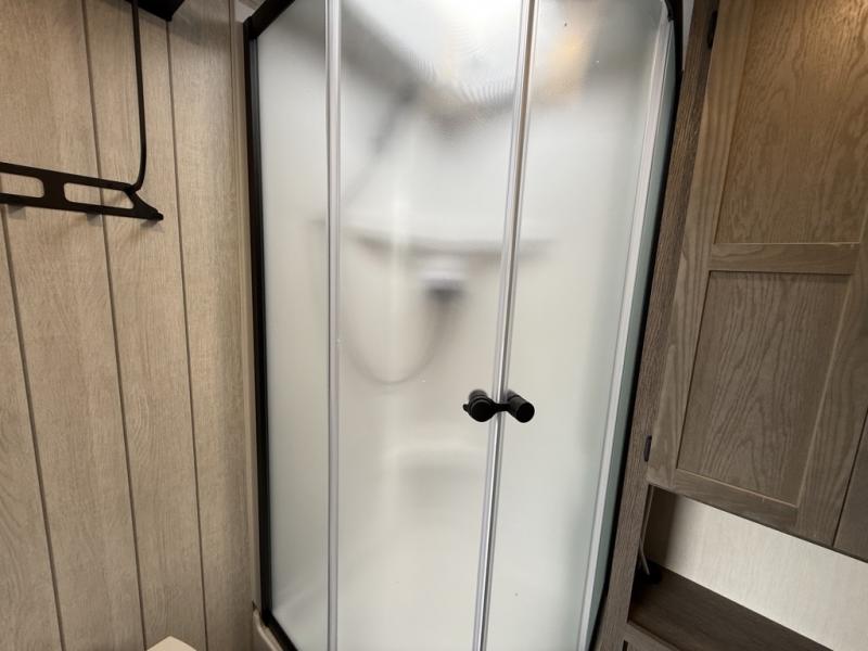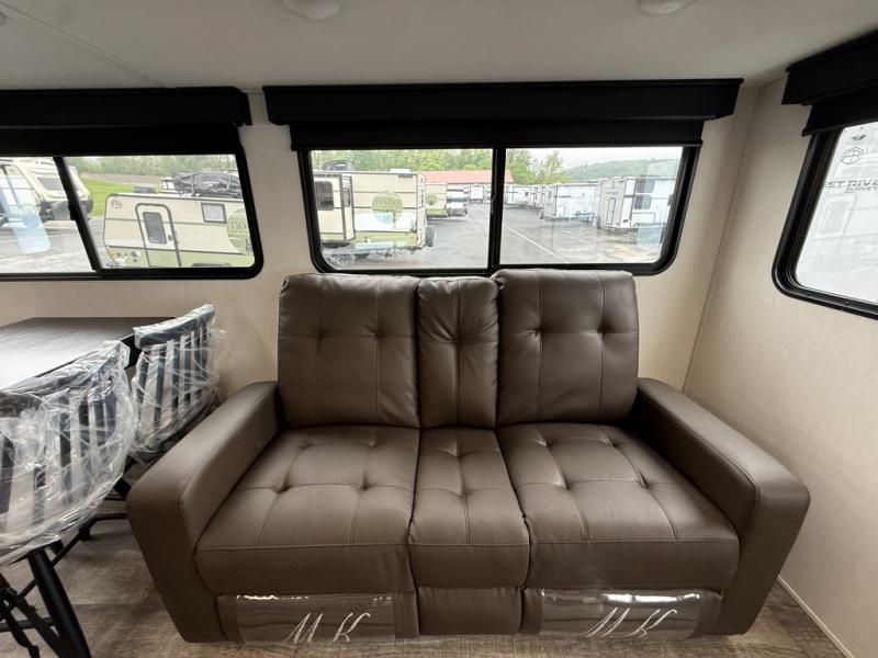 This trailer has it all for maximum comfort and convenience as well as entertainment! The rear living area includes a tri-fold sofa with a rear Pano-Vision window for great views of your campsite, and dual opposing slides widen this area so you can visit with friends. You'll also find theater seating, plus a free-standing table with two chairs and a storage ottoman seat. Enjoy the fireplace on a cool night or when you want a little ambiance while seated inside. Two patio awnings will provide an outdoor living area; just grab your camping chairs from the full pass-through storage. When you want to call it a night, fall quickly to sleep on the queen bed in the front bedroom with easy access to a dual entry bathroom!