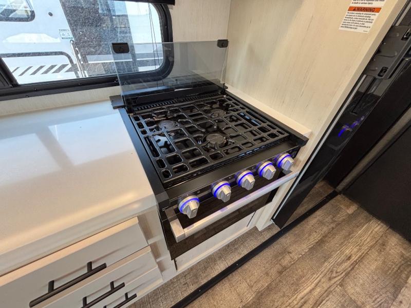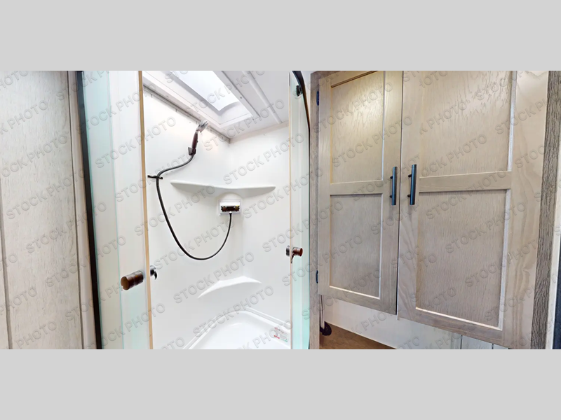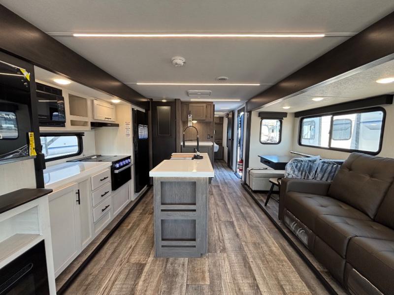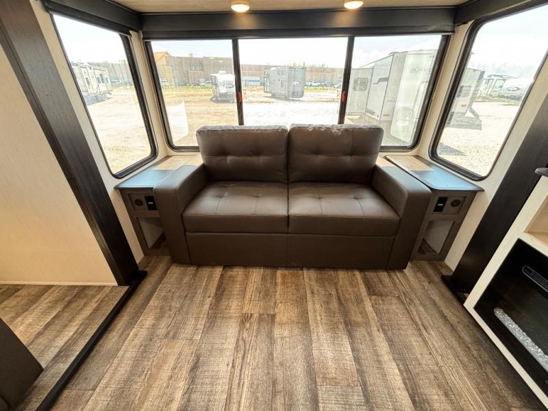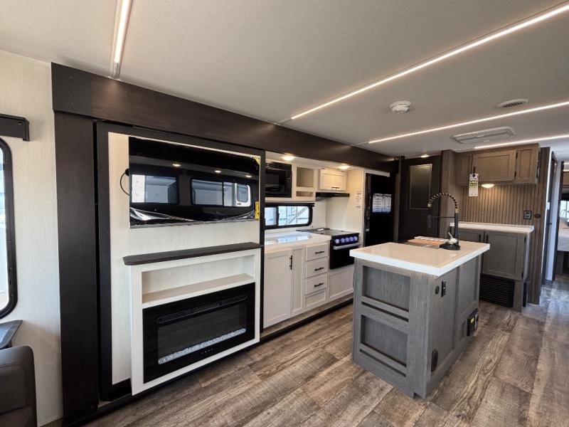 This trailer has it all for maximum comfort and convenience as well as entertainment! The rear living area includes a tri-fold sofa with a rear Pano-Vision window for great views of your campsite, and dual opposing slides widen this area so you can visit with friends. You'll also find theater seating, plus a free-standing table with two chairs and a storage ottoman seat. Enjoy the fireplace on a cool night or when you want a little ambiance while seated inside. Two patio awnings will provide an outdoor living area; just grab your camping chairs from the full pass-through storage. When you want to call it a night, fall quickly to sleep on the queen bed in the front bedroom with easy access to a dual entry bathroom!