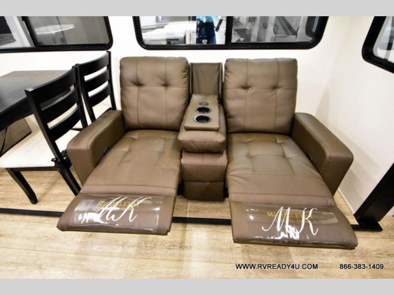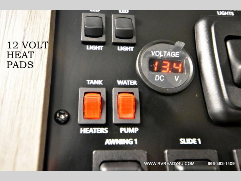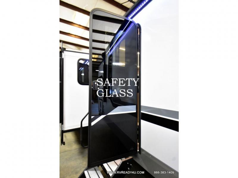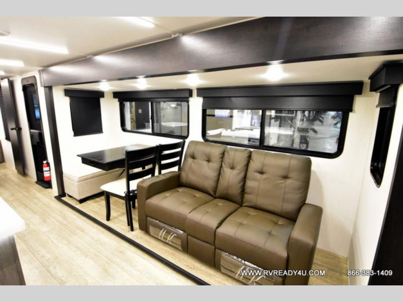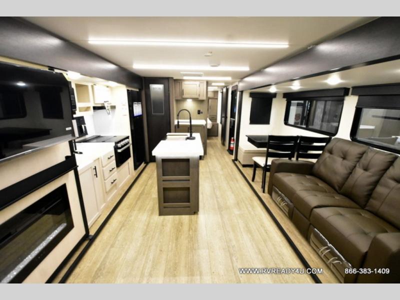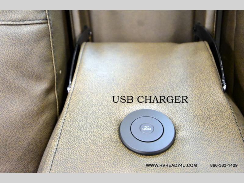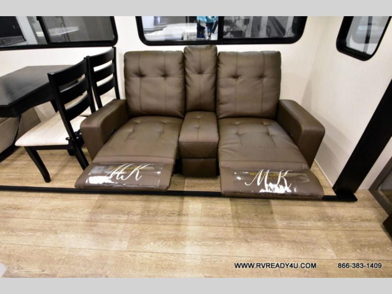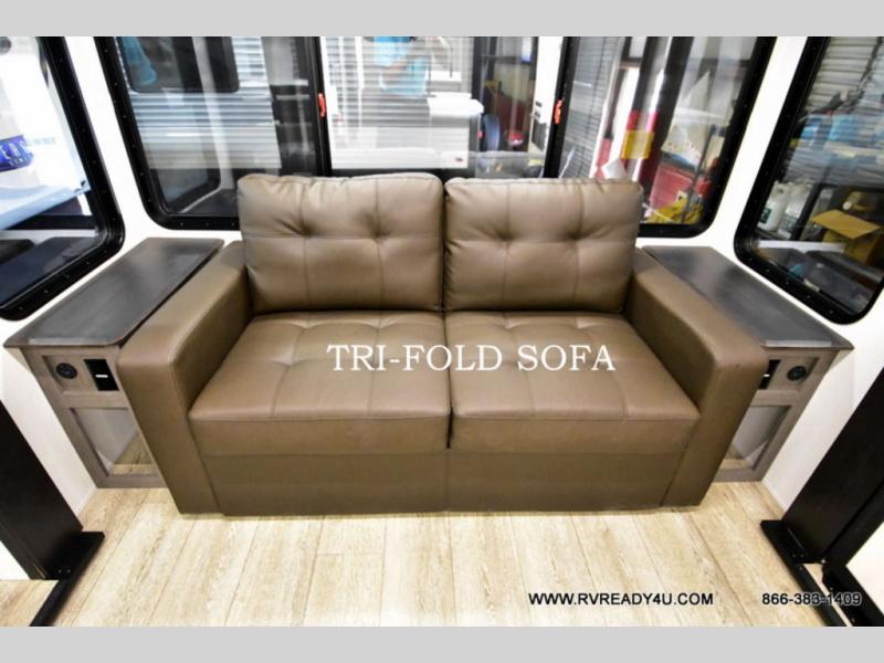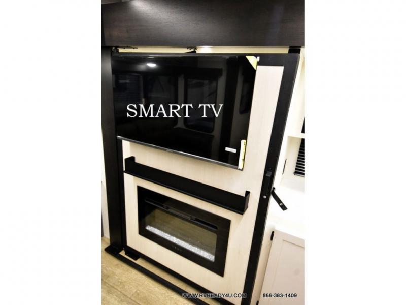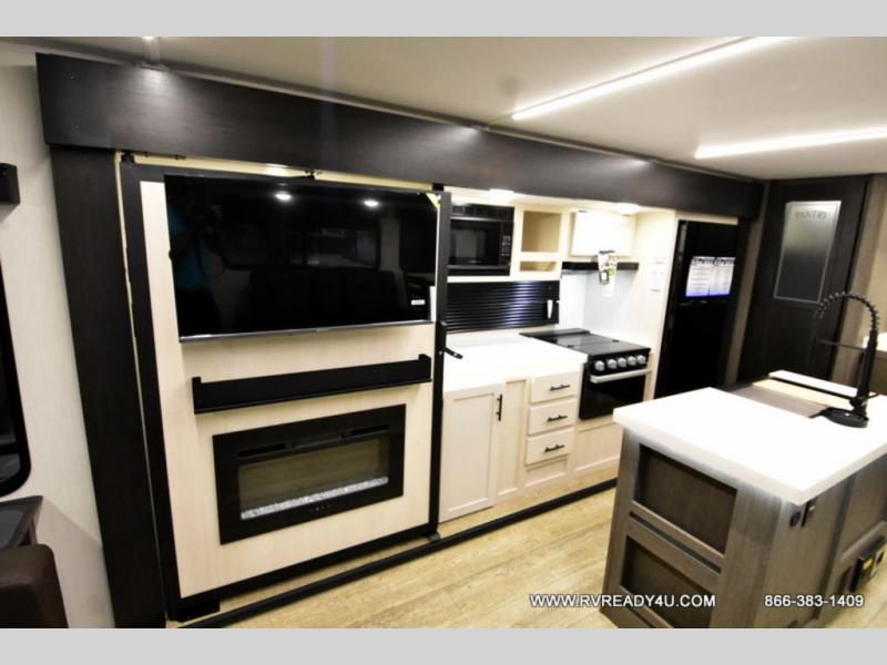 This trailer has it all for maximum comfort and convenience as well as entertainment! The rear living area includes a tri-fold sofa with a rear Pano-Vision window for great views of your campsite, and dual opposing slides widen this area so you can visit with friends. You'll also find theater seating, plus a free-standing table with two chairs and a storage ottoman seat. Enjoy the fireplace on a cool night or when you want a little ambiance while seated inside. Two patio awnings will provide an outdoor living area; just grab your camping chairs from the full pass-through storage. When you want to call it a night, fall quickly to sleep on the queen bed in the front bedroom with easy access to a dual entry bathroom!