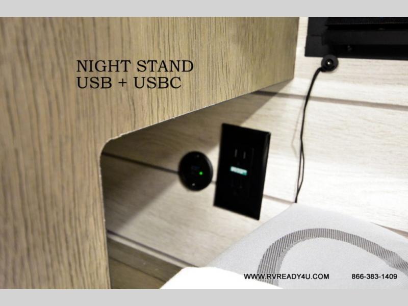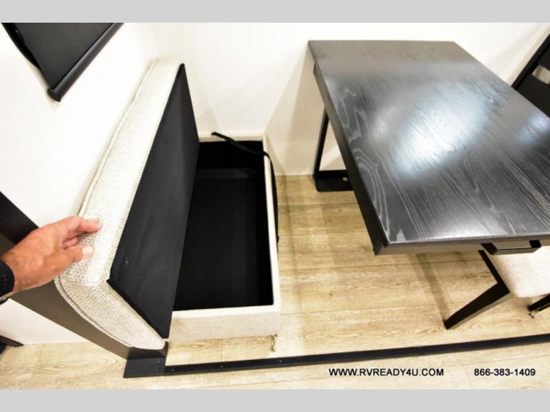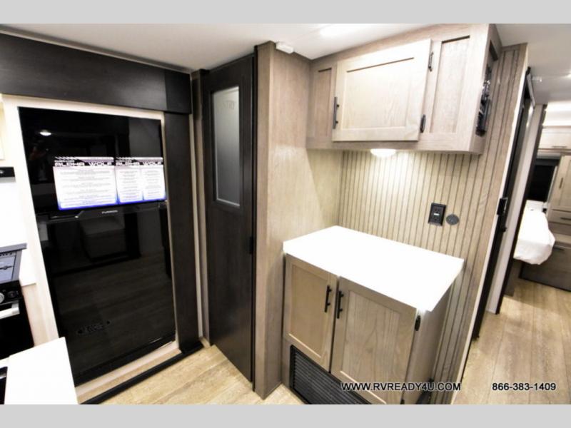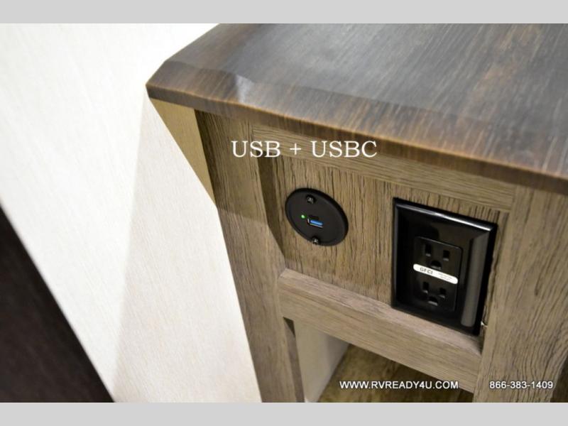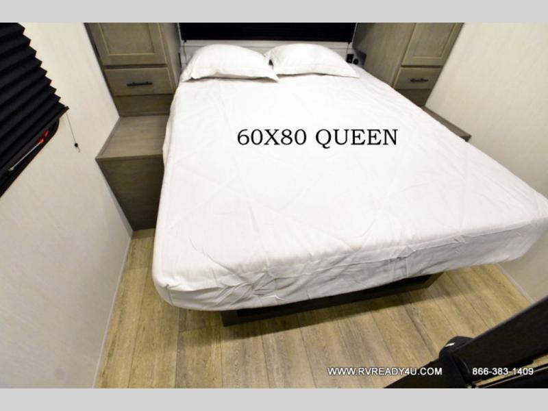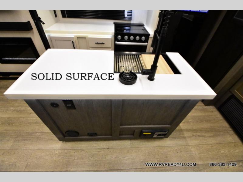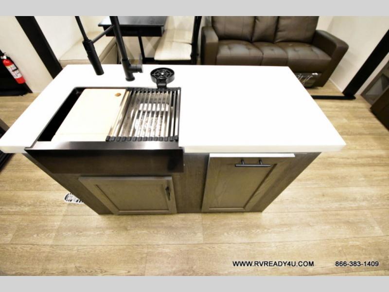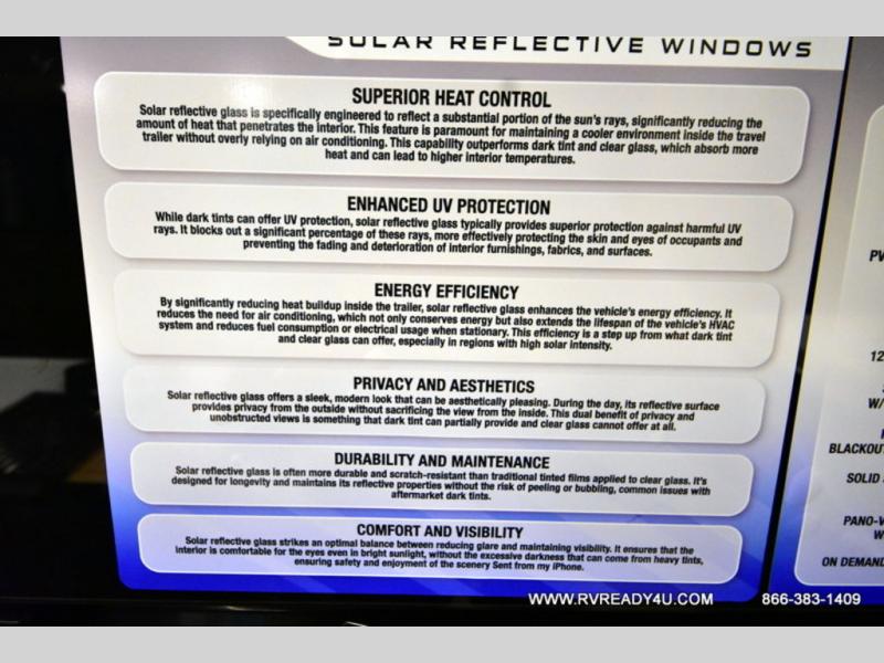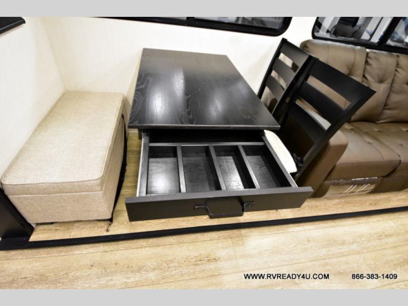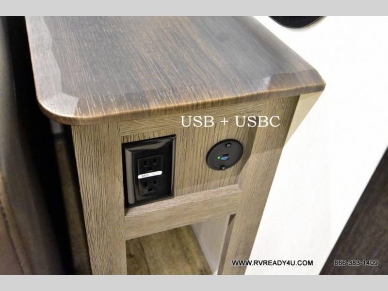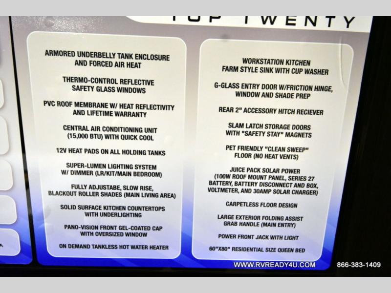 This trailer has it all for maximum comfort and convenience as well as entertainment! The rear living area includes a tri-fold sofa with a rear Pano-Vision window for great views of your campsite, and dual opposing slides widen this area so you can visit with friends. You'll also find theater seating, plus a free-standing table with two chairs and a storage ottoman seat. Enjoy the fireplace on a cool night or when you want a little ambiance while seated inside. Two patio awnings will provide an outdoor living area; just grab your camping chairs from the full pass-through storage. When you want to call it a night, fall quickly to sleep on the queen bed in the front bedroom with easy access to a dual entry bathroom!
