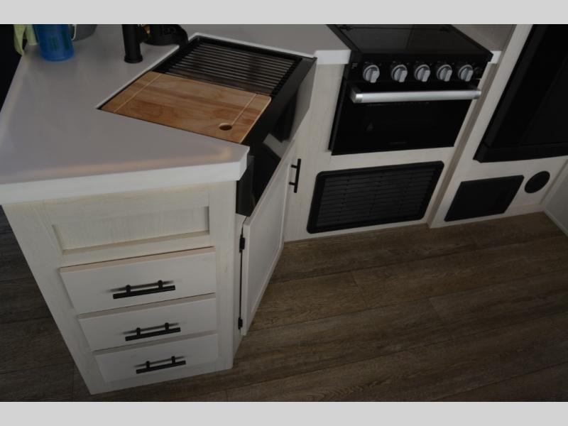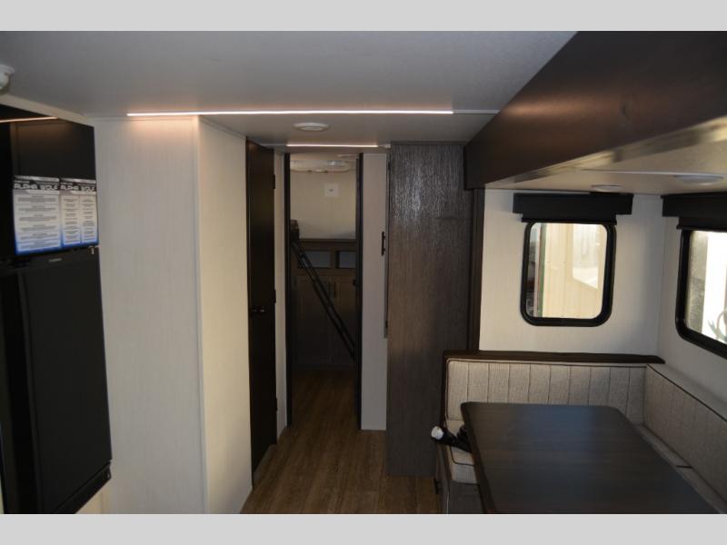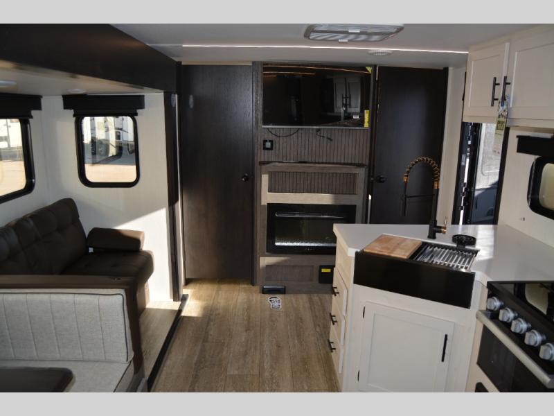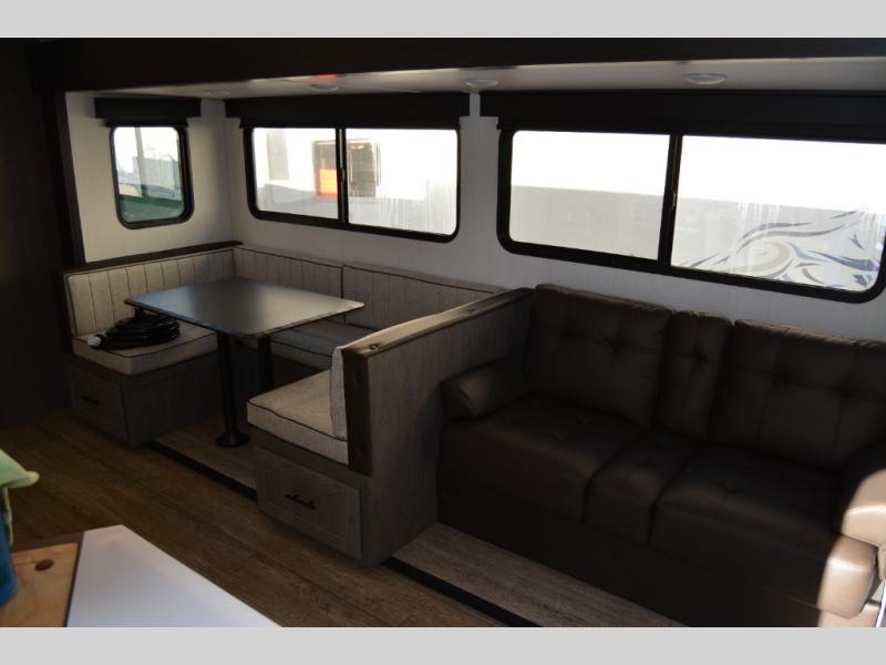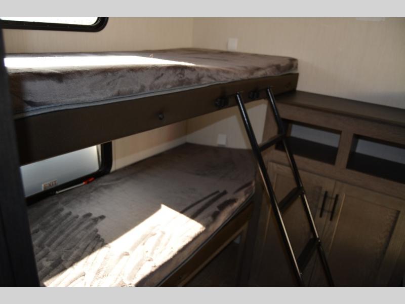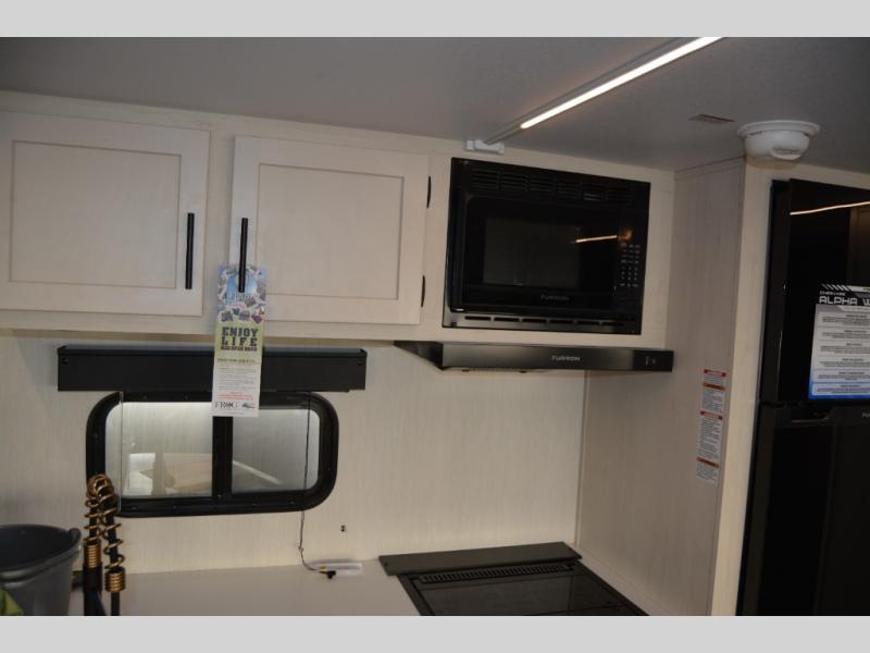Looking for a spacious travel trailer to sleep nine or ten happy campers? You've found it in this Cherokee Alpha Wolf model with a handy outside kitchen, a bunkhouse with a dinette, a front private bedroom, and a large slide out! The main living and kitchen area has a U-shaped dinette to utilize as a dining table, game table, work station, and/or an extra sleeping space. There is also a jackknife sofa for seating, TV watching, or sleeping. From any seating area you can easily view the entertainment center and fireplace which is centered in the unit with doors on either side to the front private bedroom. You will also find a nice pantry and full kitchen amenities including a large sink, and residential-style refrigerator allowing you to easily create meals for your hungry crew. The exterior provides an 18' awning for an outdoor living area over the outside kitchen, and there is ample exterior storage for all of your camping gear like camp chairs, outside games, rugs, and more.