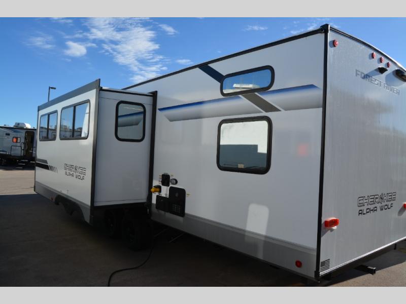 With any Cherokee Alpha Wolf travel trailer by Forest River you'll enjoy outstanding amenities, quality construction, and an affordable price. Each model features a "ToughBend" rigid skirt metal design, 5/8" tongue and groove plywood floor decking, and a "SuperTruss" roof structure that will hold up through years of camping memories. There is a pet friendly "clean sweep" floor design with no heat vents indoors, along with a super lumen lighting system, a 15,000 BTU quick cool central air conditioning, and many more comforts. There are many convenient exterior features such as, Leash Latch pet safety technology, an outside shower with hot and cold water, On The Go rear ladder prep, and exterior steps with oversized landing and quick release. The Weather Guard Package will add protection against the elements with an armored underbelly tank enclosure and forced air heat, thermo-control reflective safety glass windows, and upgraded laminated walls with block foam insulation!