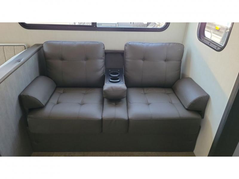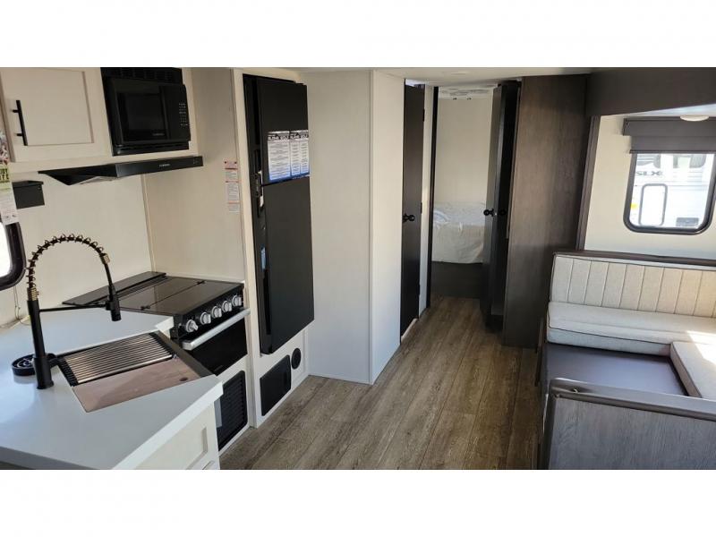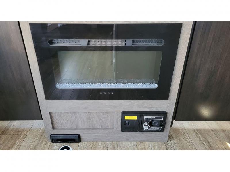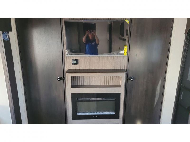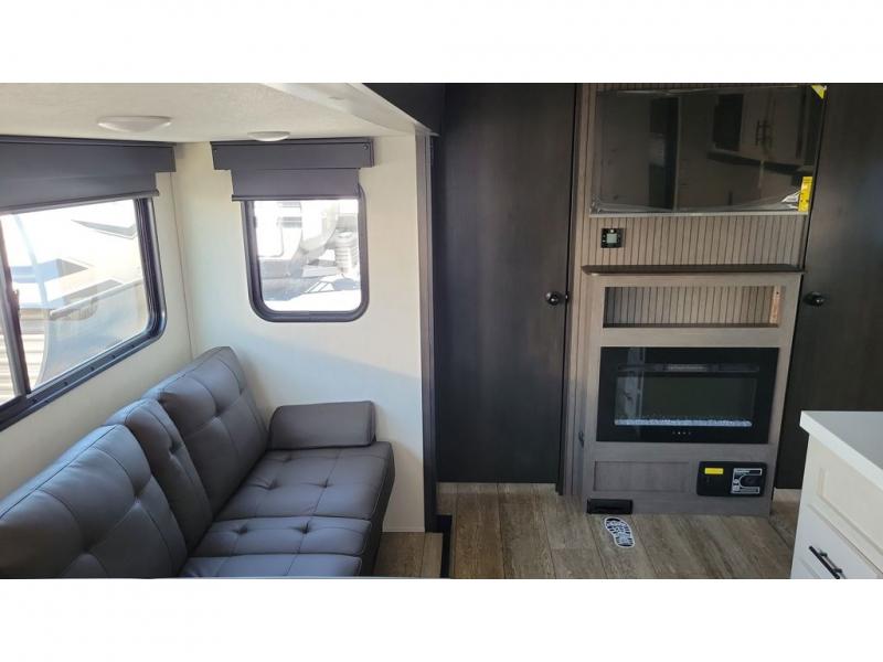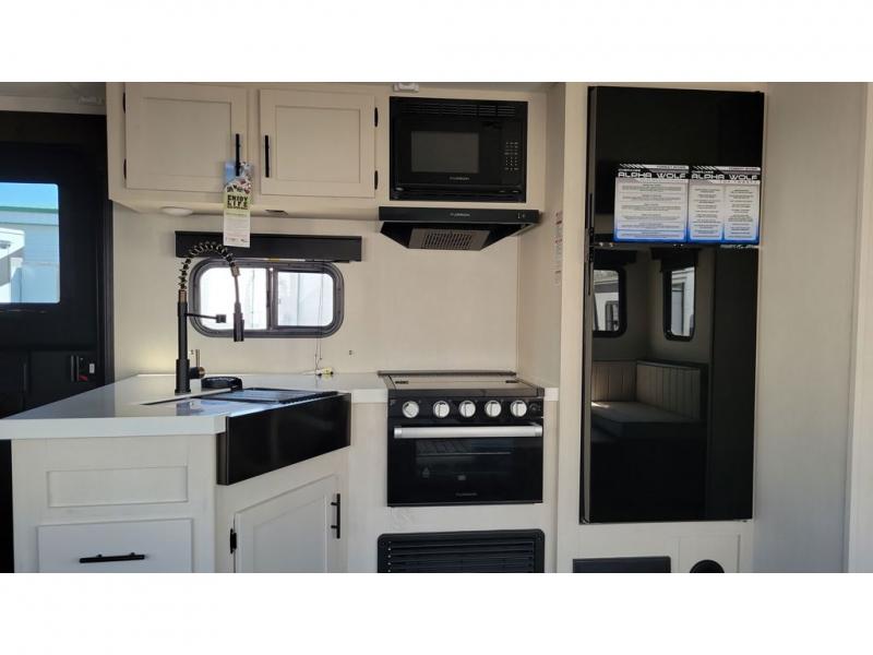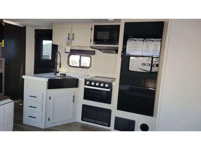 Looking for a spacious travel trailer to sleep nine or ten happy campers? You've found it in this Cherokee Alpha Wolf model with a handy outside kitchen, a bunkhouse with a dinette, a front private bedroom, and a large slide out! The main living and kitchen area has a U-shaped dinette to utilize as a dining table, game table, work station, and/or an extra sleeping space. There is also a jackknife sofa for seating, TV watching, or sleeping. From any seating area you can easily view the entertainment center and fireplace which is centered in the unit with doors on either side to the front private bedroom. You will also find a nice pantry and full kitchen amenities including a large sink, and residential-style refrigerator allowing you to easily create meals for your hungry crew. The exterior provides an 18' awning for an outdoor living area over the outside kitchen, and there is ample exterior storage for all of your camping gear like camp chairs, outside games, rugs, and more.