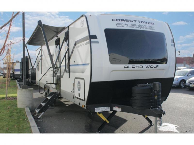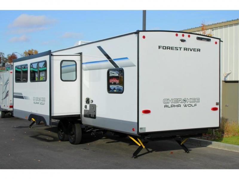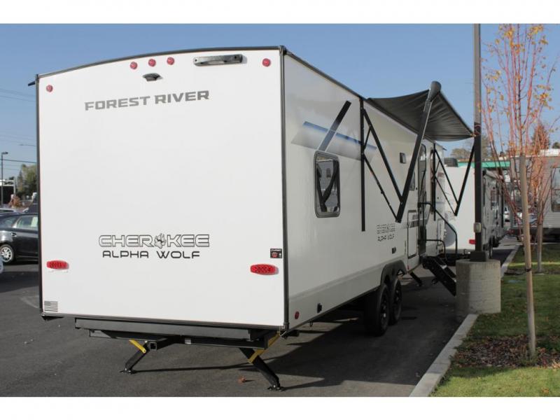 With any Cherokee Alpha Wolf travel trailer by Forest River you'll enjoy outstanding amenities, quality construction, and an affordable price. Each model features a "ToughBend" rigid skirt metal design, 5/8" tongue and groove plywood floor decking, and a "SuperTruss" roof structure that will hold up through years of camping memories. There is a pet friendly "clean sweep" floor design with no heat vents indoors, along with a super lumen lighting system, a 15,000 BTU quick cool central air conditioning, and many more comforts. There are many convenient exterior features such as, Leash Latch pet safety technology, an outside shower with hot and cold water, On The Go rear ladder prep, and exterior steps with oversized landing and quick release. The Weather Guard Package will add protection against the elements with an armored underbelly tank enclosure and forced air heat, thermo-control reflective safety glass windows, and upgraded laminated walls with block foam insulation!