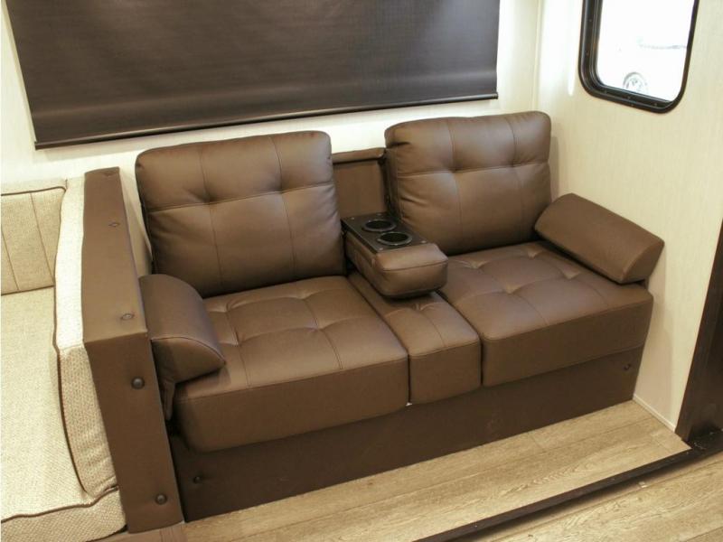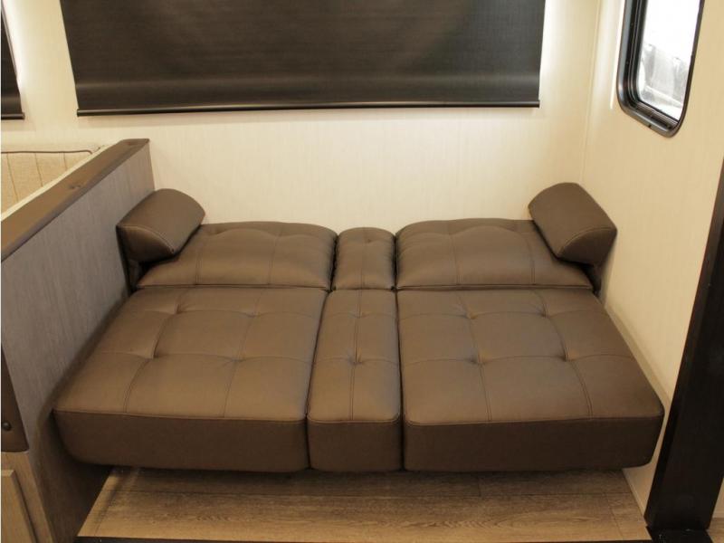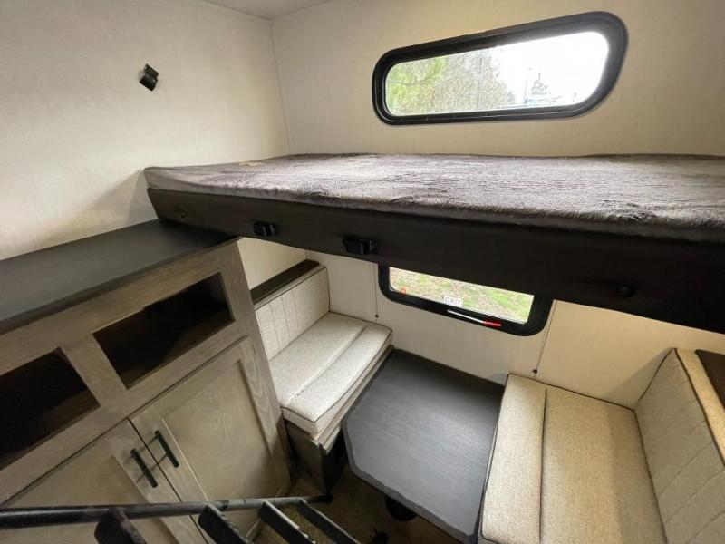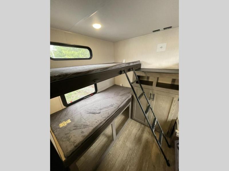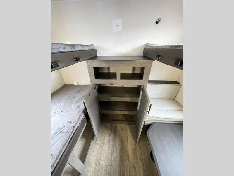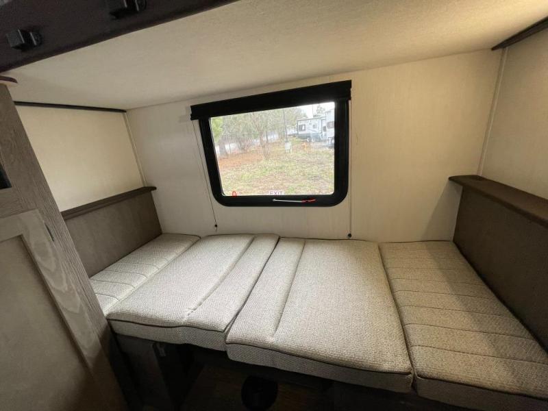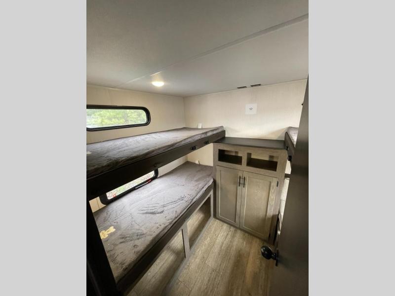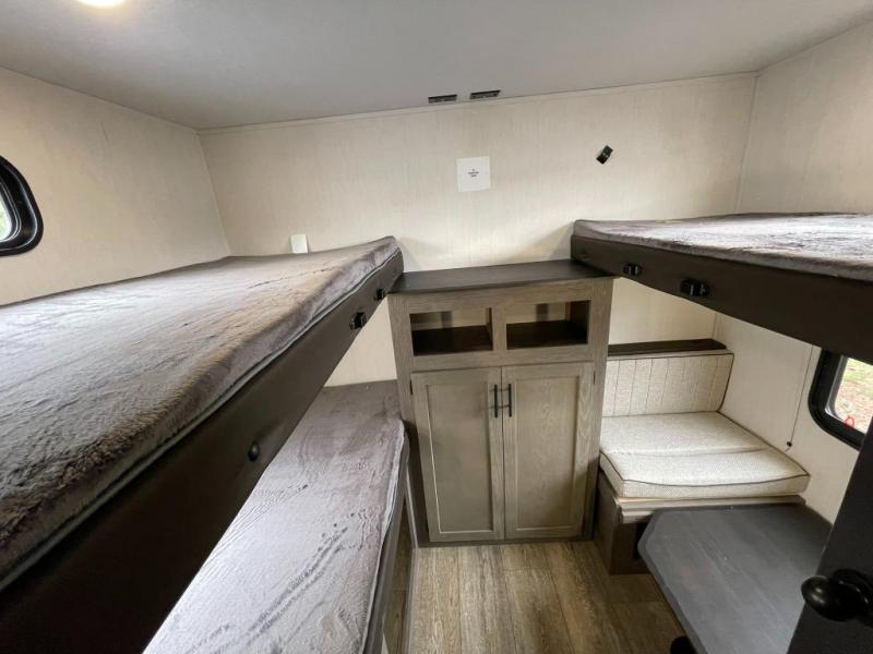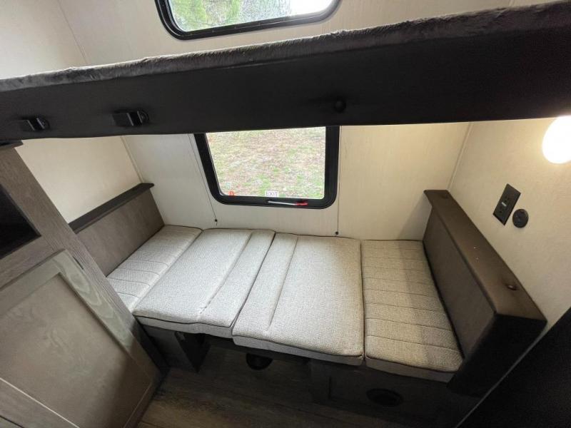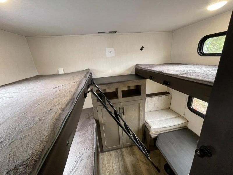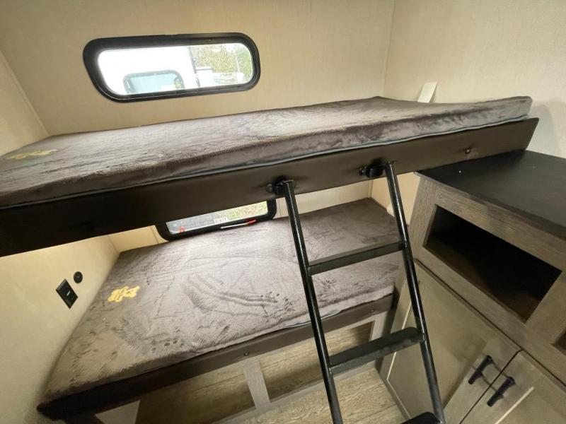 Looking for a spacious travel trailer to sleep nine or ten happy campers? You've found it in this Cherokee Alpha Wolf model with a handy outside kitchen, a bunkhouse with a dinette, a front private bedroom, and a large slide out! The main living and kitchen area has a U-shaped dinette to utilize as a dining table, game table, work station, and/or an extra sleeping space. There is also a jackknife sofa for seating, TV watching, or sleeping. From any seating area you can easily view the entertainment center and fireplace which is centered in the unit with doors on either side to the front private bedroom. You will also find a nice pantry and full kitchen amenities including a large sink, and residential-style refrigerator allowing you to easily create meals for your hungry crew. The exterior provides an 18' awning for an outdoor living area over the outside kitchen, and there is ample exterior storage for all of your camping gear like camp chairs, outside games, rugs, and more.