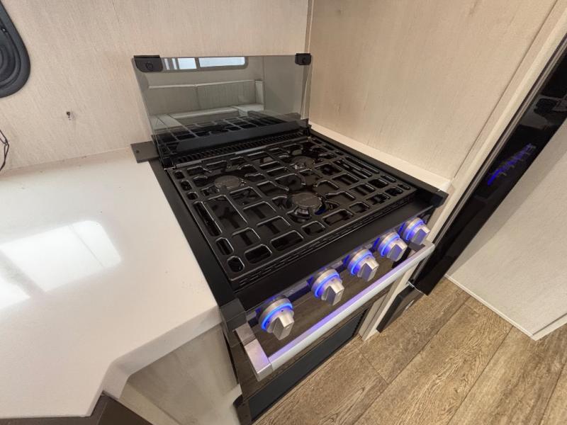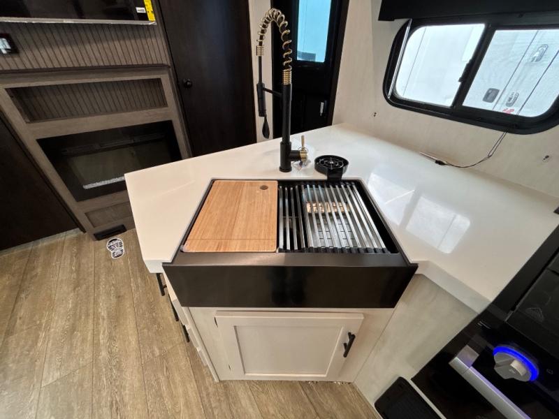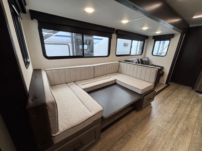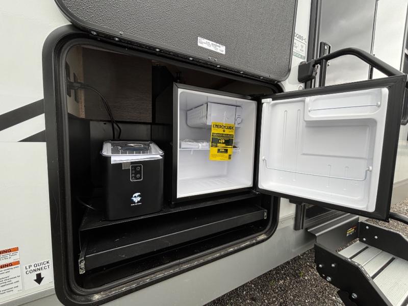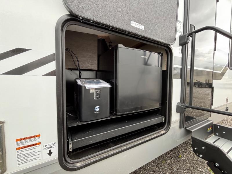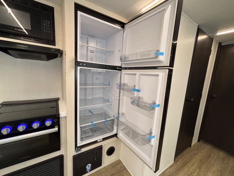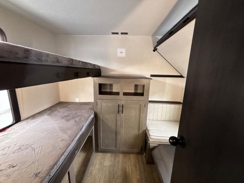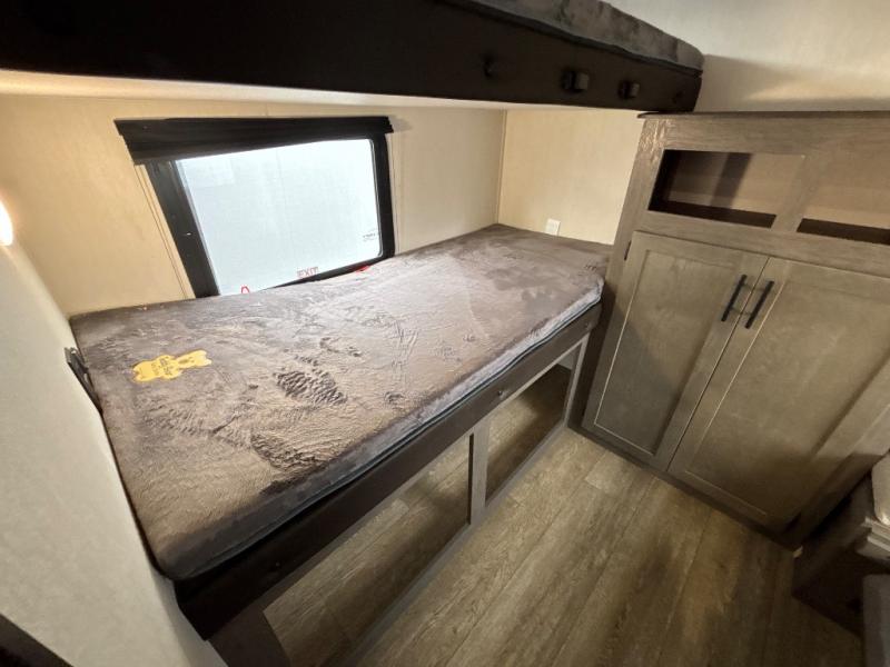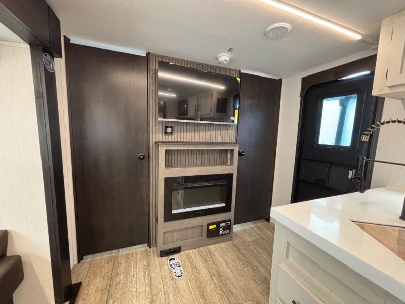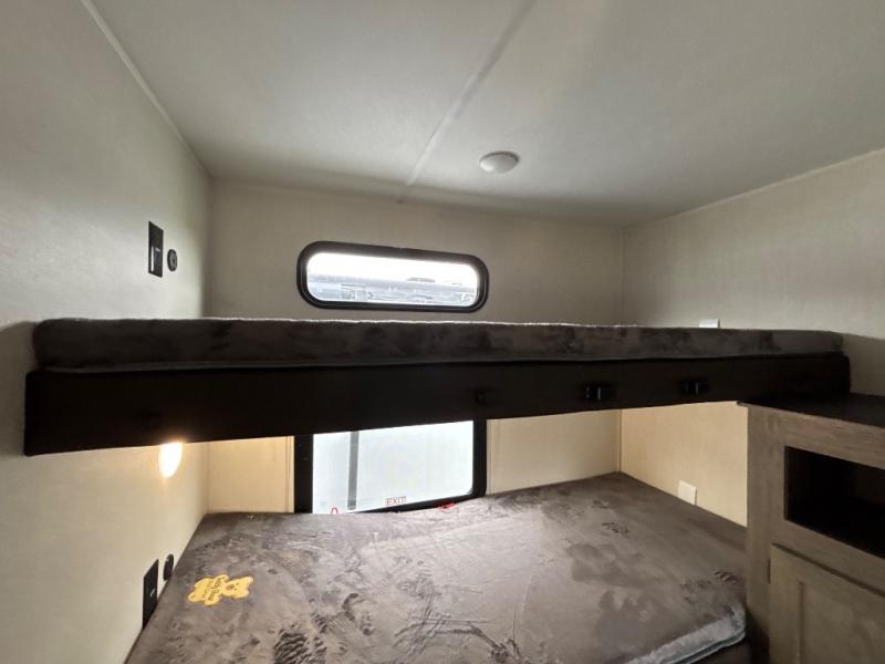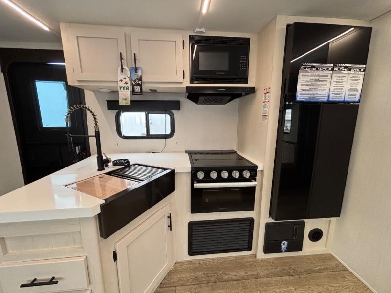 Looking for a spacious travel trailer to sleep nine or ten happy campers? You've found it in this Cherokee Alpha Wolf model with a handy outside kitchen, a bunkhouse with a dinette, a front private bedroom, and a large slide out! The main living and kitchen area has a U-shaped dinette to utilize as a dining table, game table, work station, and/or an extra sleeping space. There is also a jackknife sofa for seating, TV watching, or sleeping. From any seating area you can easily view the entertainment center and fireplace which is centered in the unit with doors on either side to the front private bedroom. You will also find a nice pantry and full kitchen amenities including a large sink, and residential-style refrigerator allowing you to easily create meals for your hungry crew. The exterior provides an 18' awning for an outdoor living area over the outside kitchen, and there is ample exterior storage for all of your camping gear like camp chairs, outside games, rugs, and more.