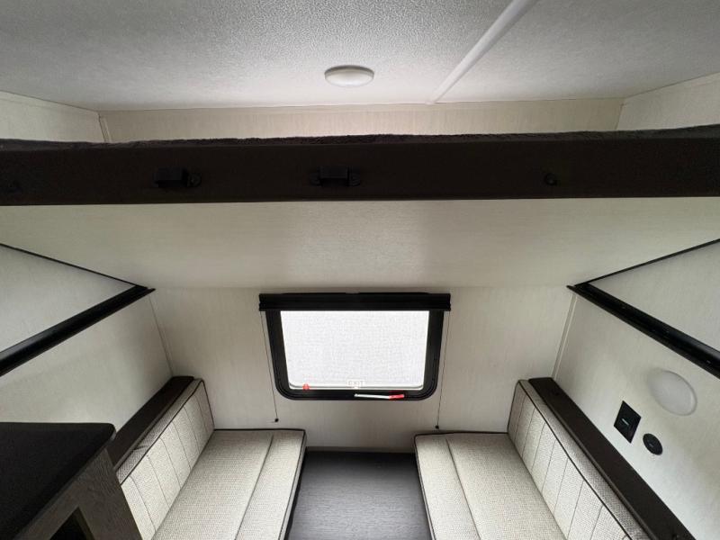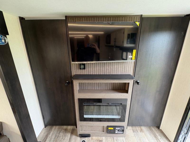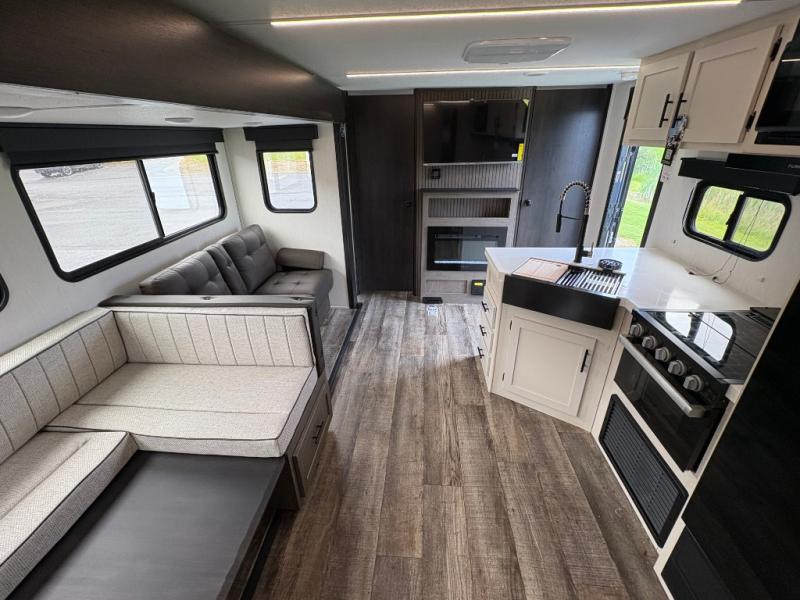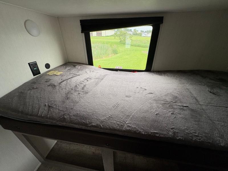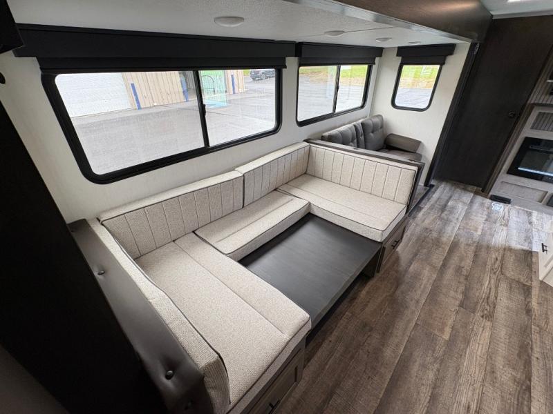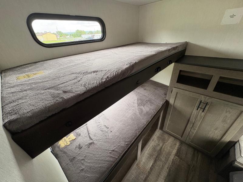 Looking for a spacious travel trailer to sleep nine or ten happy campers? You've found it in this Cherokee Alpha Wolf model with a handy outside kitchen, a bunkhouse with a dinette, a front private bedroom, and a large slide out! The main living and kitchen area has a U-shaped dinette to utilize as a dining table, game table, work station, and/or an extra sleeping space. There is also a jackknife sofa for seating, TV watching, or sleeping. From any seating area you can easily view the entertainment center and fireplace which is centered in the unit with doors on either side to the front private bedroom. You will also find a nice pantry and full kitchen amenities including a large sink, and residential-style refrigerator allowing you to easily create meals for your hungry crew. The exterior provides an 18' awning for an outdoor living area over the outside kitchen, and there is ample exterior storage for all of your camping gear like camp chairs, outside games, rugs, and more.