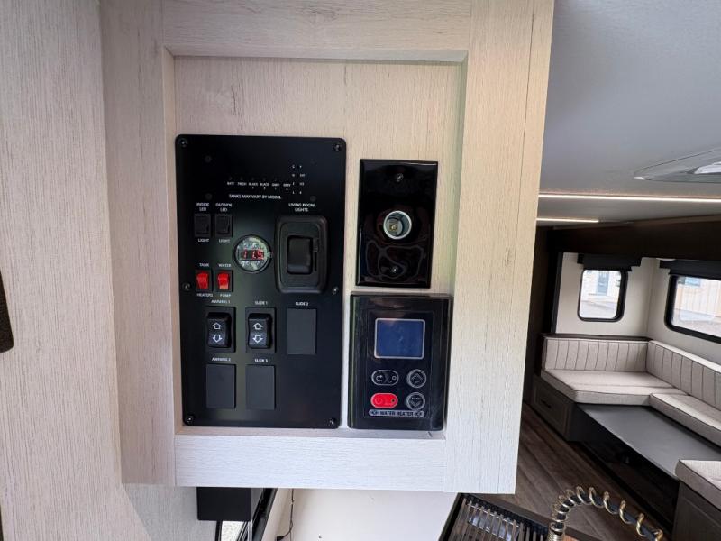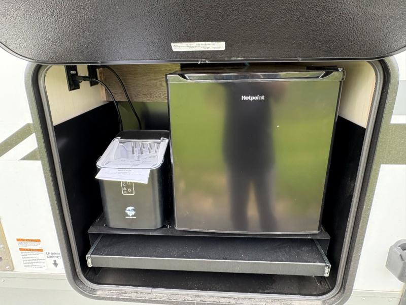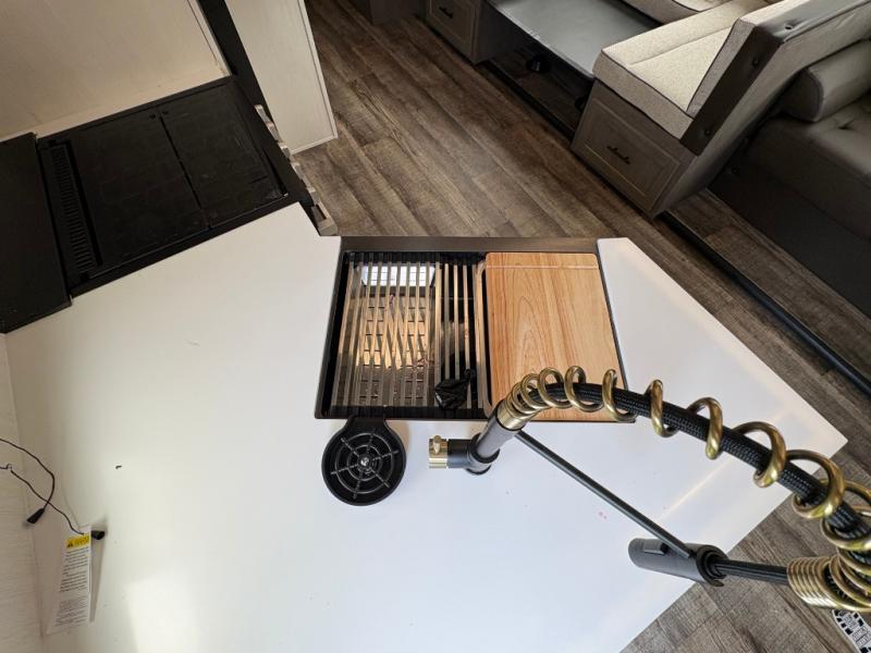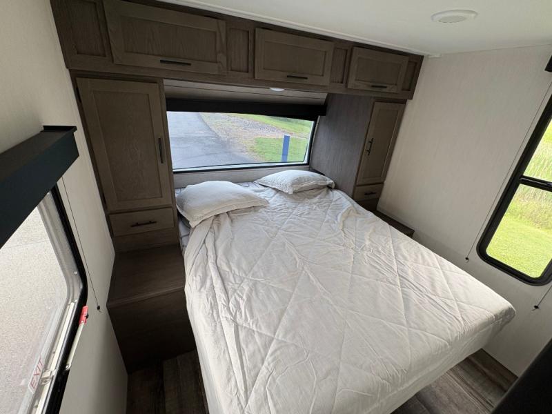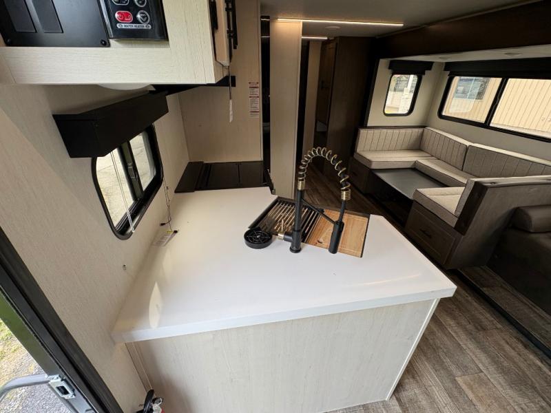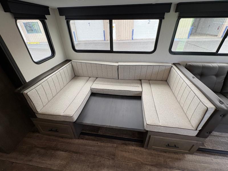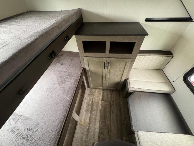 Looking for a spacious travel trailer to sleep nine or ten happy campers? You've found it in this Cherokee Alpha Wolf model with a handy outside kitchen, a bunkhouse with a dinette, a front private bedroom, and a large slide out! The main living and kitchen area has a U-shaped dinette to utilize as a dining table, game table, work station, and/or an extra sleeping space. There is also a jackknife sofa for seating, TV watching, or sleeping. From any seating area you can easily view the entertainment center and fireplace which is centered in the unit with doors on either side to the front private bedroom. You will also find a nice pantry and full kitchen amenities including a large sink, and residential-style refrigerator allowing you to easily create meals for your hungry crew. The exterior provides an 18' awning for an outdoor living area over the outside kitchen, and there is ample exterior storage for all of your camping gear like camp chairs, outside games, rugs, and more.