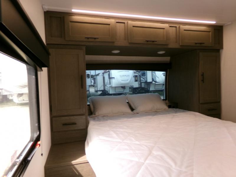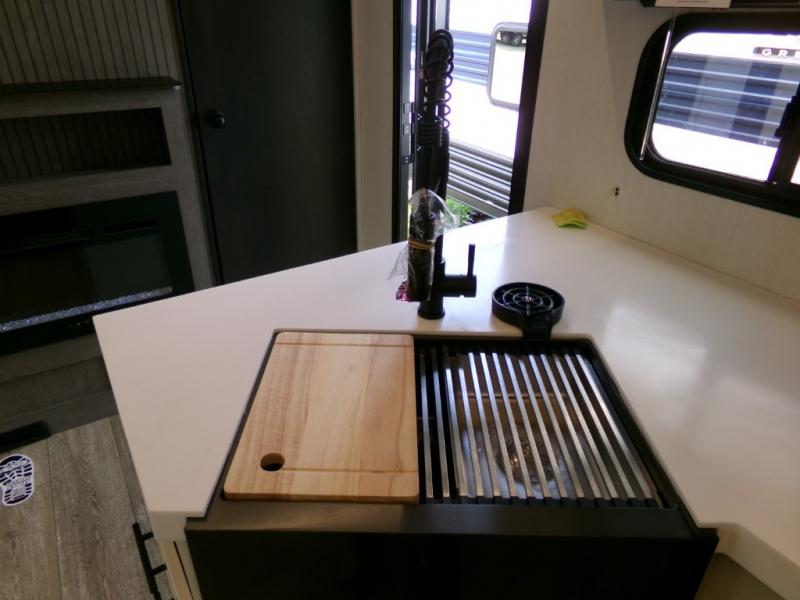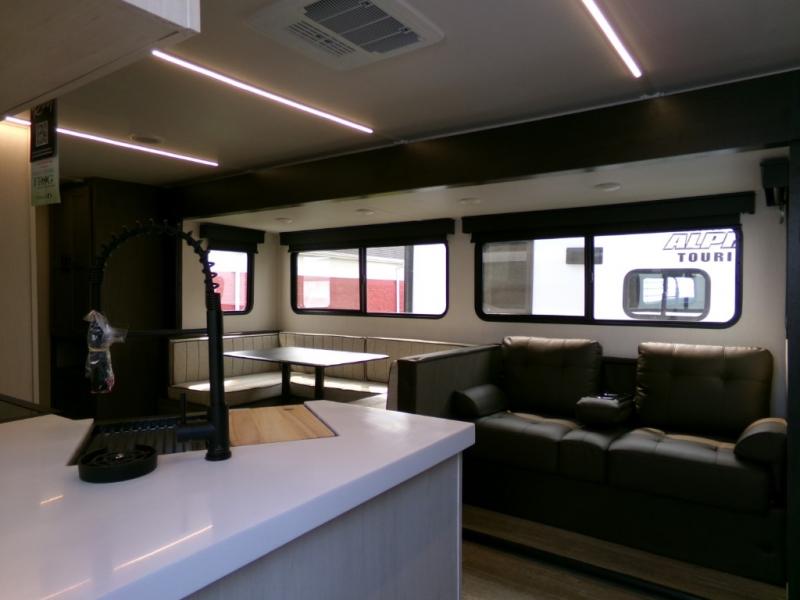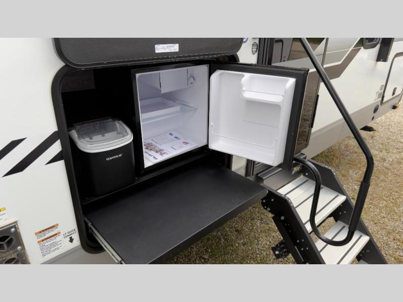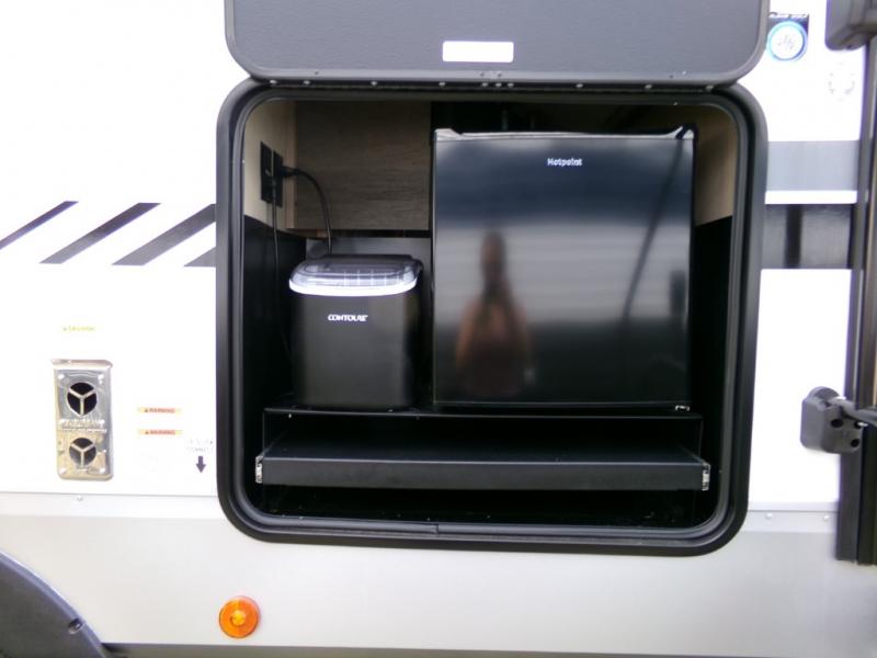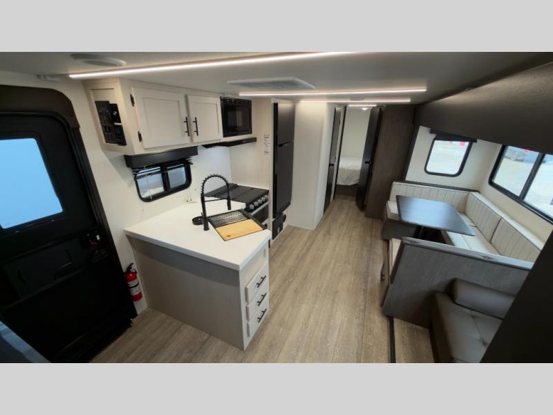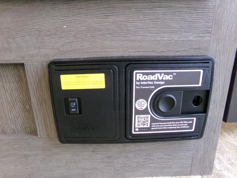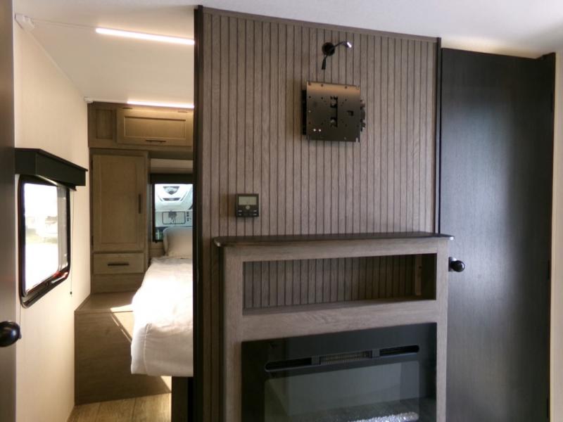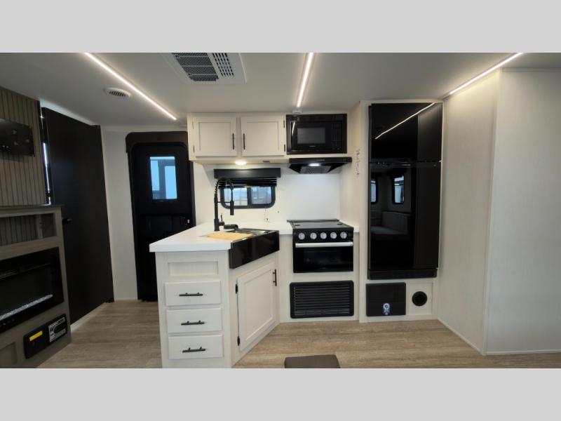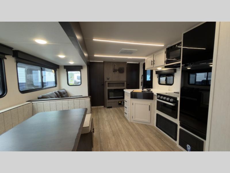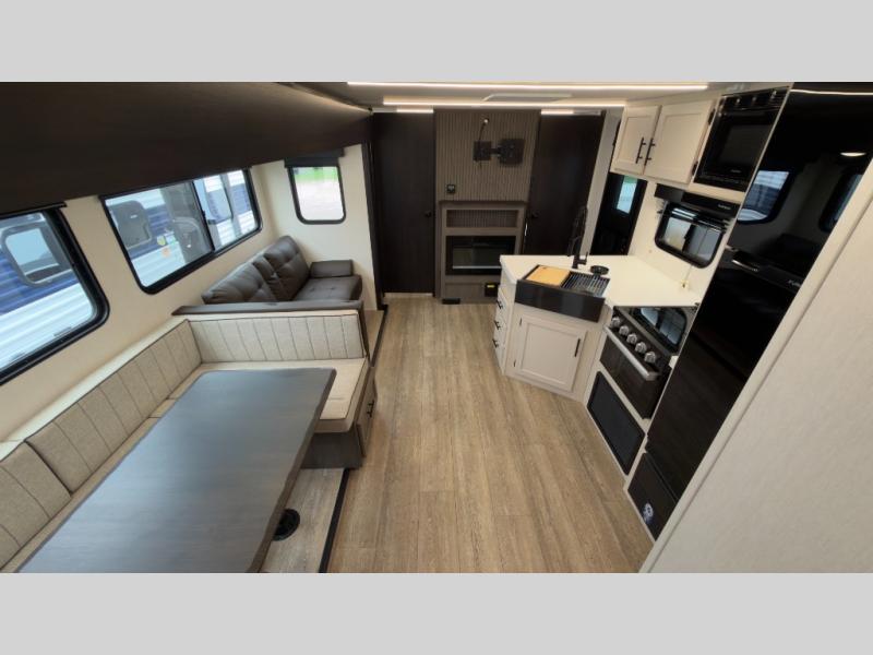 - Key Features: Front queen bedroom with fireplace, rear queen bedroom, U-shaped dinette, residential fridge, convection microwave, outdoor kitchen with fridge & sink, “Juice Pack” 100 W solar package, central vacuum prep, pet-friendly flooring, USB/USB-C charging stations