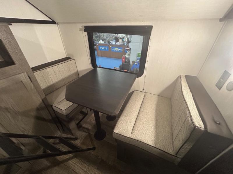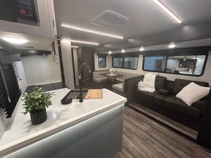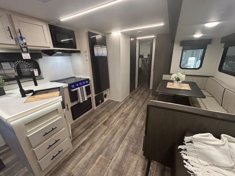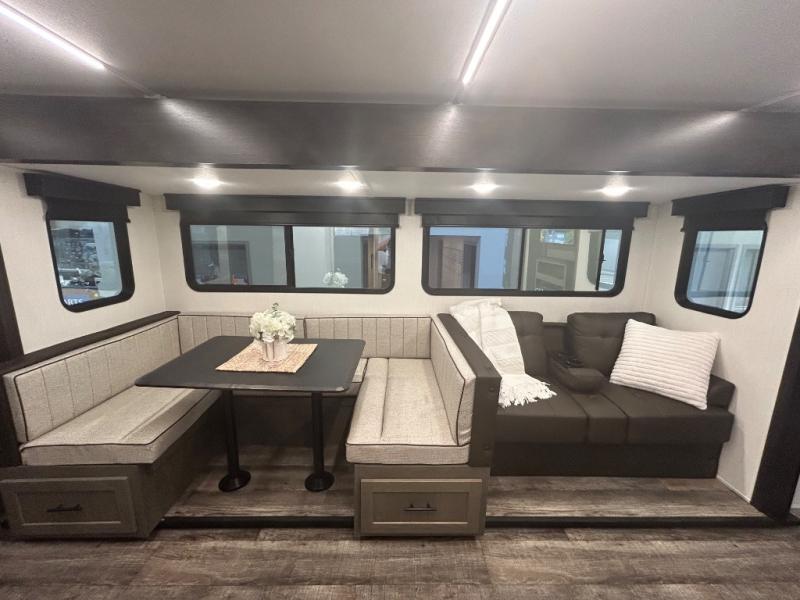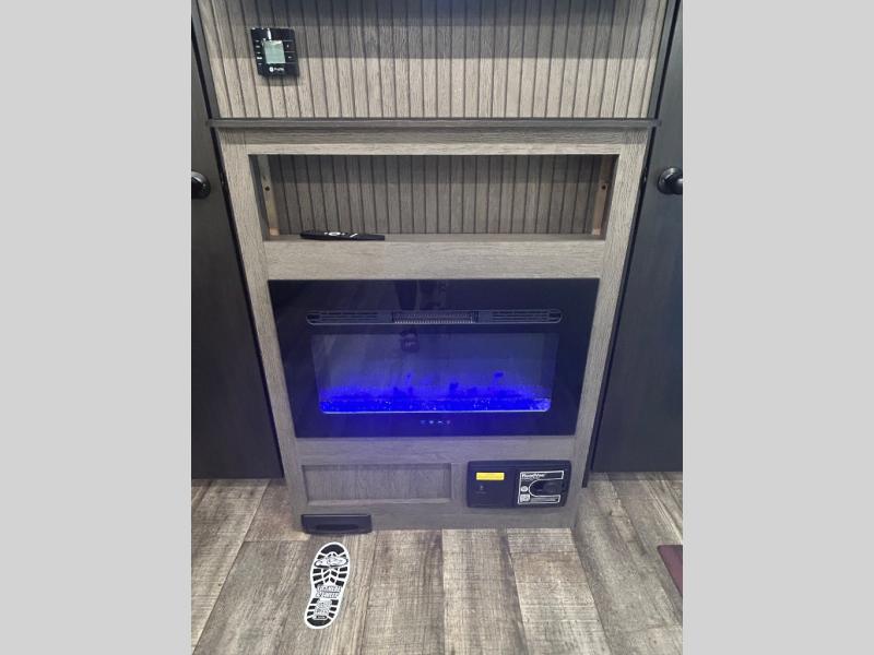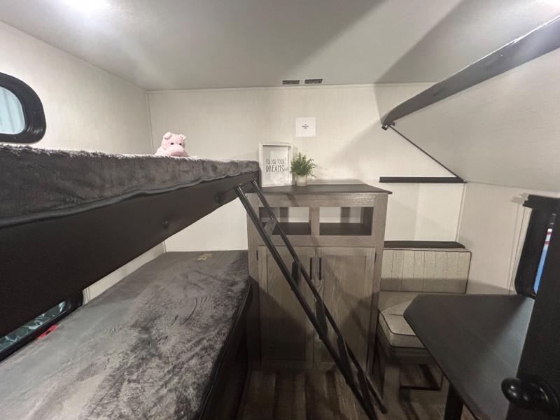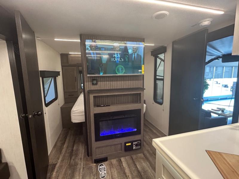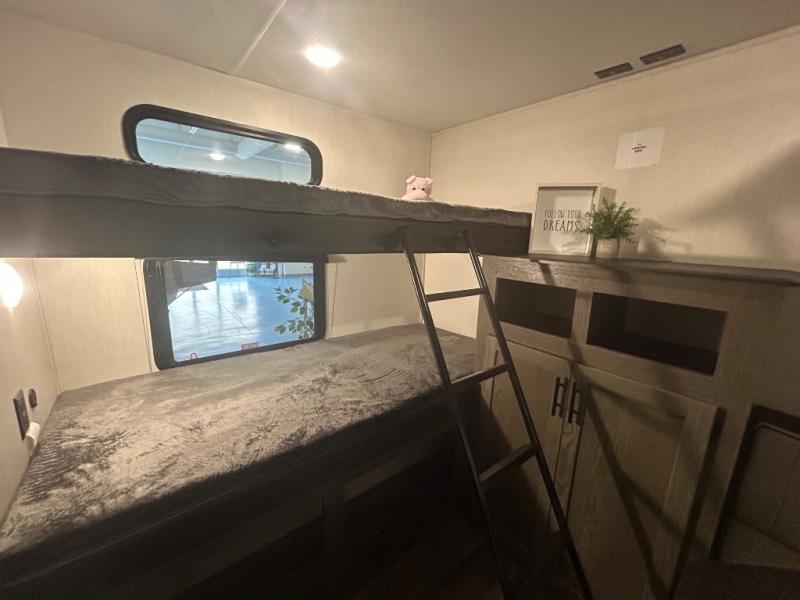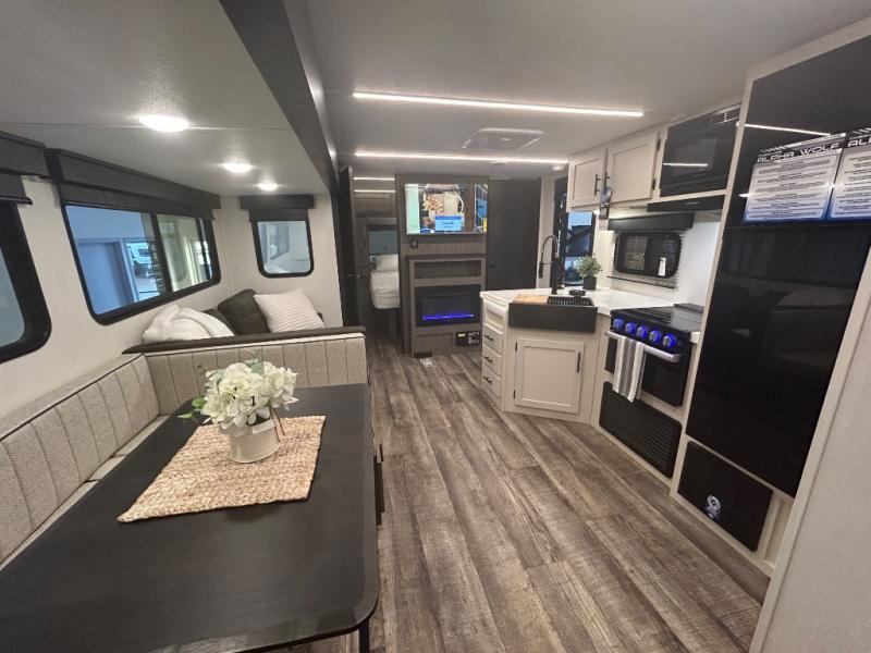 Looking for a spacious travel trailer to sleep nine or ten happy campers? You've found it in this Cherokee Alpha Wolf model with a handy outside kitchen, a bunkhouse with a dinette, a front private bedroom, and a large slide out! The main living and kitchen area has a U-shaped dinette to utilize as a dining table, game table, work station, and/or an extra sleeping space. There is also a jackknife sofa for seating, TV watching, or sleeping. From any seating area you can easily view the entertainment center and fireplace which is centered in the unit with doors on either side to the front private bedroom. You will also find a nice pantry and full kitchen amenities including a large sink, and residential-style refrigerator allowing you to easily create meals for your hungry crew. The exterior provides an 18' awning for an outdoor living area over the outside kitchen, and there is ample exterior storage for all of your camping gear like camp chairs, outside games, rugs, and more.