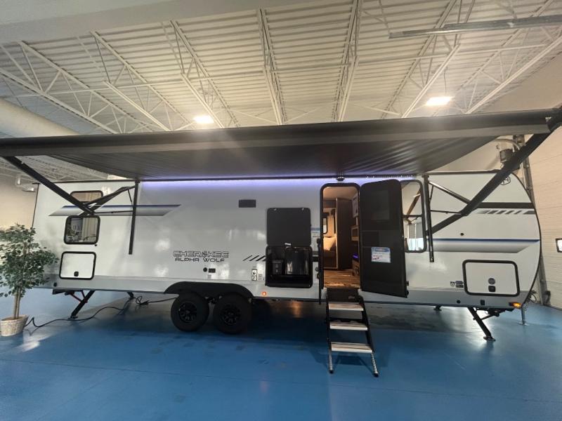 With any Cherokee Alpha Wolf travel trailer by Forest River you'll enjoy outstanding amenities, quality construction, and an affordable price. Each model features a "ToughBend" rigid skirt metal design, 5/8" tongue and groove plywood floor decking, and a "SuperTruss" roof structure that will hold up through years of camping memories. There is a pet friendly "clean sweep" floor design with no heat vents indoors, along with a super lumen lighting system, a 15,000 BTU quick cool central air conditioning, and many more comforts. There are many convenient exterior features such as, Leash Latch pet safety technology, an outside shower with hot and cold water, On The Go rear ladder prep, and exterior steps with oversized landing and quick release. The Weather Guard Package will add protection against the elements with an armored underbelly tank enclosure and forced air heat, thermo-control reflective safety glass windows, and upgraded laminated walls with block foam insulation!