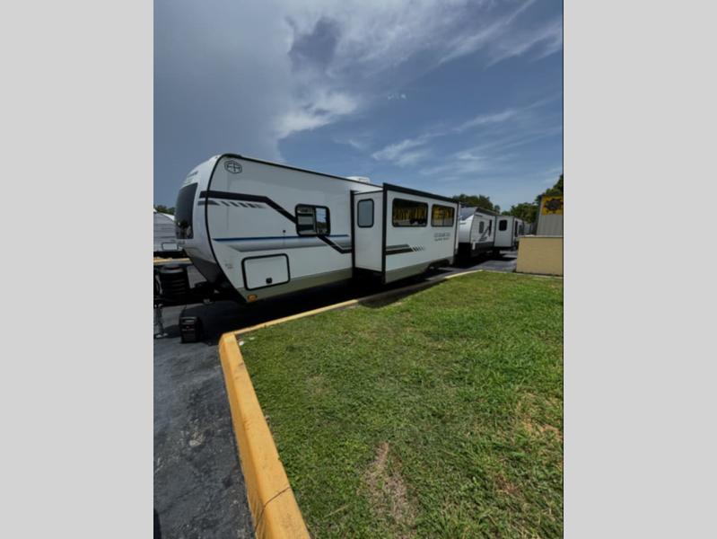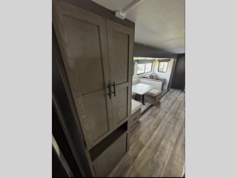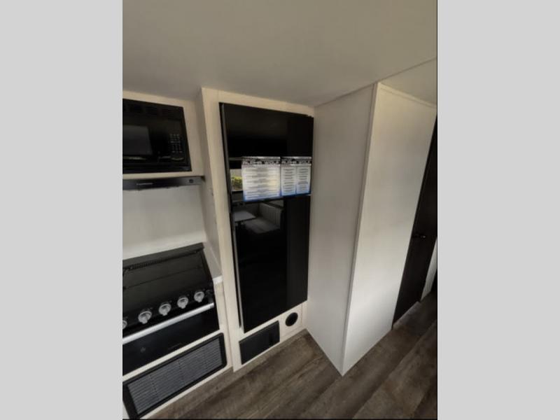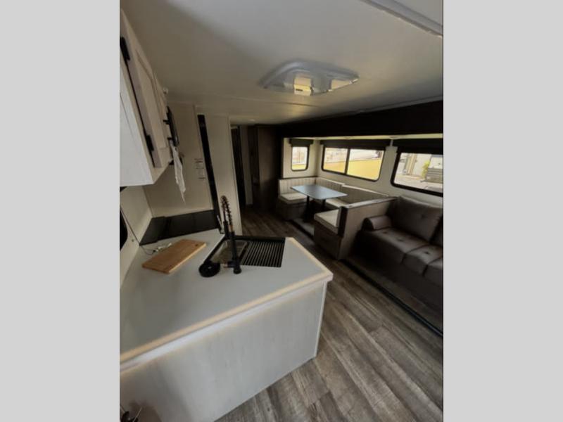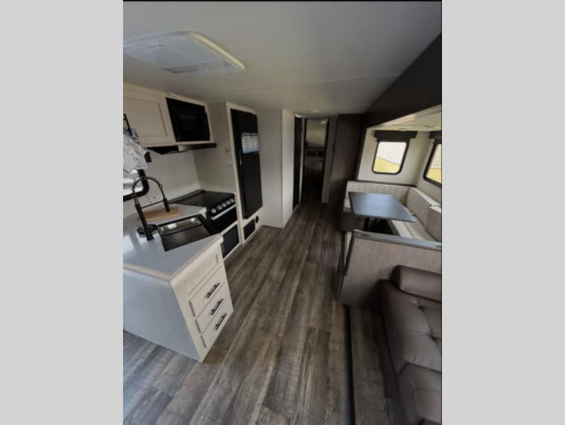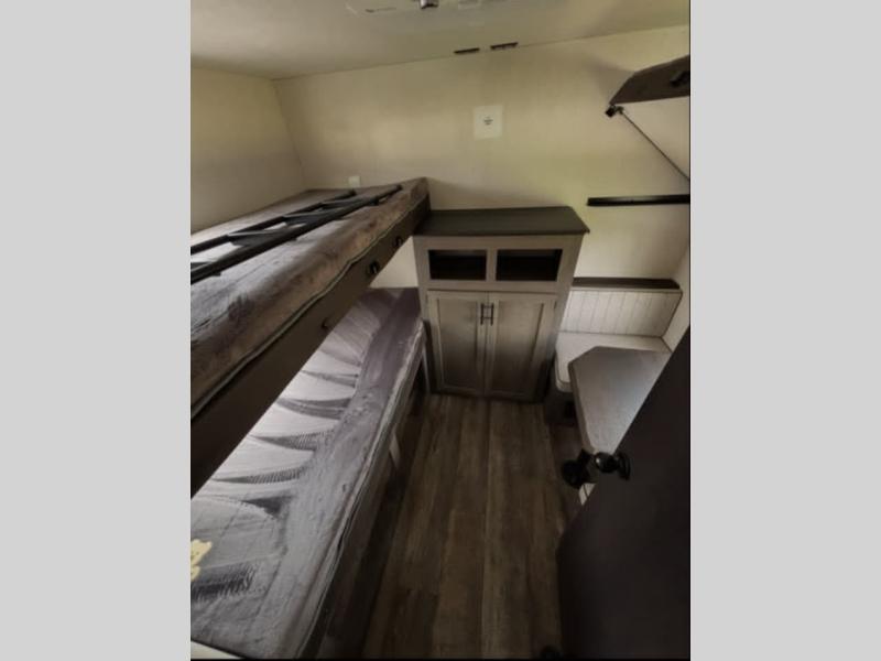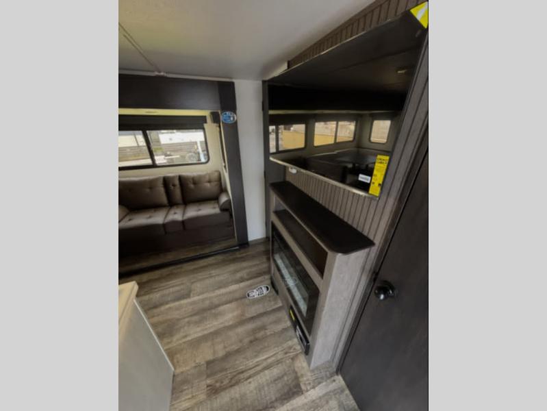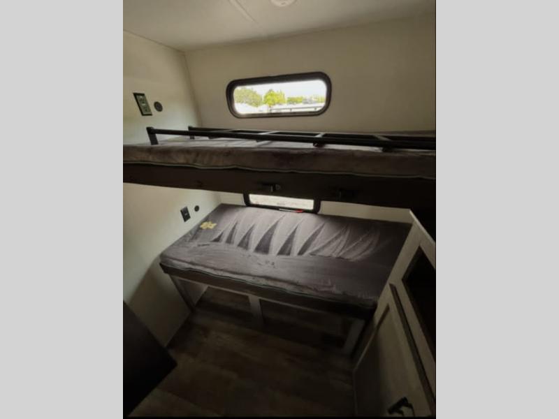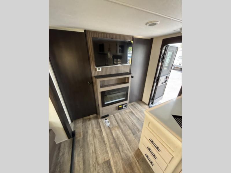 Looking for a spacious travel trailer to sleep nine or ten happy campers? You've found it in this Cherokee Alpha Wolf model with a handy outside kitchen, a bunkhouse with a dinette, a front private bedroom, and a large slide out! The main living and kitchen area has a U-shaped dinette to utilize as a dining table, game table, work station, and/or an extra sleeping space. There is also a jackknife sofa for seating, TV watching, or sleeping. From any seating area you can easily view the entertainment center and fireplace which is centered in the unit with doors on either side to the front private bedroom. You will also find a nice pantry and full kitchen amenities including a large sink, and residential-style refrigerator allowing you to easily create meals for your hungry crew. The exterior provides an 18' awning for an outdoor living area over the outside kitchen, and there is ample exterior storage for all of your camping gear like camp chairs, outside games, rugs, and more.