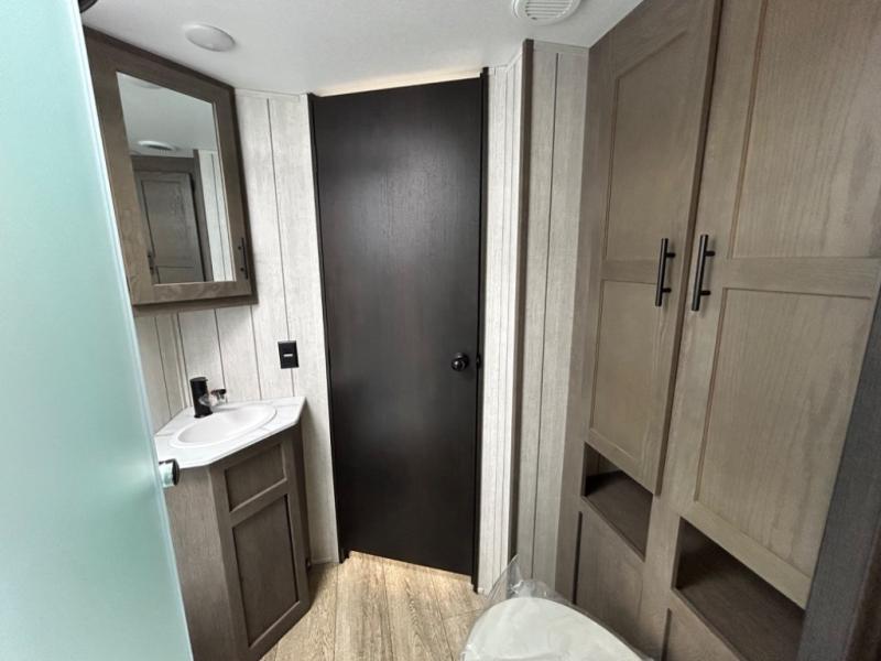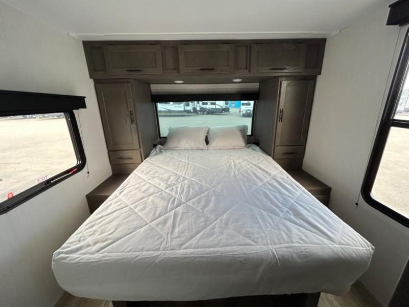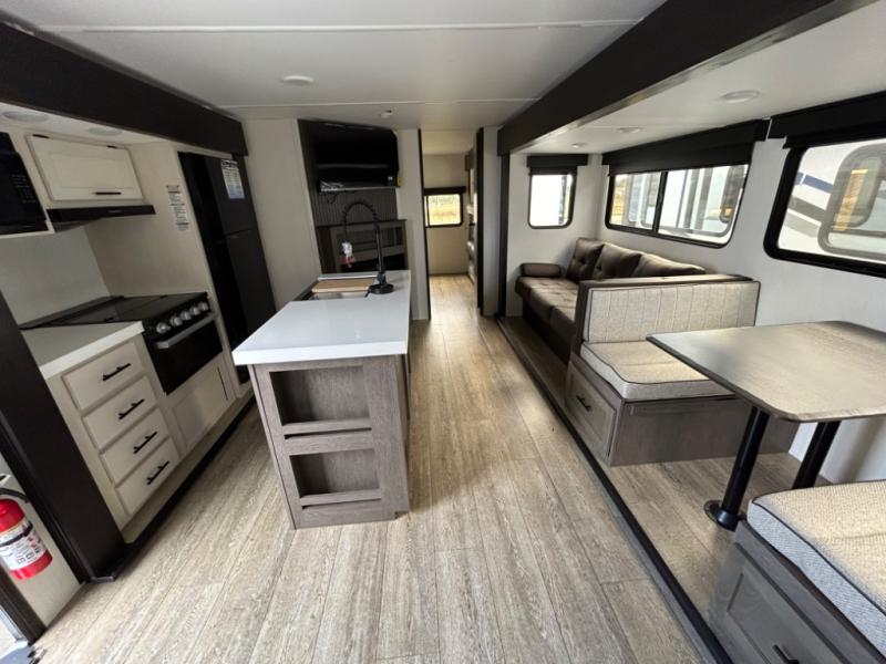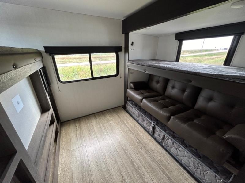 Load up your clothes, food, and outdoor gear to enjoy a long weekend away from the city in this travel trailer! There are triple slide outs, a private bunkhouse with a half bathroom with a second exterior entry/door for convenience, plus an outside kitchen, complete with ice! The bunkhouse also has two bunks, a jackknife sofa and a trundle bed, plus a slide out for more interior floor space. The main living and kitchen area is spacious as well with two opposing slides, a kitchen island with a large sink, a pantry, plus a cozy fireplace. The full walk-through bathroom allows double access, and the front bedroom allows you to sleep like royalty.