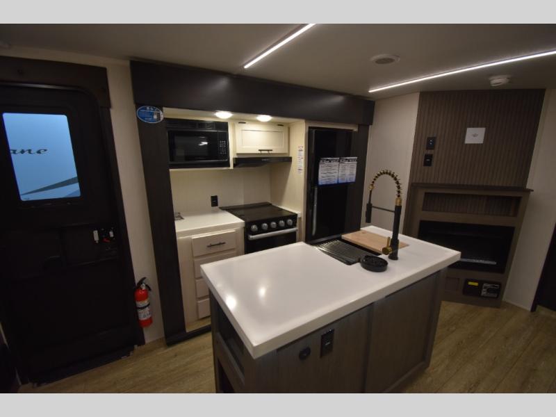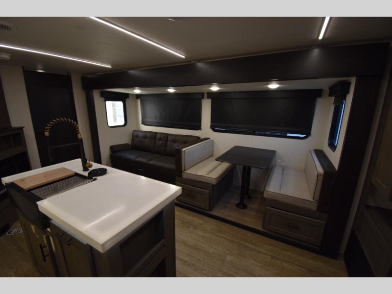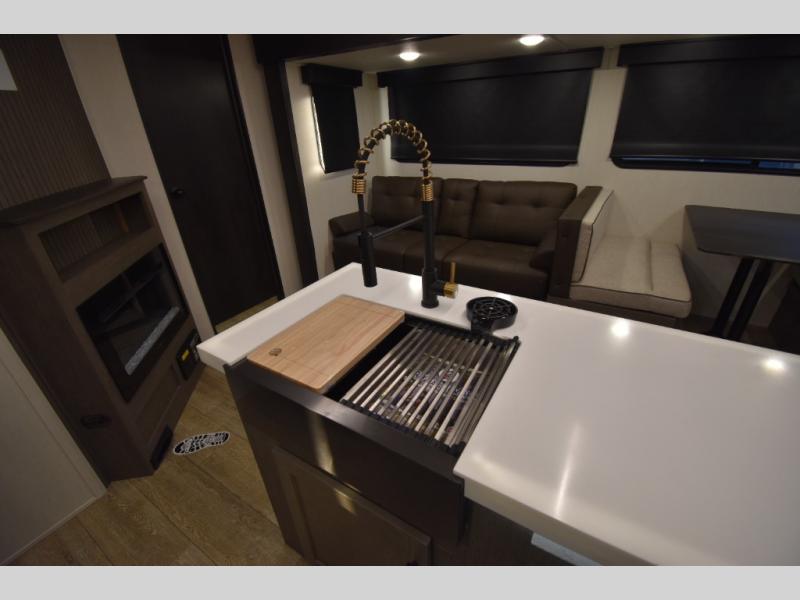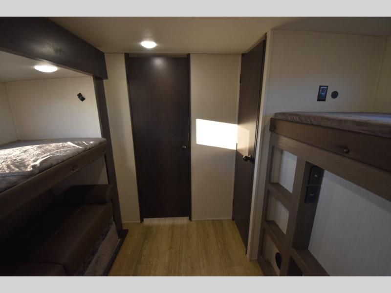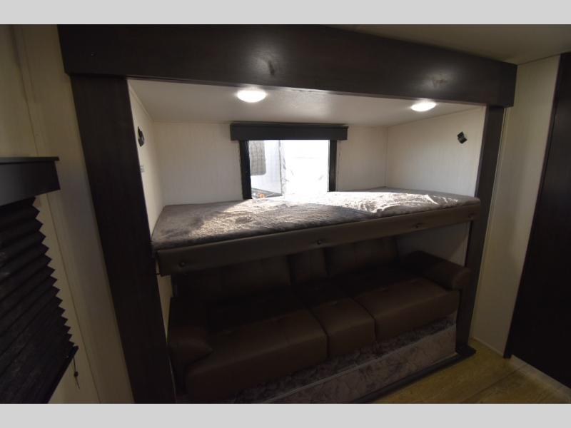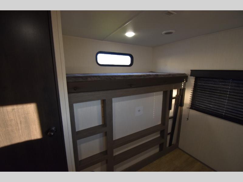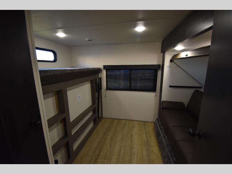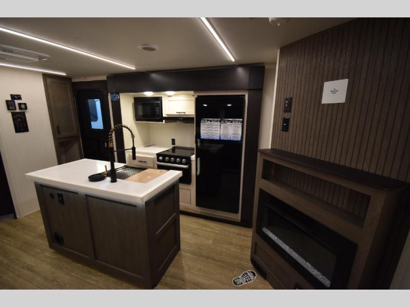 Load up your clothes, food, and outdoor gear to enjoy a long weekend away from the city in this travel trailer! There are triple slide outs, a private bunkhouse with a half bathroom with a second exterior entry/door for convenience, plus an outside kitchen, complete with ice! The bunkhouse also has two bunks, a jackknife sofa and a trundle bed, plus a slide out for more interior floor space. The main living and kitchen area is spacious as well with two opposing slides, a kitchen island with a large sink, a pantry, plus a cozy fireplace. The full walk-through bathroom allows double access, and the front bedroom allows you to sleep like royalty.